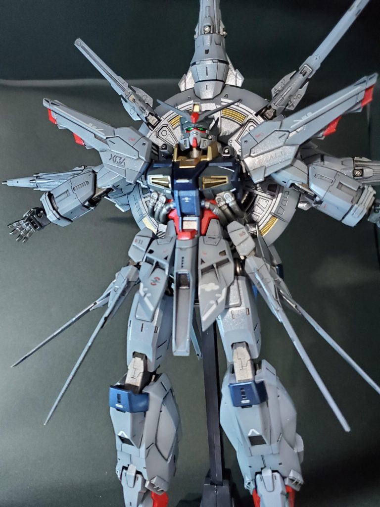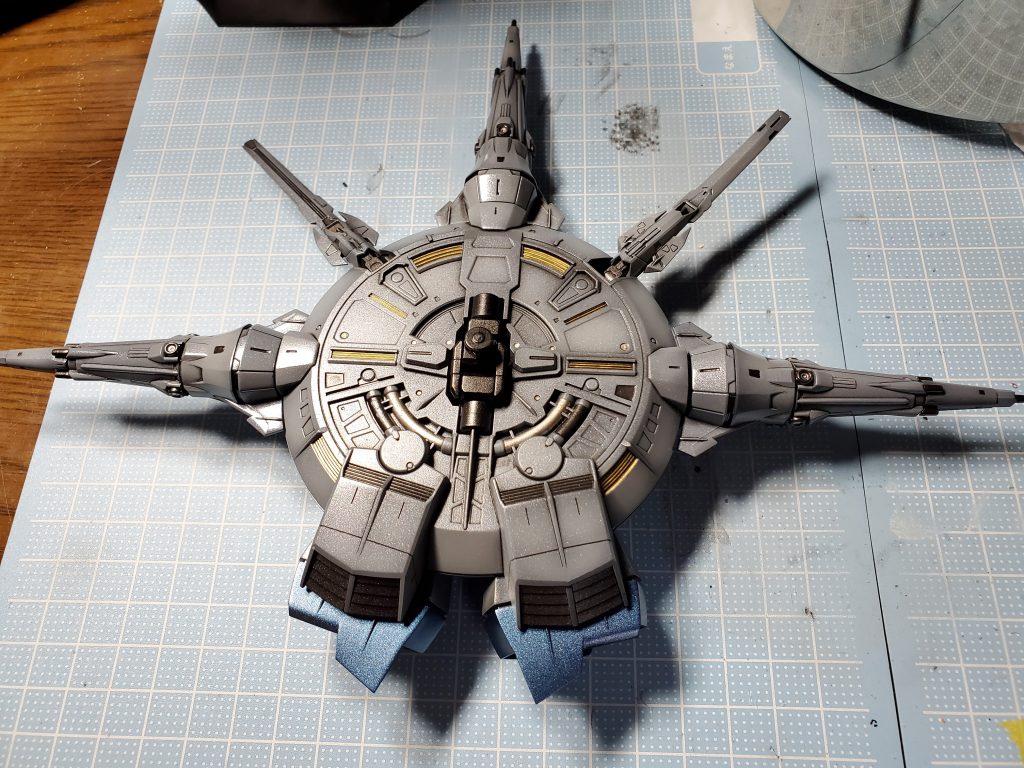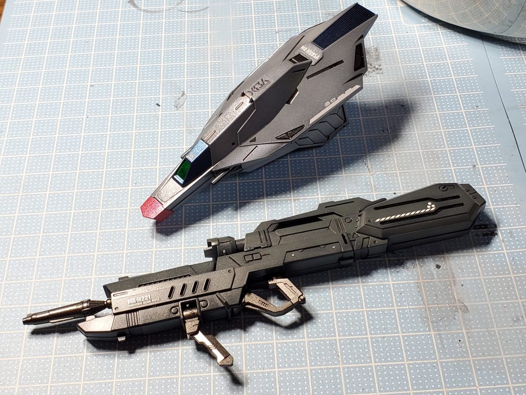 塗料は過去の作例を参考にさせて頂き、赤・青・金をメタリック塗装で。メインはニュートラルグレーをグラデーションで吹いてパール塗装、ツヤ有り、ウェザリングカラーの黒で調整しました。