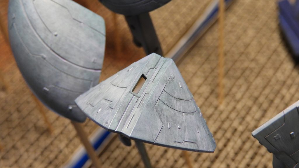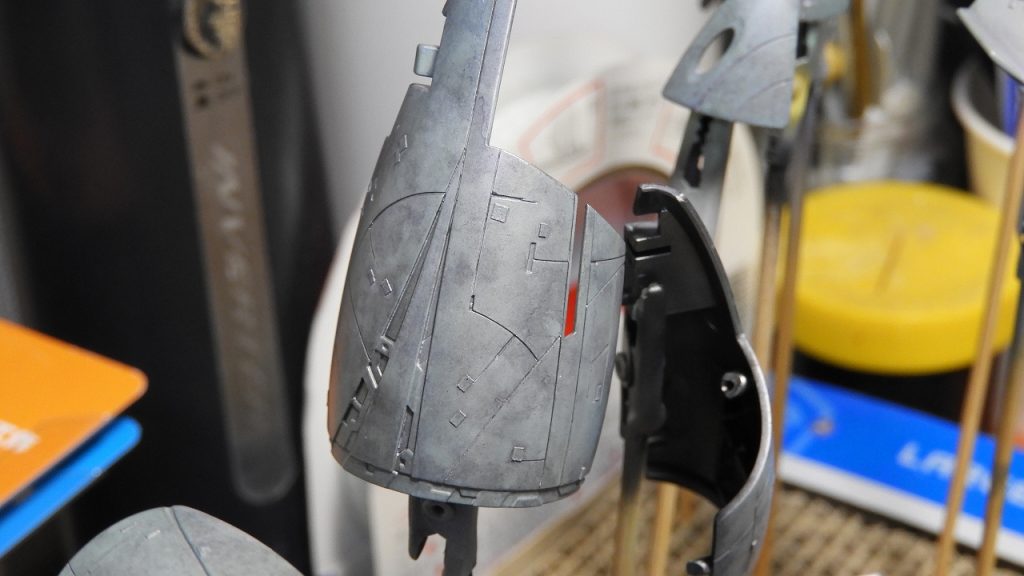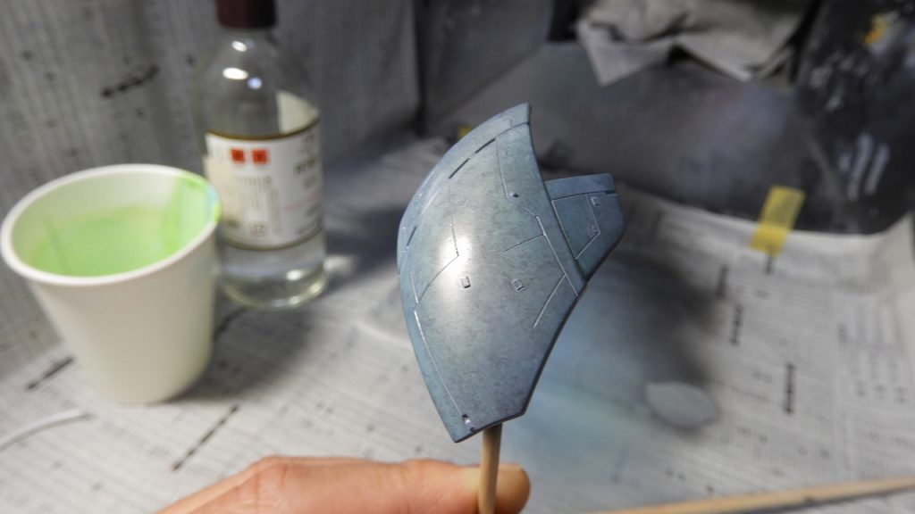 中途半端に剥がされて、いつまでも完治しない瘡蓋や皮膚炎・でき物をイメージした「パネルライン」ではなく「不完全な再生痕」なつもりのディティールです、塗装は8番シルバーを下地にシルバーチタンクリア金の上澄みウルトラマリンミク蛍光薄グリーンだいたいそんな感じな色を塗って、エナメルの煤で斑模様を描きこみ、プリズムパープルグリーンを塗って、その上から金の上澄み(緑しょう?)をさかねて更に艶消しと蛍光ブルーグリーンを混ぜた物を吹いてから、油彩で薄紫をフィルタリングです。艶消しには本来添加剤である「フラットベースなめらかスムース」をそのまま5倍希釈で使用。