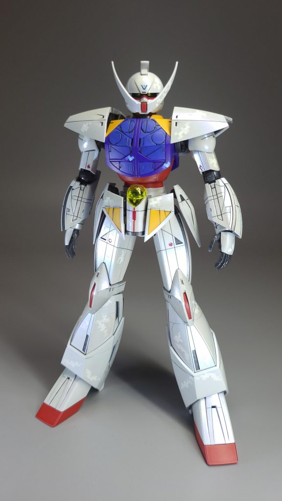 偏光パールを吹いているため光の当っている部分が美しく反射しています。∀ガンダムはシルエットも美しく光沢系の塗装にして良かったと思っています