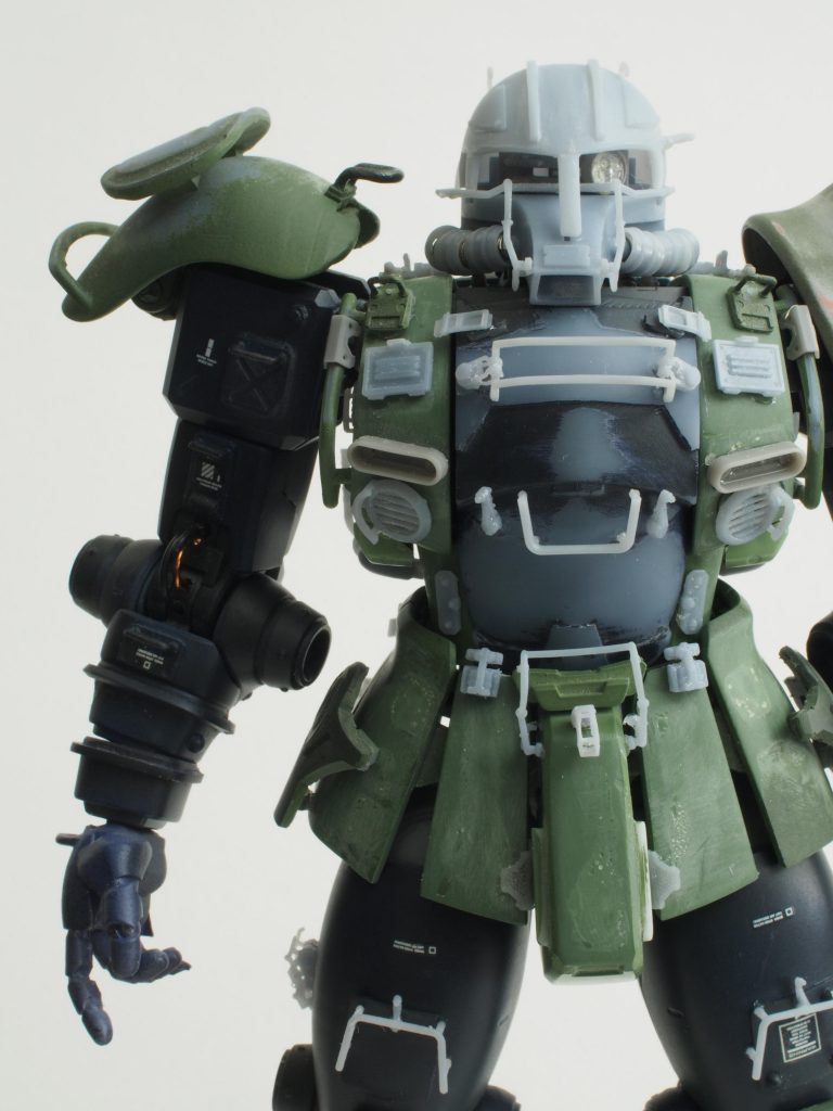 後の高機動型ザク06Rのバックパックの原型になるイメージで、機材がむき出しに配置されている状態を再現しました。
