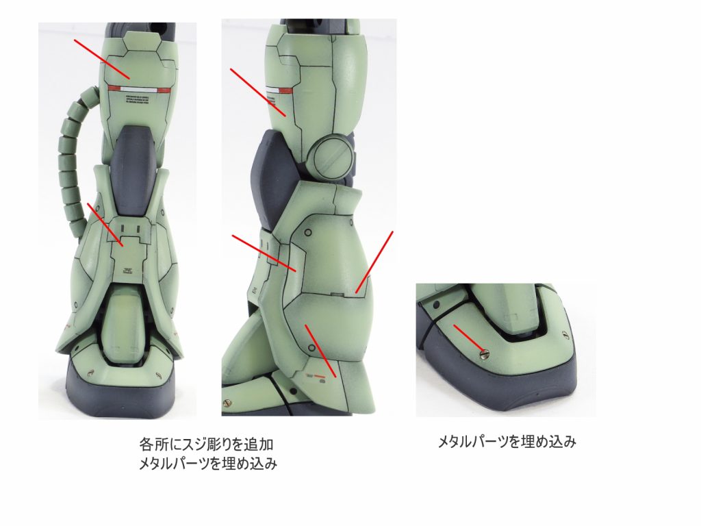 各所にスジボリにて情報量を追加して塗分け 太ももをパテにて幅…