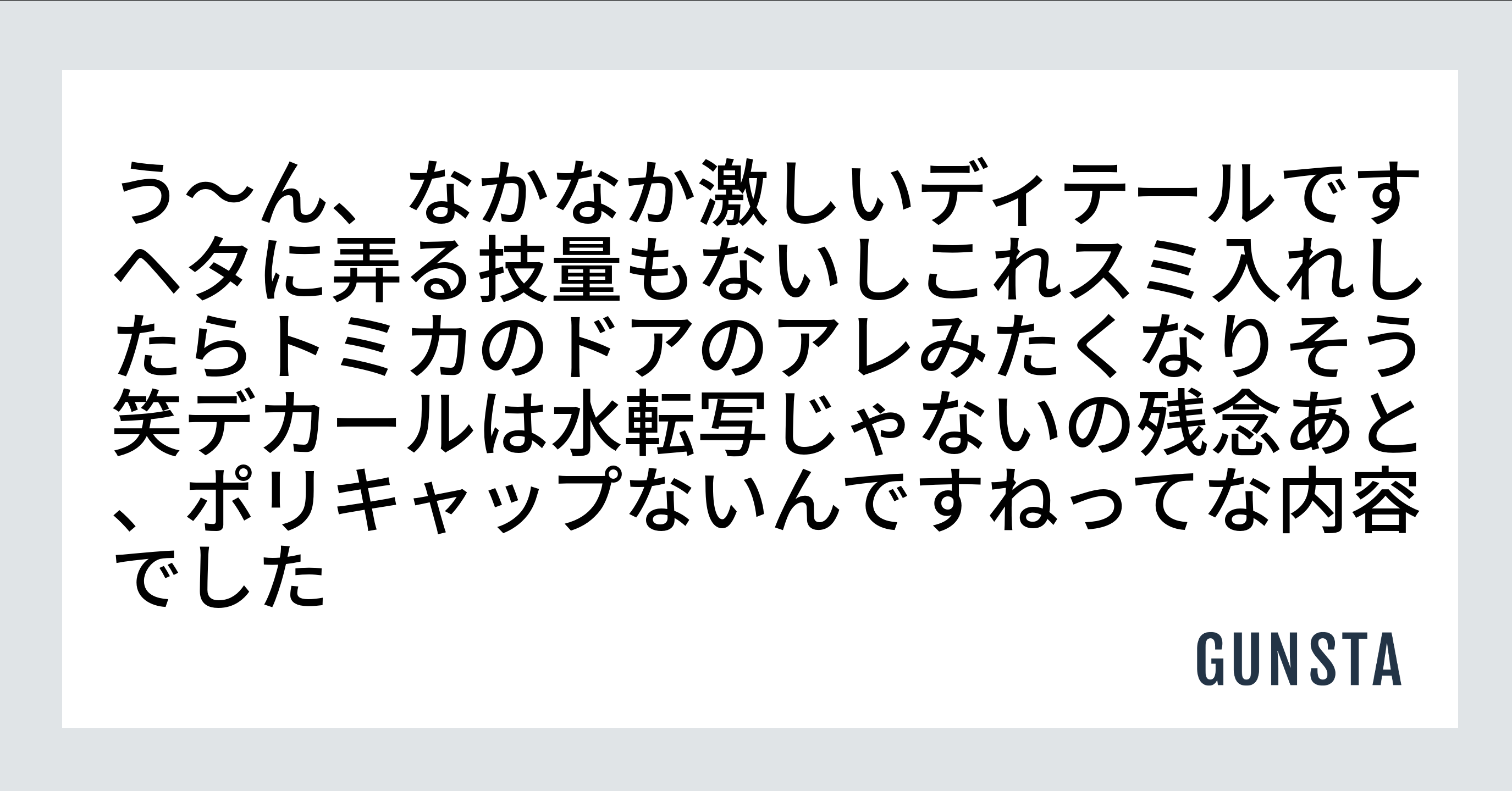 誠一 2024.10/19更新 88 12 いいねしたモデラー(12) 4 作品を共有 う〜ん、 なかなか激しいディテールです ヘタに弄る技量もないし これスミ入れしたらトミカのドアの アレみたくなりそう笑 デカールは水転写じゃないの残念 あと、ポリキャップないんですね ってな内容でした つぶやき コメント コメントをして応援しよう コメントにはログインが必要です 猩々(しょうじょう) 1年前 うわぁ…😅 ホントにスゴいディティールですね! 私はMG派なので本作はスルーでしたが、コレはなかなかの…。 仕上げの表現は、 方向性というか、切り口というか、検討が必要な気がしますね! 誠一さんなら楽勝でしょうか😊 誠一 1年前 私にはムリです コレはストレート組みが吉です笑 パテの歌声 1年前 コメントさせて頂きます。 トミカのドアのアレ! ちょっと受けました。 デカールも水転写じゃないのが残念ですね~ 本日、争奪戦に参加できなかったのでレビュー参考になりました、ありがとうございます。 誠一 1年前 コメントありがとうございます仮組みしてみましたので観てみて下さい 誠一 いらっしゃいませ〜 世に無い物を創りたがる変なおっさん ファースト世代 MSIGLOO、復讐のレクイエム、ゲームOP等CGモノが好物 老眼、色盲、ウフフフフ🤭 誠一さんがお薦めする作品 RTX-440-B 陸戦強襲型ガンタンク B型 復讐のレクイ… ZAKU TANK 復讐のレクイエム MS-06R-2 第603技術試験隊所属機 4 機動浮遊機 PVN.4/3 WAPPA ワッパ 過去作のワッパですが、脚にシリンダーシャフト追加工事ついでに… 16 RTX-440-B 陸戦強襲型ガンタンク B型 復讐のレクイ… レクイエム ガンタンク完成しました♪ 作成期間2か月、公式C… 6 RB-79N FISHEYE フィッシュアイ 過去作okとの事ですので 紅白ガンプラ合戦に参加させて頂きま… 12 ZAKU TANK 復讐のレクイエム レクイエム ザクタンク出来ました。 作成期間1カ月、公式CG… 誠一さんのページ