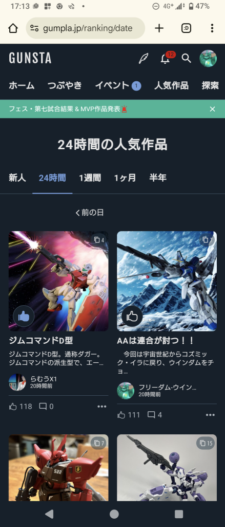 フリーダム-ウイン… 2025.06/13更新 まさかの人気作品!? 104 24 いいねしたモデラー(24) 8 作品を共有 突然のガンスタ公式様からのお知らせ 「作品が24時間の人気作品ページで2位になりました」 数多おられる古兵・猛者の作品の中で、私のような底辺モデラーの作品にこのような栄誉を頂けるとは! 今宵はお赤飯を炊こう…間に合わないのでスーパーで買います ささげを水に浸すのに一晩かかるしね ウインダム君にも朗報を伝えたいと思います つぶやき コメント コメントをして応援しよう コメントにはログインが必要です 強化しすぎたマシュマロ 6か月前 こんばんは~。 コメント失礼します❗ おめでとうございます‼️ 努力が認められた証ですね(gundam-kao6) ますますのご活躍、期待しております‼️ フリーダム-ウイング 6か月前 ありがとうございます 皆様の作品を見て少しでもリアリティが出れば、と作った物がまた皆様に見て頂けて嬉しい限りです tom_s0079 6か月前 熱意と楽しさはちゃんと周りに伝わるのですよね。私も皆様を見習い長年籠り切りだった自分の制作態度を変えてみようとここに参加しました。おめでとうございます。(*’▽’) フリーダム-ウイング 6か月前 ありがとうございます 少しでも楽しんで頂けたら、望外の喜びです 与一 6か月前 良かったですね🩷 流石‼️良く出来ていましたし、当然です🥰👍👍👍 目的がそこでは無いにしろ、努力が認められていると言う事です🤩👍 今後も良き作品お願い致しますm(_ _)m🥰 フリーダム-ウイング 6か月前 ありがとうございます 本人は積み解消の為、思い切りやっただけなんですが 皆様に見て頂けたおかげですね ありがとうございます いつもコメントありがとうございます 6か月前 おめでとうございます!(gundam-kao6) フリーダム-ウイング 6か月前 ありがとうございます 見てくれた皆様のおかげです フリーダム-ウイング はじめまして ファースト、ゼータ、ダブルゼータ、08小隊、0083、V、G、W、種、種運命、種自由などガンダム好きです 特に種シリーズにゾッコン ストライクガンダムやフリーダムガンダムが大好きです シーマガラハウやヒルダハーケンなど勝ち気な女性キャラも好き フリーダム-ウイングさんがお薦めする作品 ガンダムコマンドー 闇夜の対峙 実録! 密林の絶望!! ジオンの中で輝いて! アナベル・ガトー専用ゲルググ 最終決戦!! 9 カッコいいMSを作りたい!〜第三バトンをつなぐ〜 不肖、このフリーダムウイング バレーボールおじさん殿から「… 9 バスターガンダム イザーク・ジュール「ディアッカ!先に出るぞ! イザーク… 9 デュエルガンダムアサルトシュラウド イザーク・ジュール「これが地球の日差し、風、気温、そして… 9 舞い降りる剣 グゥルに乗ったジンの銃口がアークエンジェルの艦橋に向けられ… フリーダム-ウイン…さんのページ