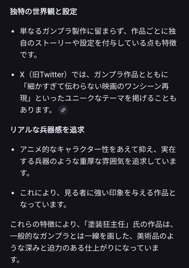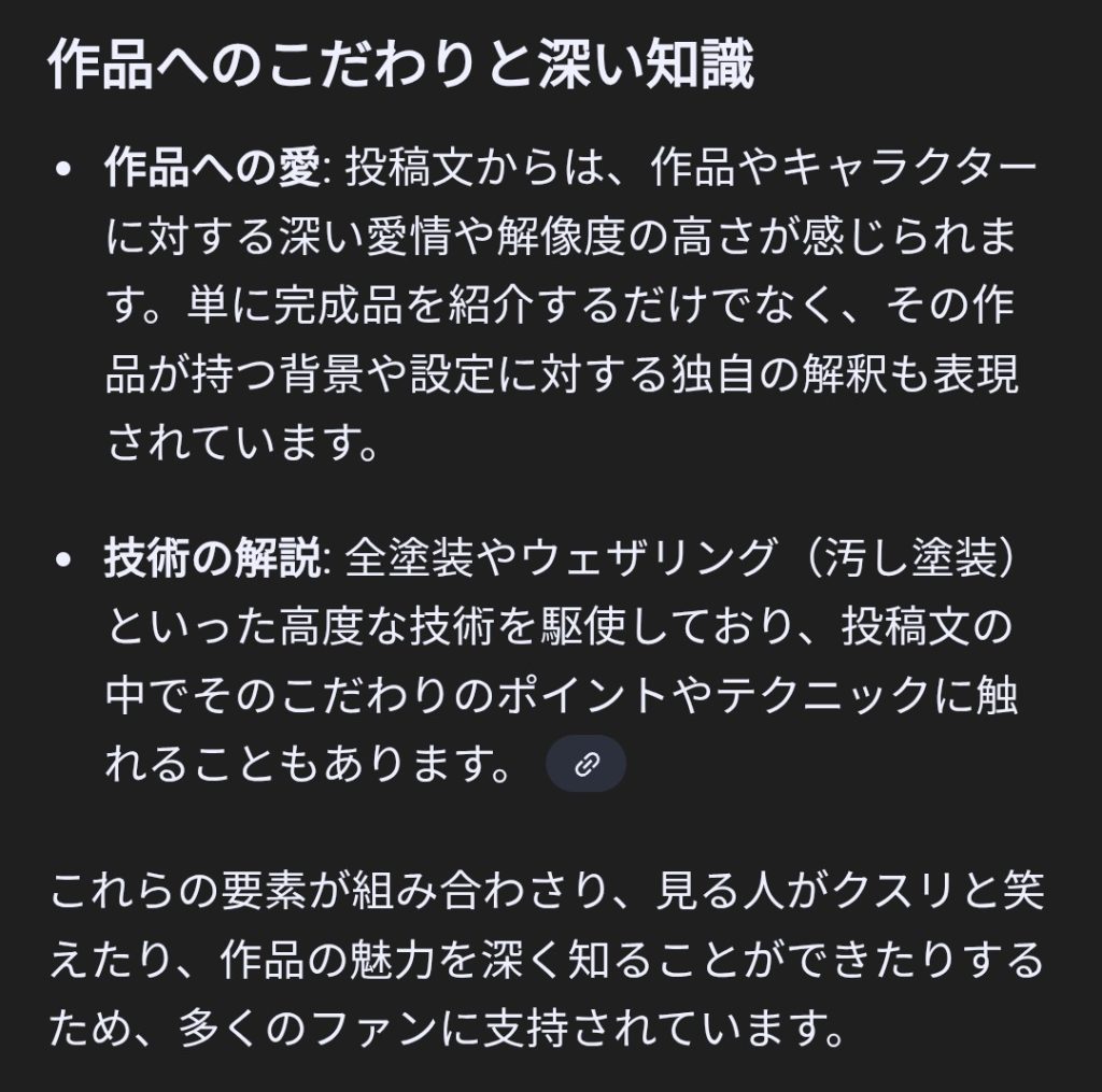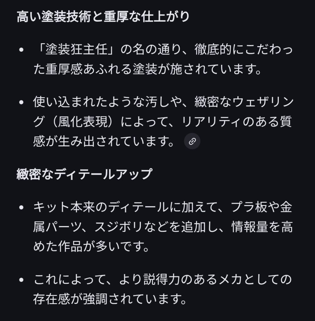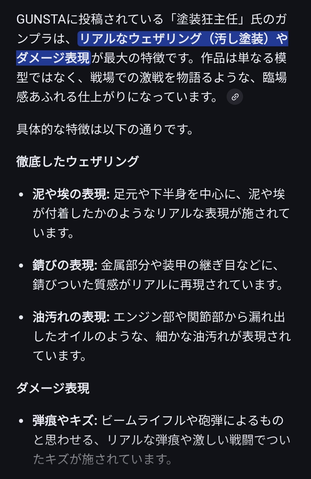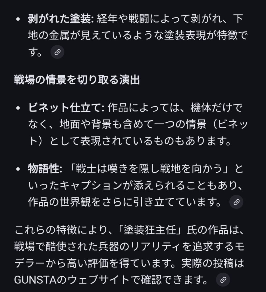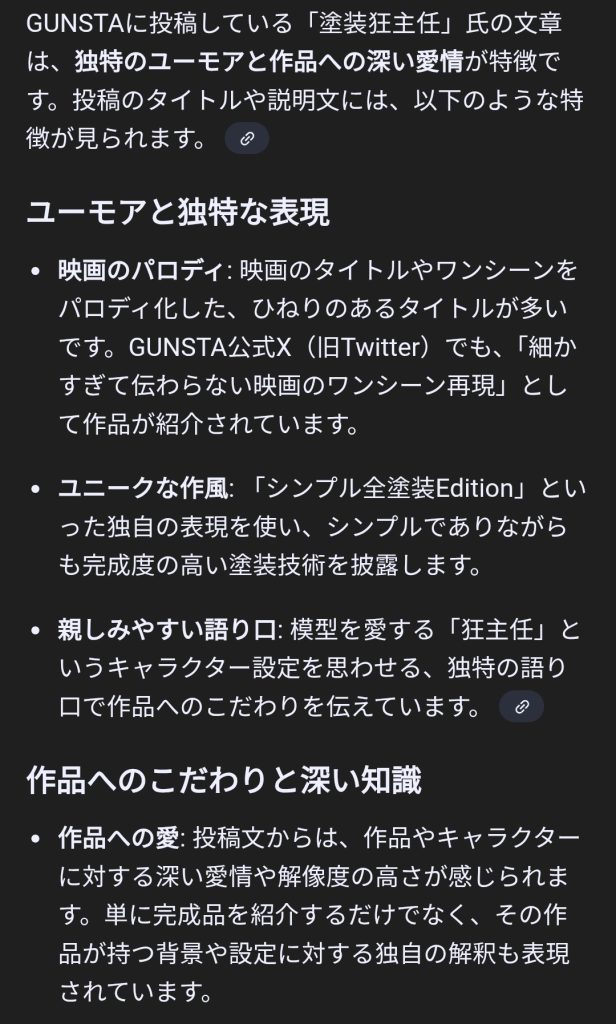 塗装狂主任 2025.10/07更新 特徴 56 12 いいねしたモデラー(12) 0 作品を共有 らしいな つぶやき コメント コメントをして応援しよう コメントにはログインが必要です 塗装狂主任 愛してるんだぁぁぁぁぁぁ君たちをぉぉぉぉぉぉぉぉぉぉぉぉ!!!!!!!!!!!!!HAHAHAHAHAHA!!!!!!!!!!!!!!!!!!!!!!!!!! 面白いが原動力のジオニスト 塗装歴2年 塗装狂主任さんがお薦めする作品 ガンダムヘビーアームズ 玩具箱の中のEndless walt… ザクIIS型 スナイパータイプ RG Hi-νガンダム スプリッター迷彩 ガンダムバルバトス・ケーニヒアルト 12 百作品投稿記念 歴戦のMS制作講座 アイザック編 経緯 男はある日疑念を抱く 自分の汚し方に一定の… 4 ジャンク再生 ガンダムサンドロック改 EW 予告 性懲りもなくあの中古屋へと赴いた男 平日で… 5 ジャンク再生 ガンダムヘビーアームズ改 EW 予告 再びの僥倖を求めて また中古屋へと赴いた男… 2 細かすぎて伝わらない映画のワンシーン再現 ゾンビ(1978) 塗装狂主任さんのページ