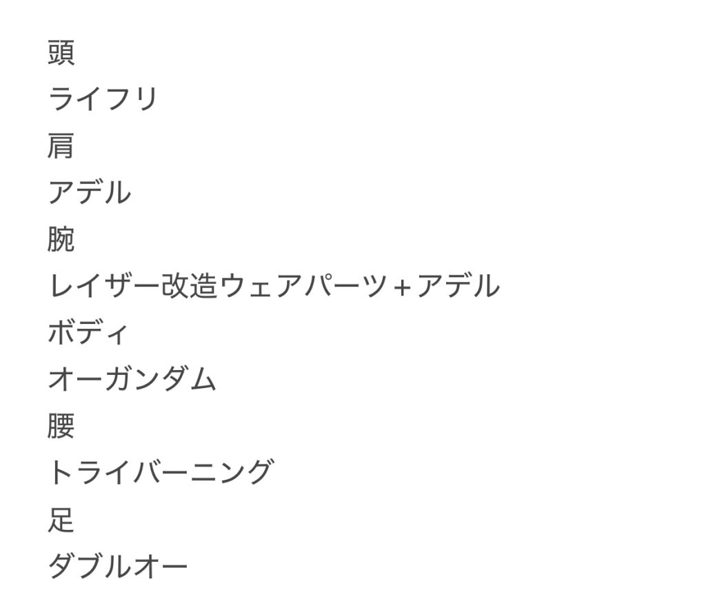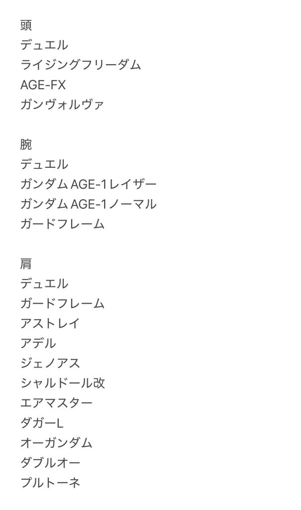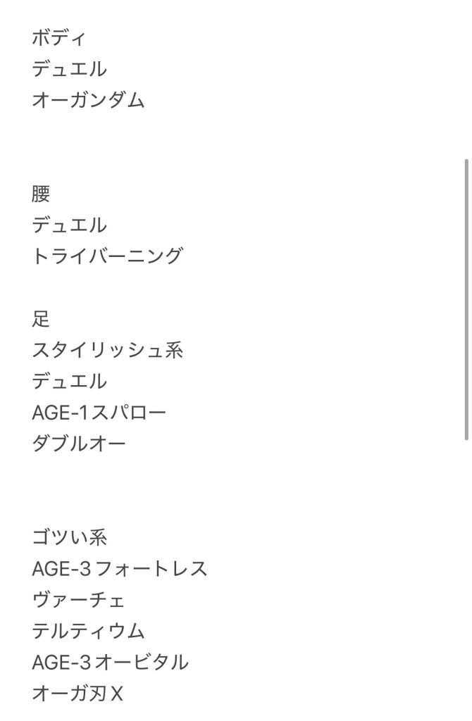 アルト 2025.10/22更新 いくつもの制作を超えて 24 0 いいねしたモデラー(0) 0 作品を共有 自分の好きだなーってなったパーツを最近部位毎にリストアップするようにしてて、特に好みが顕著だなと思うのが肩パーツ。 ここに無いのだとヴィクトリーは好きだけどV2ABはあんまり……って感じ。 あとバスターも好き。ブルーディスティニーとかジム系も良いよね。箱型!って感じの肩が好き。三角形?のヒロイックなのよりこっち派なんだと気づき始めている。 なので各部位のキメラをすれば自分の理想ガンダムになるのでは?と思ってるのでそのうちやりたい。 つぶやき コメント コメントをして応援しよう コメントにはログインが必要です アルト アルトです。 2020年からなんか指先を動かしたくなってちまちま作り始めました。 ガンダムは昔種を観たのと幼少期にGガンとW、∀観てた記憶があるくらいで最近やっとビルドシリーズは観たという宇宙世紀全く知らないガンダムにわかです、ごめんなさい。 コアガンダム改造がお気に入りです。 17 ガンダムAGE-03ブレイヴァー オリジナルビルドシリーズ「ガンダムビルドユナイト」より主人公… 15 嫦娥ガンダム終式 オリジナルビルドシリーズ「ガンダムビルドユナイト」よりライバ… 15 クロスボンドガンダム 思いついたのとたまたまジャンクで安くなってたのとでやってしま… 10 アメノマヒトツ嵐 オリジナルビルド作品シリーズより、GBF「ブラック・ムーン」… アルトさんのページ