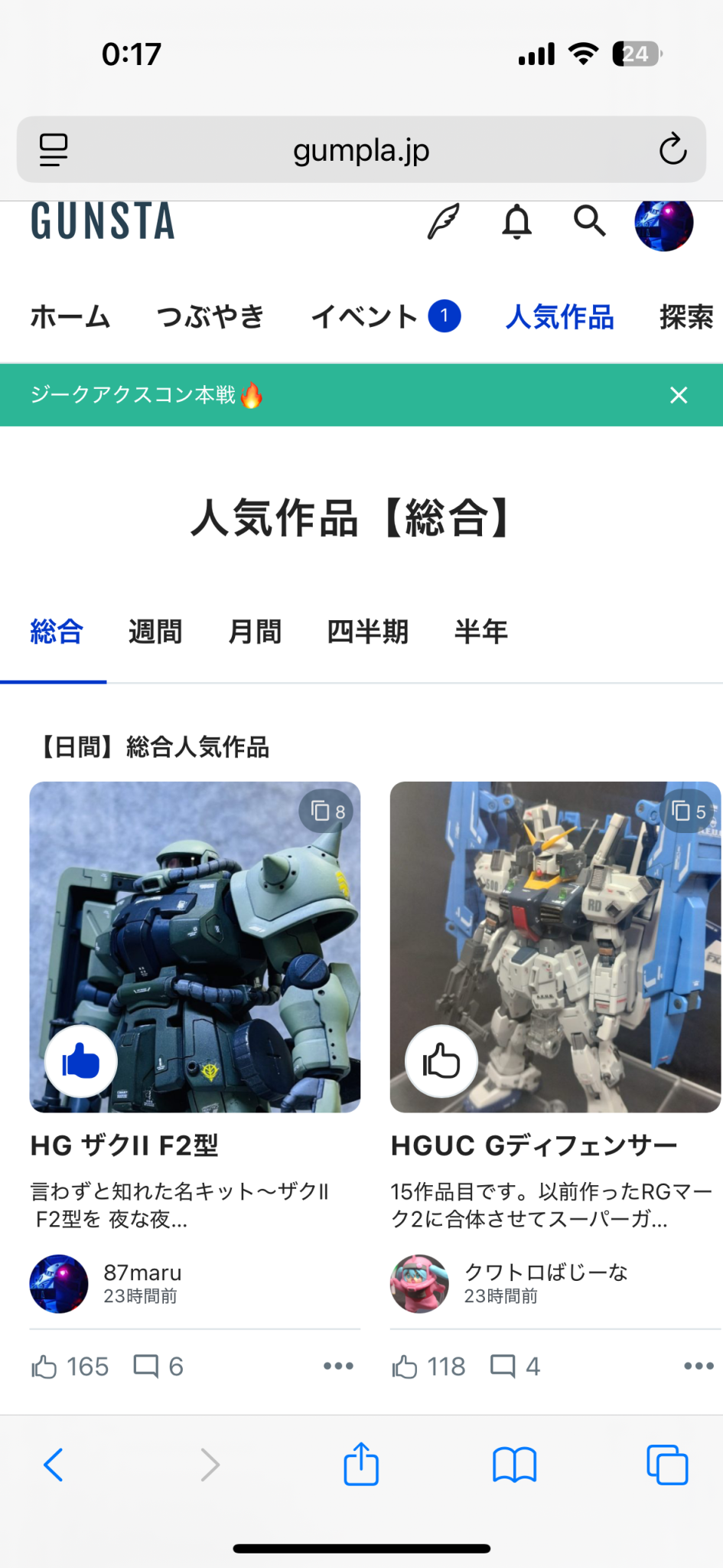 87maru 2025.10/23更新 人気作品に選ばれてた〜😆🎵🎵 32 13 いいねしたモデラー(13) 2 作品を共有 24Hの人気作品 一位に選ばれてて✨✨ 24時間でもめちゃくちゃびっくり😆🎵 ご覧いただいた皆様のお陰です🥹 ありがとうございました🙇♂️ つぶやき コメント コメントをして応援しよう コメントにはログインが必要です アツボー 2日前 凄く格好良いので納得です。工作も塗装も丁寧で、見事な作品ですから👍 87maru 2日前 ありがとうございます🙇♂️ 筋彫り等細かくて集中力が続かず、逆にゆる〜りと数ヶ月掛けて🛠️しました😅 これを励みにまた頑張ります💪 87maru 1st世代で、HGメインです。 荒隠しで汚し過ぎちゃいますが(^^;; 宜しくお願いします。 過去作も混ざってます( ; ; ) 87maruさんがお薦めする作品 旧キット ドダイYS グフ 発進待機❗️ ランバ・ラル グフ 格納庫 ディスプレイ HG ガンキャノン REVIVE 108 109 高機動試作型ザク "アイナザク" 格納庫 ディスプレイ 8 HG ザクII F2型 言わずと知れた名キット〜ザクⅡ F2型を 夜な夜… 7 MSV フルアーマーガンダム 旧キット ミキシング HGガンダムと旧キット フルアーマーガンダムのミキシングです… 9 MSV ジムスナイパーカスタム 旧キット ミキシング HGジムと旧キットジムスナイパーカスタムのミキシングです🛠️ 11 ジャブロー降下成功! 前作ドダイYS🛠️で疲れたんで〜少し休憩☕️ 過去作でお遊び… 87maruさんのページ