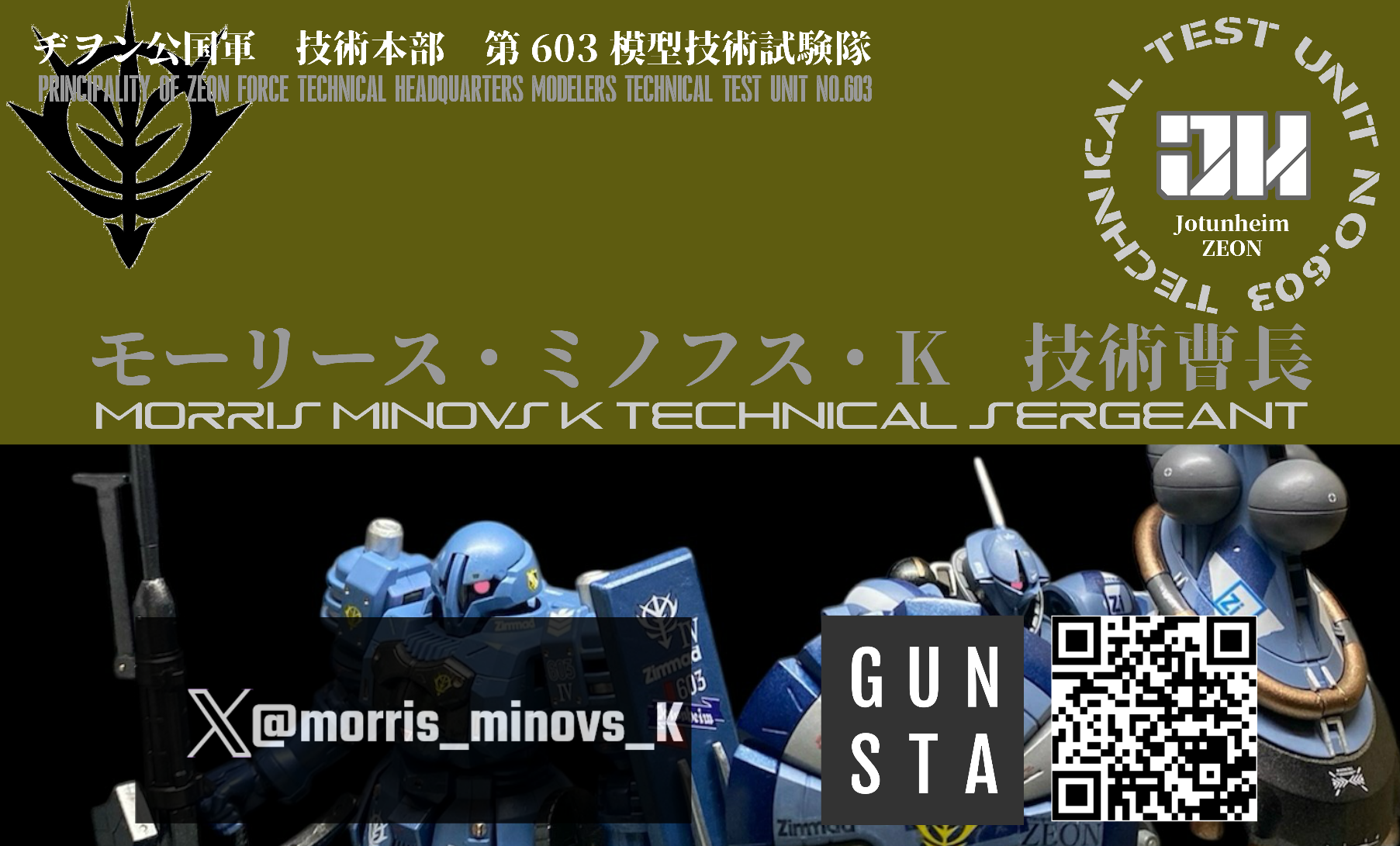 モーリース・ミノフ… 2025.10/30更新 アイコン変えました! 8 16 いいねしたモデラー(16) 0 作品を共有 モデラー名刺を制作した際に部隊章っぽいマークをデザインしたので、公式の603部隊章から変更してみました! アイコンがガラっと変わったので、「どちら様?」って思われるかも知れませが、変わらずよろしくお願いします❗️ つぶやき コメント コメントをして応援しよう コメントにはログインが必要です モーリース・ミノフス・K 技術曹長 UC.60生まれ ジオン第四工科大卒 1年戦争時 工兵の不足により工業科学生でありながら学徒動員・徴用され第603技術試験隊においてオリヴァー・マイ技術中尉付きのメカニック見習いとして、様々な機体に携わり無事終戦まで生き残る。これは、彼の肉眼に映った兵器たちの記録である。 主に微改造・全塗装で仕上げている初心者モデラーです。 ガンプラの取説にある機体解説やショートストーリーが好きで、それに寄せた文章を考えてみました。 お目汚しですが、よろしくお願いします。 モーリース・ミノフス・K 技術曹長さんがお薦めする作品 XVX-12 GUNDARM LFRITH SYLPHIDE EDM-GBC GUNDVÖLVA 影忍 PRAN404E Tiefer Stürmer XVX-16 + SCV-04 Pegasus Knight… 17 MS-09RN RICK-DOM schneeweiss (… フラナガンスクール─── NT研究とサイコミュ理論の提唱者で… 17 EMS-15S/H DUVAL'S GYAN SEIJI … 宇宙世紀0079年── のちに一年戦争とよばれる大戦のさなか… 17 YMS-07J/B GOUF UC0079年9月 スペースノイドの自らの故郷である人口の大… 17 g MS-Ω +AMX-004 GQubeleyX 久しぶりに夢を見た。 不思議な夢。 夢の中での私はキラキラと… モーリース・ミノフ…さんのページ