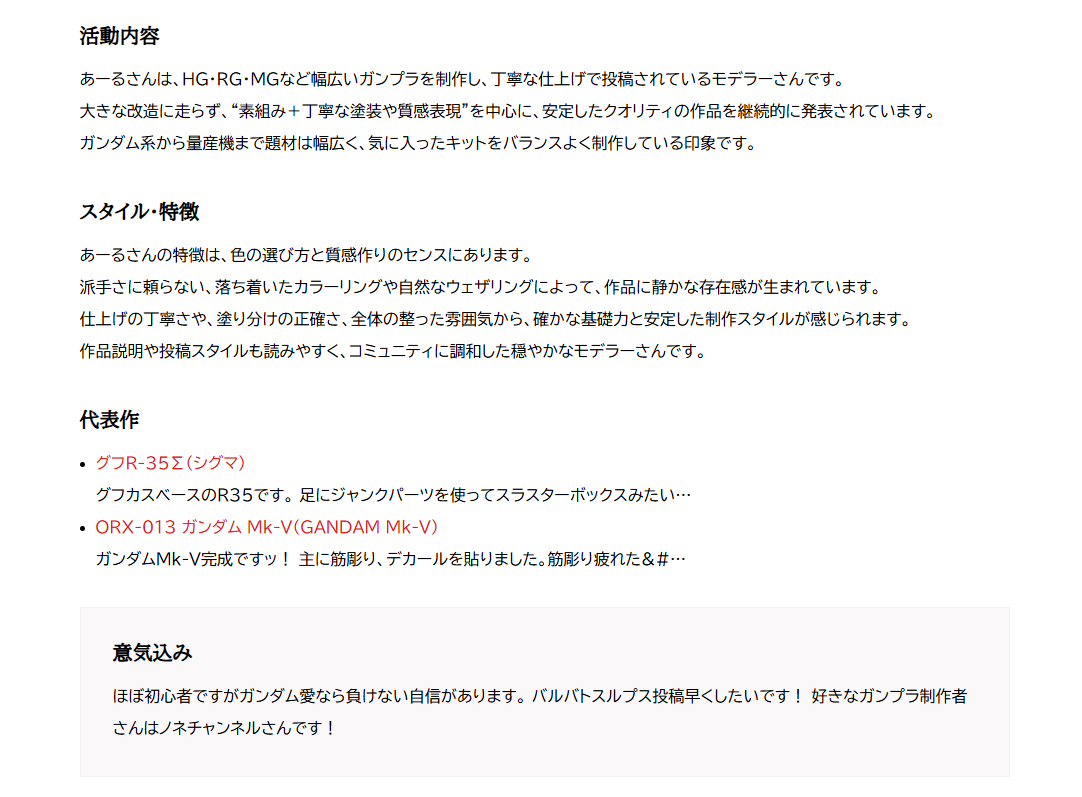 あーる 2025.12/02更新 紅白の選手紹介出てたんやけどwめちゃうれしい 16 4 いいねしたモデラー(4) 0 作品を共有 紅白の選手紹介見て一層気合が入りました! がんばるZOY! つぶやき コメント コメントをして応援しよう コメントにはログインが必要です あーる 初心者の鉄華団大好きマンです。 最近よくハマってるガンダムはバルバトス系です あーるさんがお薦めする作品 グフR-35Σ(シグマ) 4 フルメカニクスガンダムバルバトスルプス お久しぶりです。城戸です。いまは名前変えてあーると名乗ってい… 4 グフR-35Σ(シグマ) グフカスベースのR35です。 足にジャンクパーツを使ってスラ… 6 シルヴァヴァレト(試作タイプ) シルヴァヴァレト完成です! なんか説明すんのめんどいので適当… 6 ORX-013 ガンダム Mk-V(GANDAM Mk-V) ガンダムMk-V完成ですッ! 主に筋彫り、デカールを貼りまし… あーるさんのページ