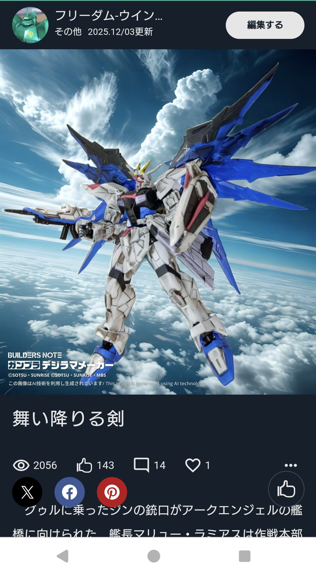 フリーダム-ウイン… 2025.12/06更新 おかげさまで… 16 22 いいねしたモデラー(22) 0 作品を共有 なんと2000を越える方々に見ていただきました ありがとうございます 私の拙い作品を、多くの方々に見てもらえて光栄です 重ね重ねありがとうございます こんなに嬉しいことはない! つぶやき コメント コメントをして応援しよう コメントにはログインが必要です フリーダム-ウイング はじめまして ファースト、ゼータ、ダブルゼータ、08小隊、0083、V、G、W、種、種運命、種自由などガンダム好きです 特に種シリーズにゾッコン ストライクガンダムやフリーダムガンダムが大好きです シーマガラハウやヒルダハーケンなど勝ち気な女性キャラも好き フリーダム-ウイングさんがお薦めする作品 ガンダムコマンドー 闇夜の対峙 実録! 密林の絶望!! ジオンの中で輝いて! アナベル・ガトー専用ゲルググ 最終決戦!! 9 デュエルガンダムアサルトシュラウド イザーク・ジュール「これが地球の日差し、風、気温、そして… 9 舞い降りる剣 グゥルに乗ったジンの銃口がアークエンジェルの艦橋に向けられ… 9 キラーーー!! お前を討つ! Gフレーム12のイージスガンダムを簡単仕上げ! フレーム… 6 追撃 バニング「ウラキ!キース! 戦いはお前たちがいつまでもピーピ… フリーダム-ウイン…さんのページ