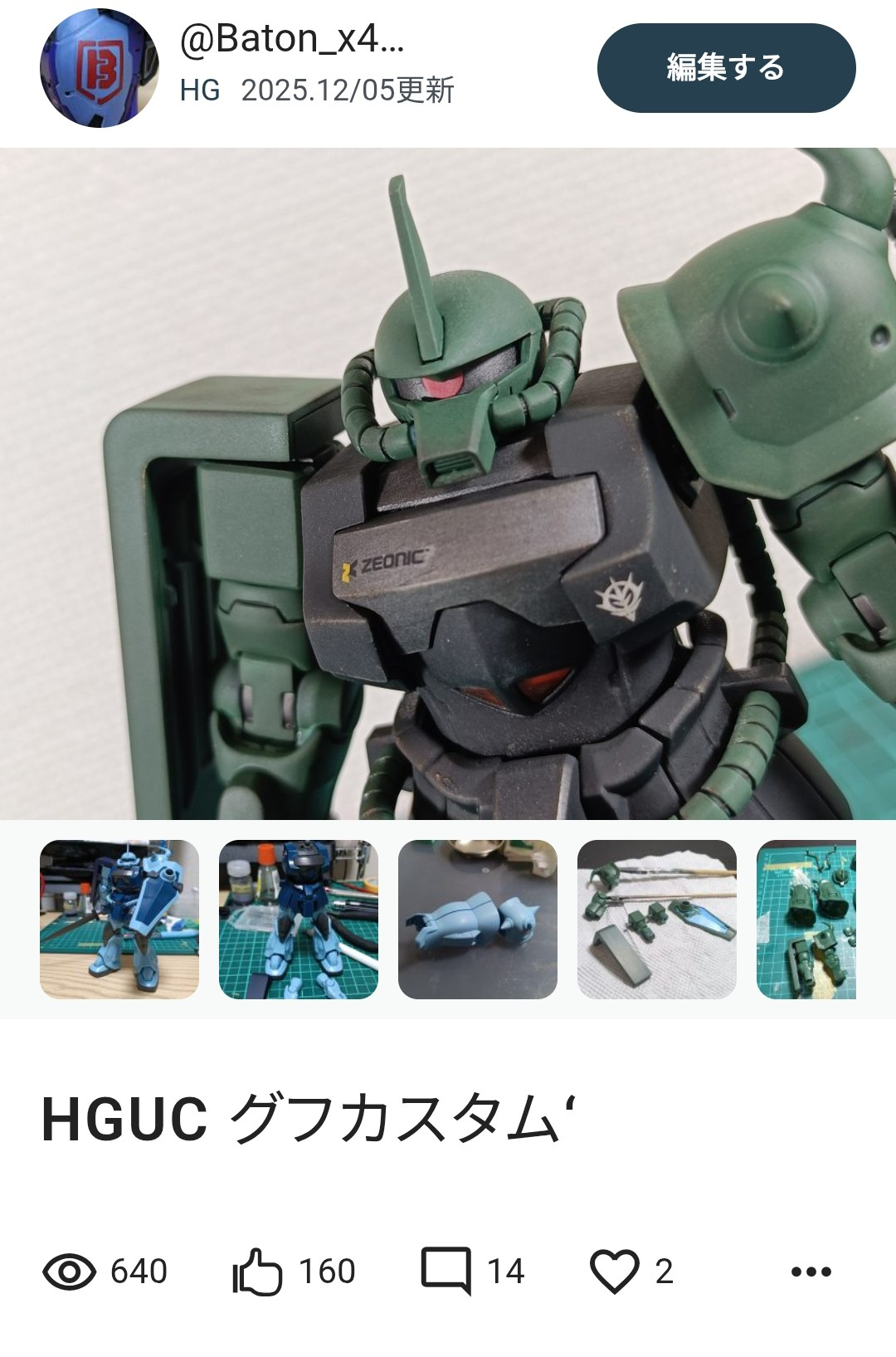 @Baton_x4… 2025.12/06更新 モチベ爆上げの翁 24 17 いいねしたモデラー(17) 0 作品を共有 ありがてぇ…ありがてぇぇ…(zaku-kao9) ホンッとに…!頑張ります…!! つぶやき コメント コメントをして応援しよう コメントにはログインが必要です @Baton_x42s Batonと申します。 まだまだ技術不足でやりたいことが上手く行かなかったりしますが、楽しく作って行ってます。 他作品とのクロスオーバーや劇中のオマージュをメインに、たまにオリジナルがぽっと出てきます。 よろしくお願いします。 @Baton_x42sさんがお薦めする作品 HG シャア専用高機動型ザクII ビルドリアル風 PF-78-3A アメイジングレッドウォーリア MBF-02fr ストライクフランベルジュ HGUC ジムストライカー 8 HGUC グフカスタム‘ HGUCグフカスタムの筆塗り全塗装になります。 ちょこっとだ… 6 【ガンダムアッセンブル】ザクⅡ Batonの筆塗りやったるぜ!二作目は前回に引き続きガンダム… 5 【ガンダムアッセンブル】シャア専用ザクⅡ ガンダムアッセンブルからシャア専用ザクⅡの、筆塗り全塗装にな… 4 【供養シリーズ】HGデスティニーガンダム 前回に引き続き供養シリーズとなります。第2回は学生時代に作っ… @Baton_x4…さんのページ