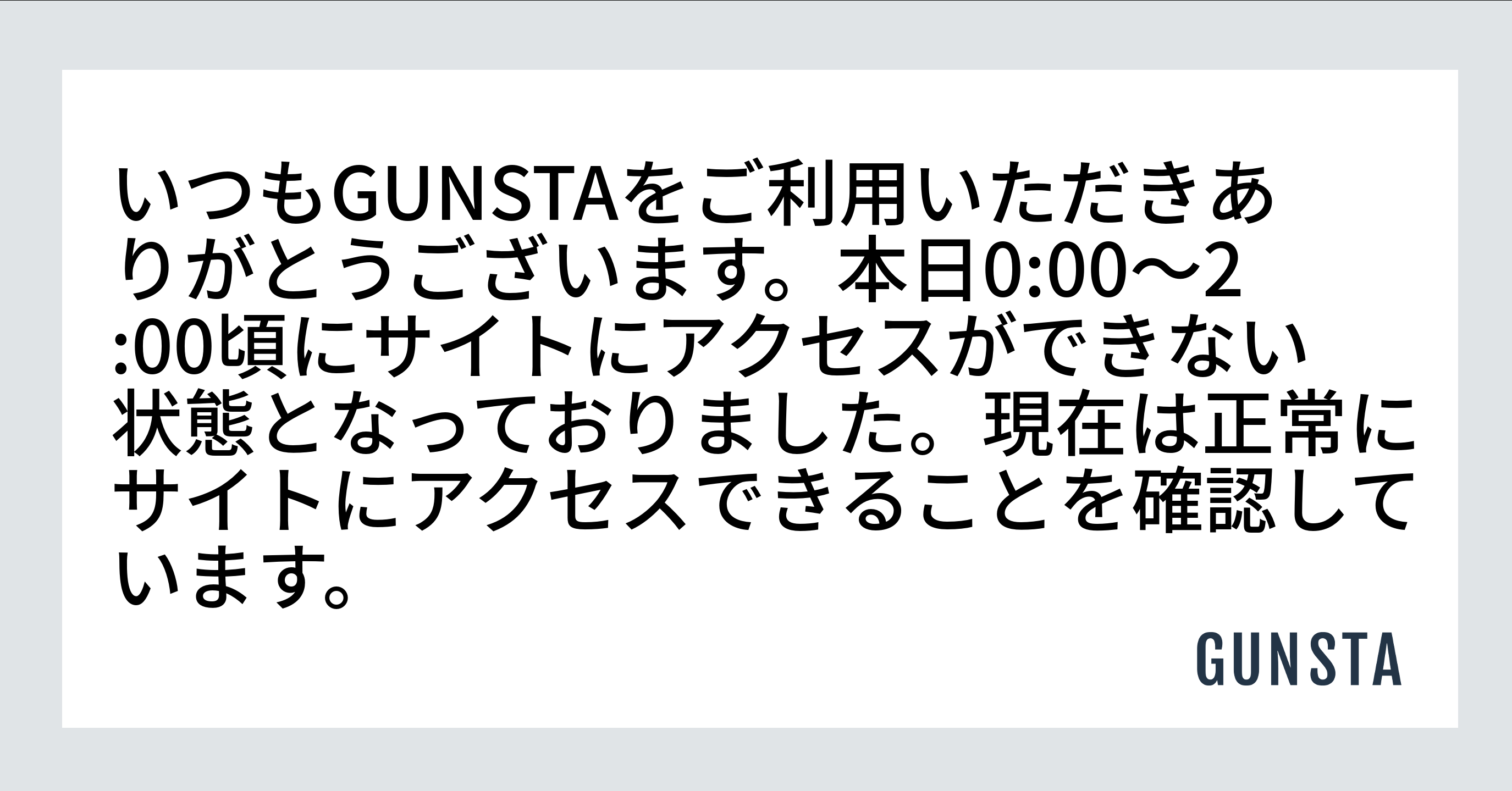 GUNSTA 2026.02/01更新 サーバー不具合(復旧済) 16 11 いいねしたモデラー(11) 1 作品を共有 いつもGUNSTAをご利用いただきありがとうございます。 本日0:00〜2:00頃にサイトにアクセスができない状態となっておりました。 現在は正常にサイトにアクセスできることを確認しています。 ご迷惑をお掛けして申し訳ございません。 引き続きGUNSTAをよろしくお願いいたします。 お知らせ つぶやき コメント コメントをして応援しよう コメントにはログインが必要です キャンプラ 47分前 GUNSTAさん、こんにちは!いつも不具合等への迅速な対応ありがとうございます。 おかげさまで楽しくプラモデルの投稿や交流を楽しむことが出来ています。 サイト運営や楽しい企画の催しなど、いつも本当にありがとうございます😆💫 GUNSTA GUNSTAです。 GUNSTAは自分で作ったガンプラ作品を投稿してシェアできるガンダム関連専門の投稿サイトになっています。興味がある方は是非お気軽にご投稿ください。 モデラーさんが少しでもハッピーになれるようなサイトを一生掛けて目指します! https://gumpla.jp GUNSTAさんがお薦めする作品 1 アスタロトシンメトリ 友達からの提案で鉄血のオルフェンズのアスタロトのシンメトリを… 1 アスタロトシンメトリ 友達からの提案で鉄血のオルフェンズのアスタロトのシンメトリを… 1 アスタロトシンメトリ 友達からの提案で鉄血のオルフェンズのアスタロトのシンメトリを… 1 アスタロトシンメトリ 友達からの提案で鉄血のオルフェンズのアスタロトのシンメトリを… GUNSTAさんのページ