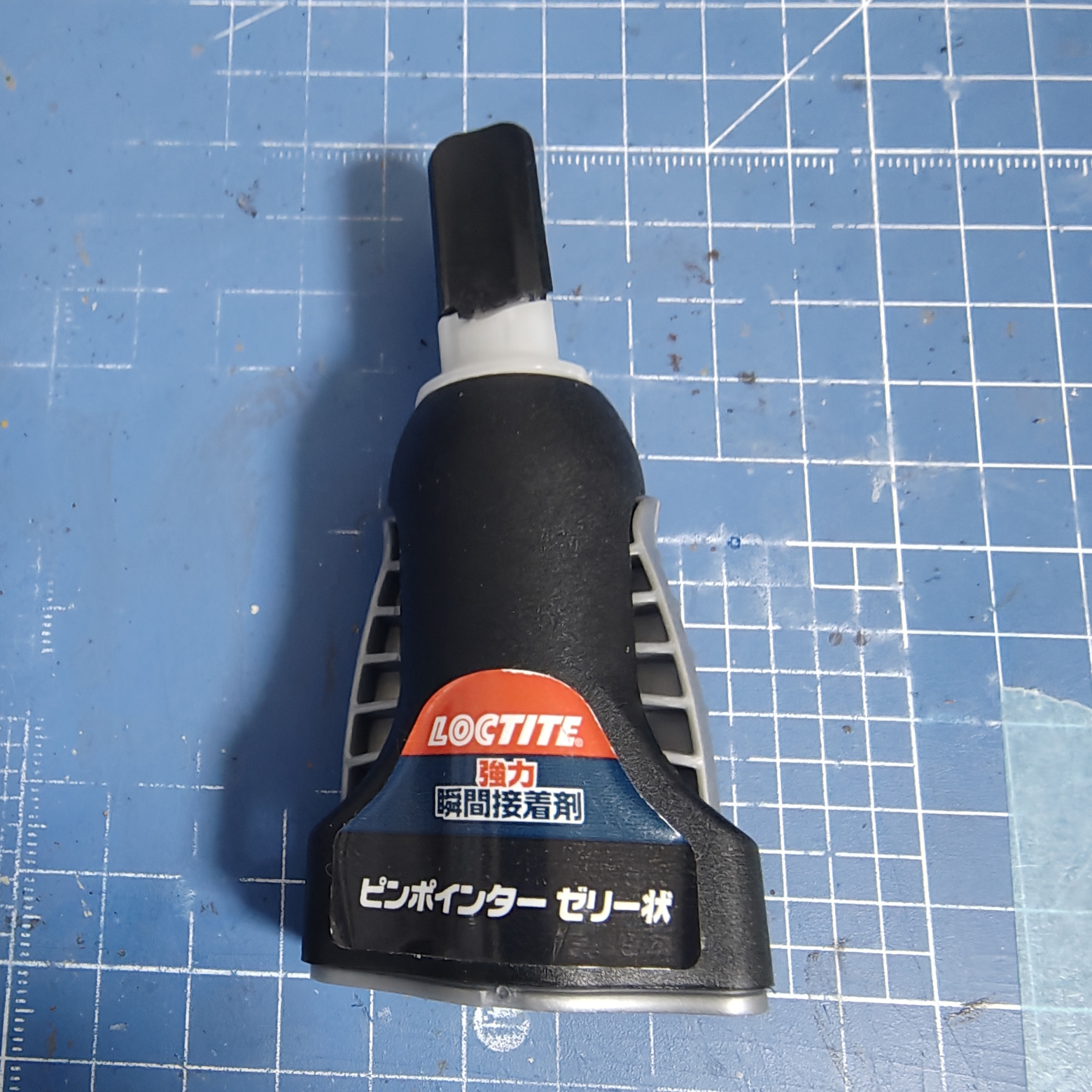 アーリーチョップさんのyoutube で紹介されてるのを見てから、この瞬間接着剤を使用しています。固いプラスチックの容器に入っていて両脇のグレーのところを押すと出てくるんですが、いくら力んで押せどもまったく出てこなくなったので、やっと使い切ったかと。まぁ、いつ買った忘れるぐらい前なので。