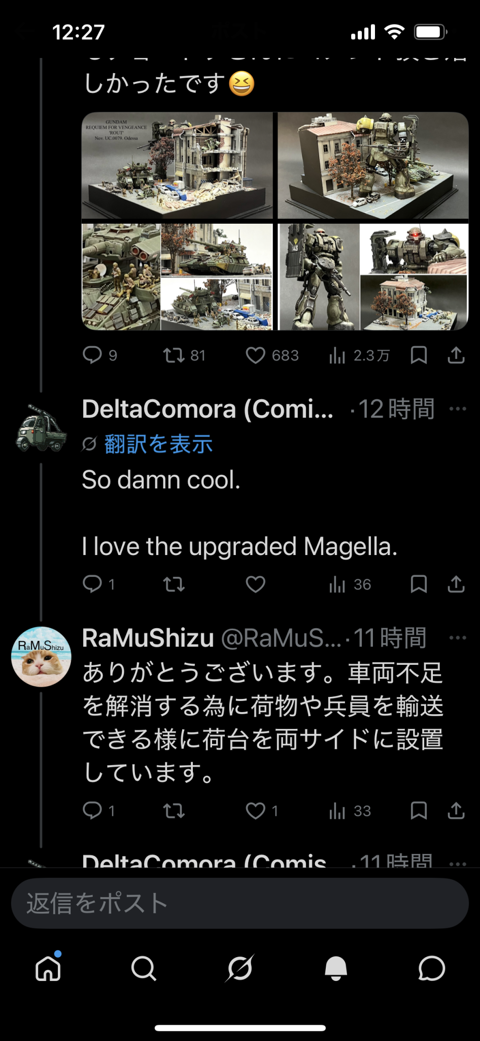 RaMuShizu 2026.04/01更新 40 7 いいねしたモデラー(7) 0 作品を共有 また何処のお国の方かわからないのですが「模コン」についてのコメントです😊またマゼラについてですが皆んなマゼラ好きなんですねー。 つぶやき コメント コメントをして応援しよう コメントにはログインが必要です RaMuShizu ガンダムは一年戦争以外はあまり知らないオッサンです。1年戦争以外のMSは殆ど知らないので話しについて行けない事もしばしば😅。1年戦争🪖をミリタリー的にあしらった物が見るのも作るのも好きです。ミキシングとやらはやった事もなくパテやプラ板を使った古風な改造しかできません。模活の年季は入ってますのでそれなりに見応えのある作品を心掛けて作って行きたいと思います。 17 「敗走」〜復讐のレクイエムより〜吉本模型部「第6回模コン」v… GUANSTAのモデラーさん達と今回もご一緒できて吉本模型部… 17 《ジオラマ》ドムトローペン「Private War」 《ジオラマ》ドムトローペンのタイトル…色々考えた挙句、これに… 17 ドムトローペン〜アーティファクト風/ドワッジ仕立て〜 アーティファクトのトローペンを参考にHGトローペンにドワッジ… 6 「BATTLE OF CALIFORNIA BASE」その後 前作のキャルフォルニア基地で連邦守備隊が壊滅した後の状況です… RaMuShizuさんのページ