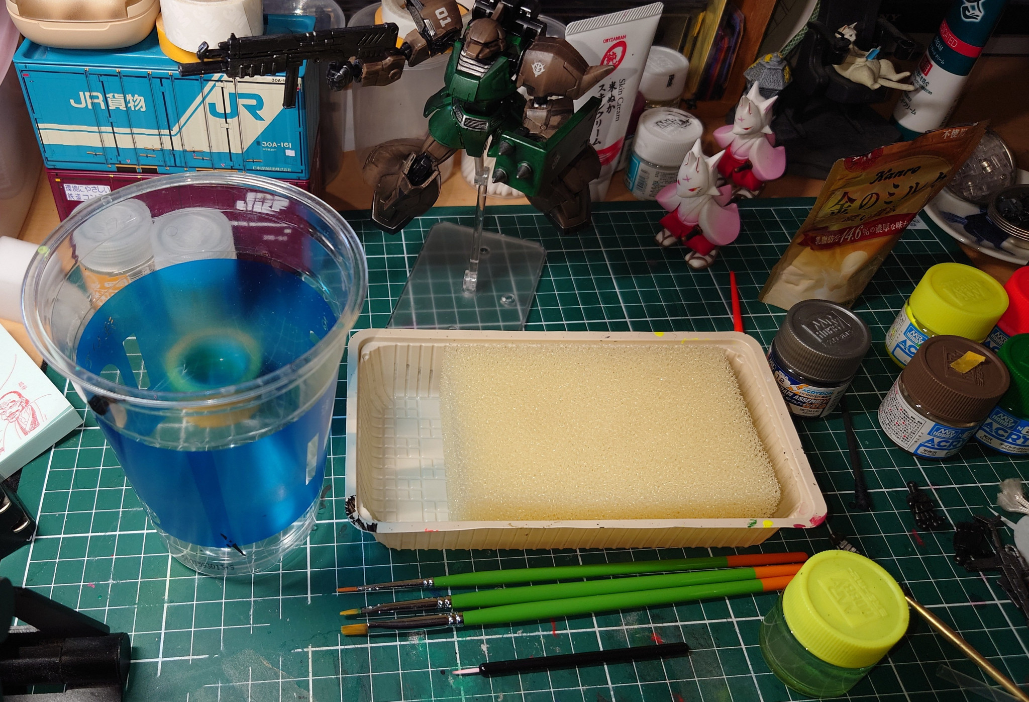 ワタクシの塗装道具を紹介しましょう ローソンのおにぎりセットの空き容器が丁度良かったので、水張って、百均のスポンジを入れて、クッキングシートをのせてます はい! ウォーターパレットの完成! 筆洗いバケツは、コンビニで氷買った時の器そのまま使用してます アレ、外でハイボール呑む時、丁度いいですね
