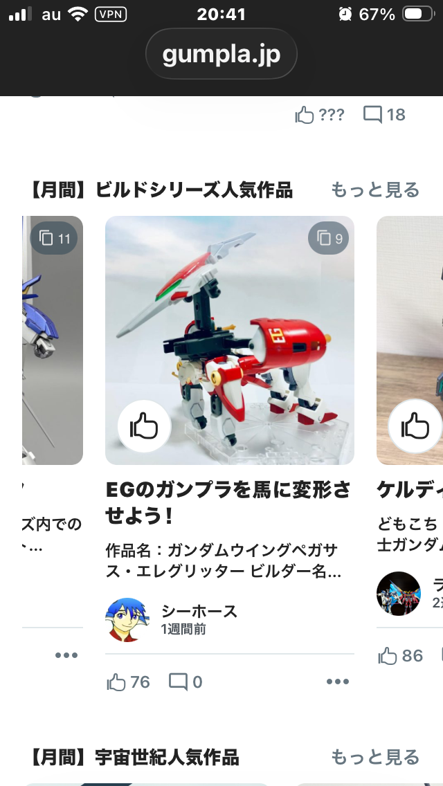 シーホース 2026.04/07更新 EG変形ガンプラ、大人気御礼!! 8 5 いいねしたモデラー(5) 0 作品を共有 感謝感激ですぅー!! p(≧∀≦)/ つぶやき コメント コメントをして応援しよう コメントにはログインが必要です シーホース 関西在住のマルチクリエイターユニットです。YouTube(ユーチューブ)とニコニコ動画にて番組「チャンネルシーホース」を配信しております。また、ビルダーズルームのガンプラウォールにおきまして、2018年10月の月間優秀賞を受賞しております。たくさんのフォローをお待ちしております! 9 EGのガンプラを馬に変形させよう! 作品名:ガンダムウイングペガサス・エレグリッター ビルダー名… 11 EGのガンプラを武装マシマシにカスタマイズ! 作品名:ガンダムアームドストライクワイバーン ビルダー名:シ… 11 漫画のガンプラをEGでよみがえらせよう! 作品名:ガンダムストライクワイバーン・エレグリッター ビルダ… 15 EGのガンプラを社外の部品で強化! 作品名:ガンダムラケーテフリューゲル ビルダー名:シーホース… シーホースさんのページ