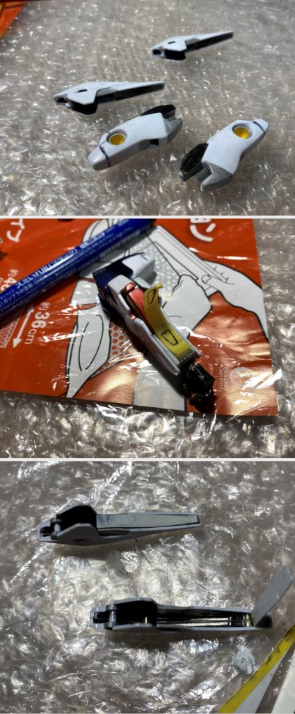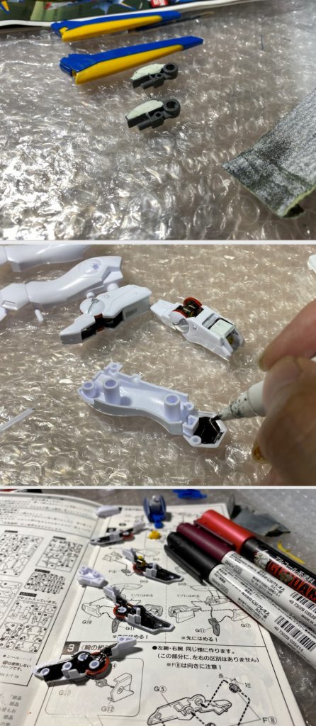 どうしても白色の装甲箇所はヤスリでやすっても合わせ目跡が残ってしまうため、所々ガンマカのホワイトで上塗りしています。なので、白部分のみ成形色とでちょい違和感でてしまっています。