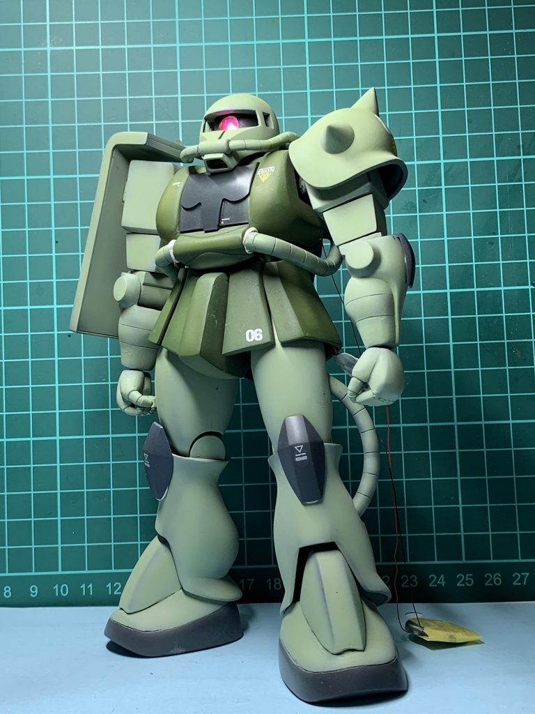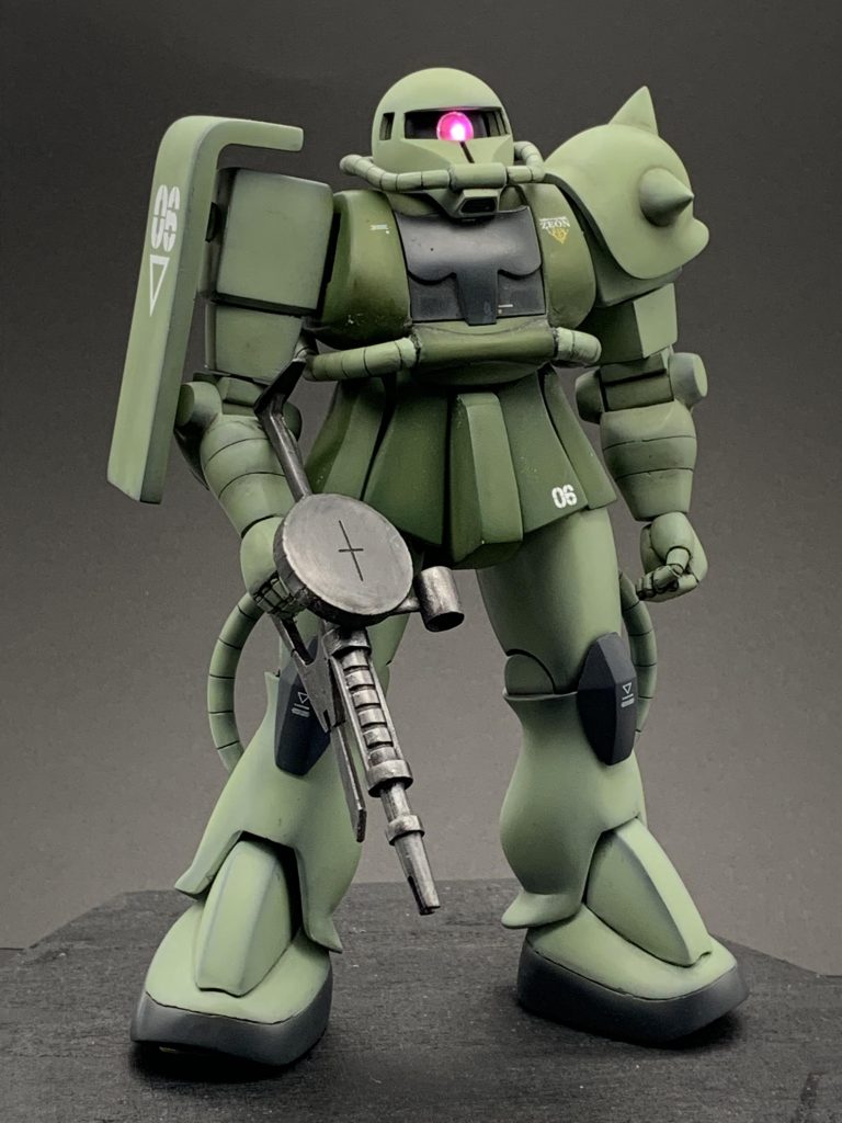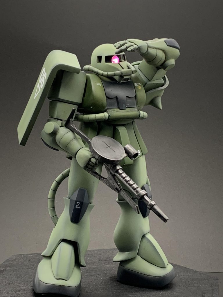 こちらのザクは、まさに自分達が子供の頃TVで見たザクのイメージそのものです!モノアイも光るんですね✨旧キットの改修はハードル高そうですが、@shinjiさんの技術力は素晴らしいです。