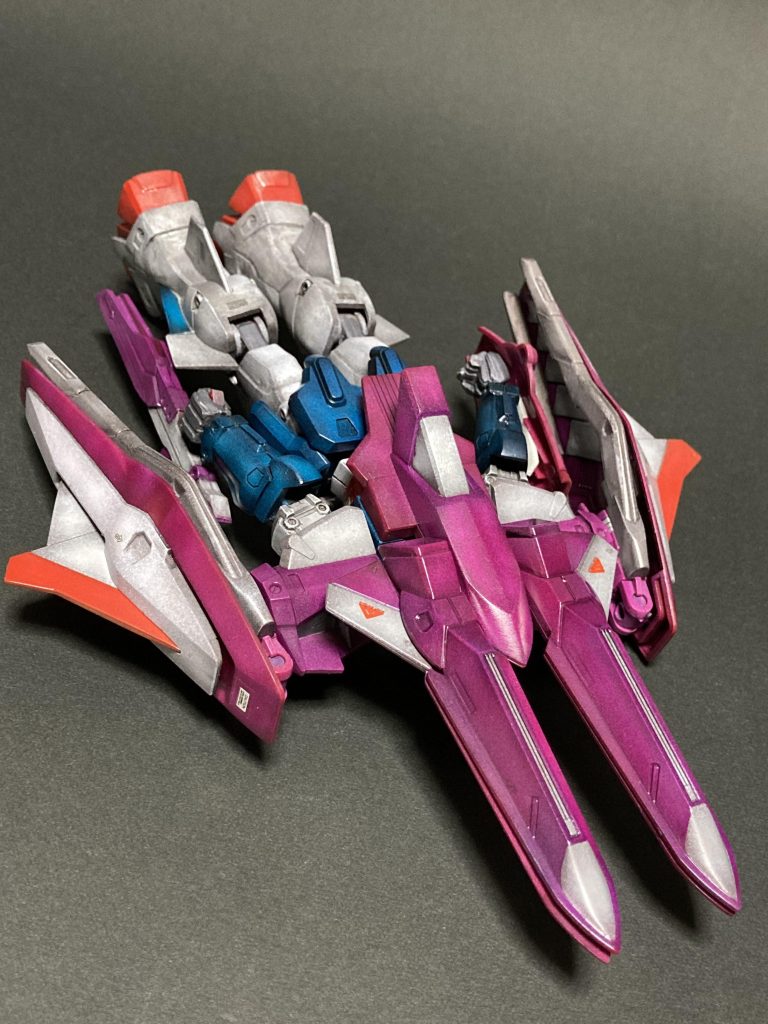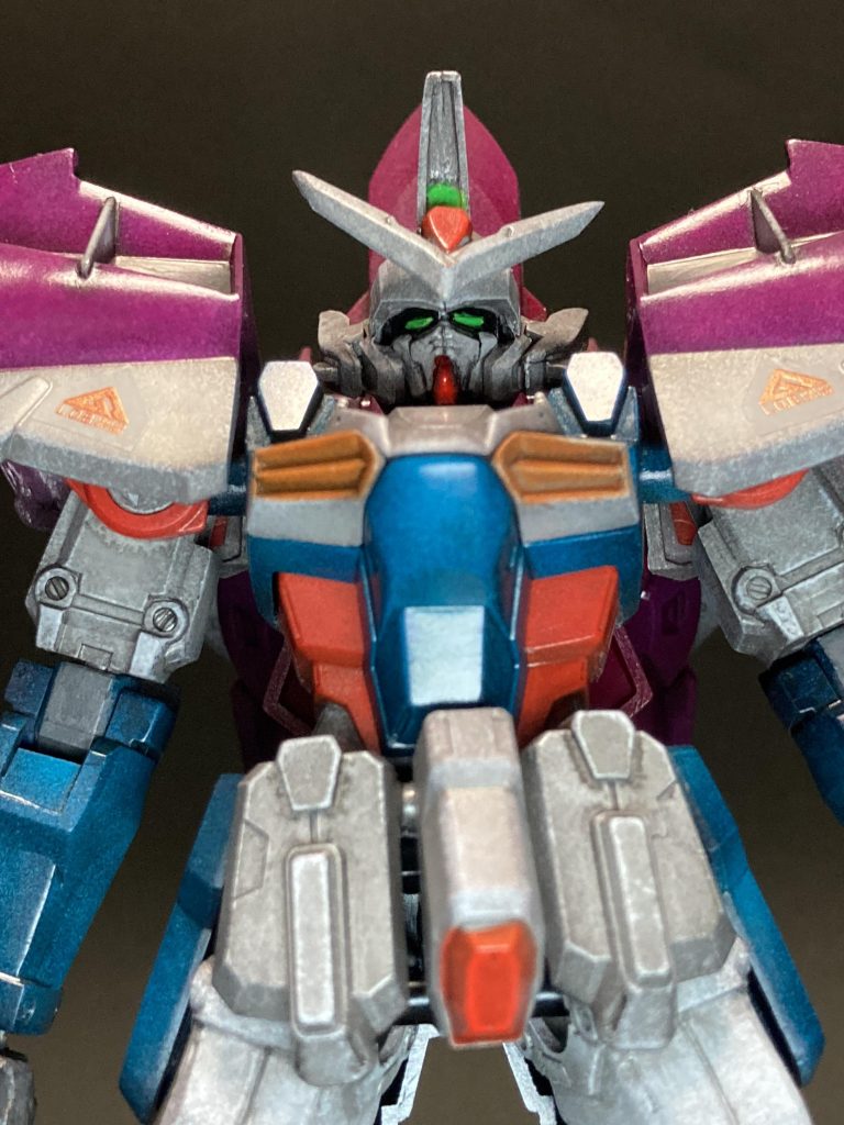 モモと脚をランナー2本分延長し、グラデーションかけつつ、エナメルブラックでウォッシングをかけ、前回作ったプレバンエルオーブースターのデカールを散りばめて仕上げました。