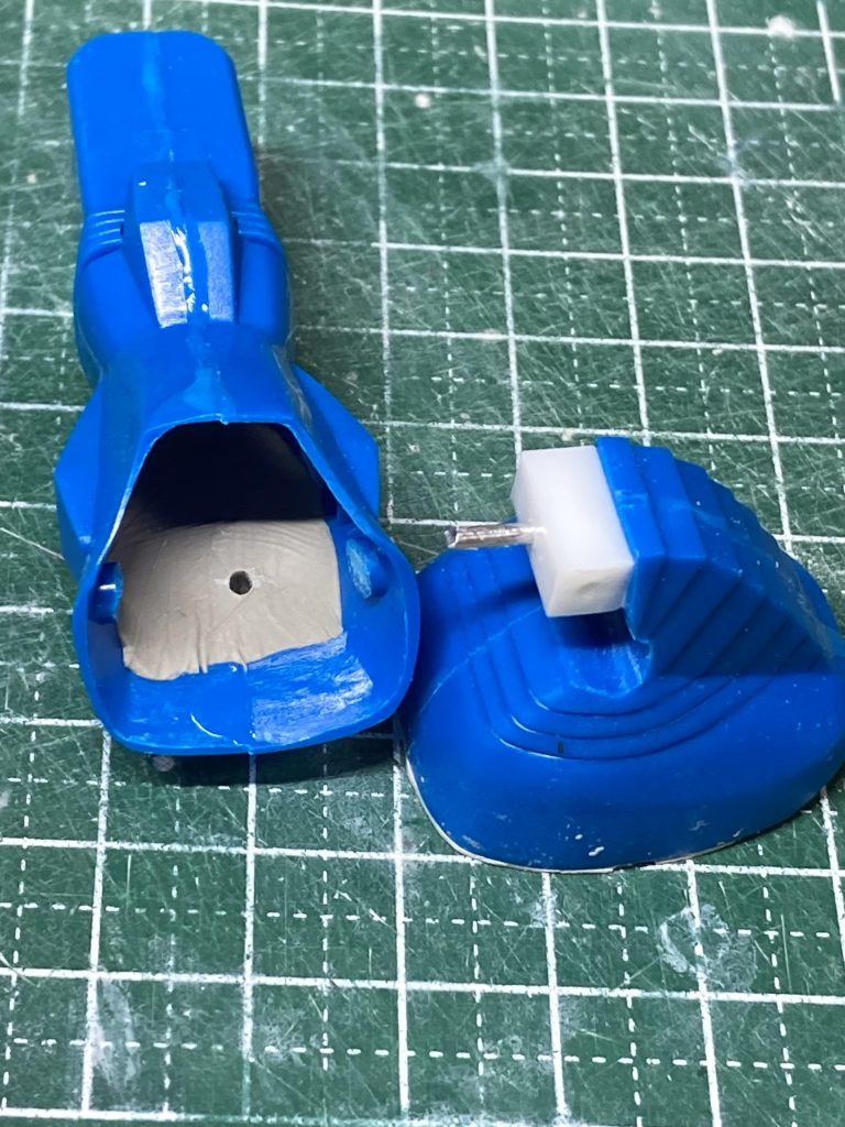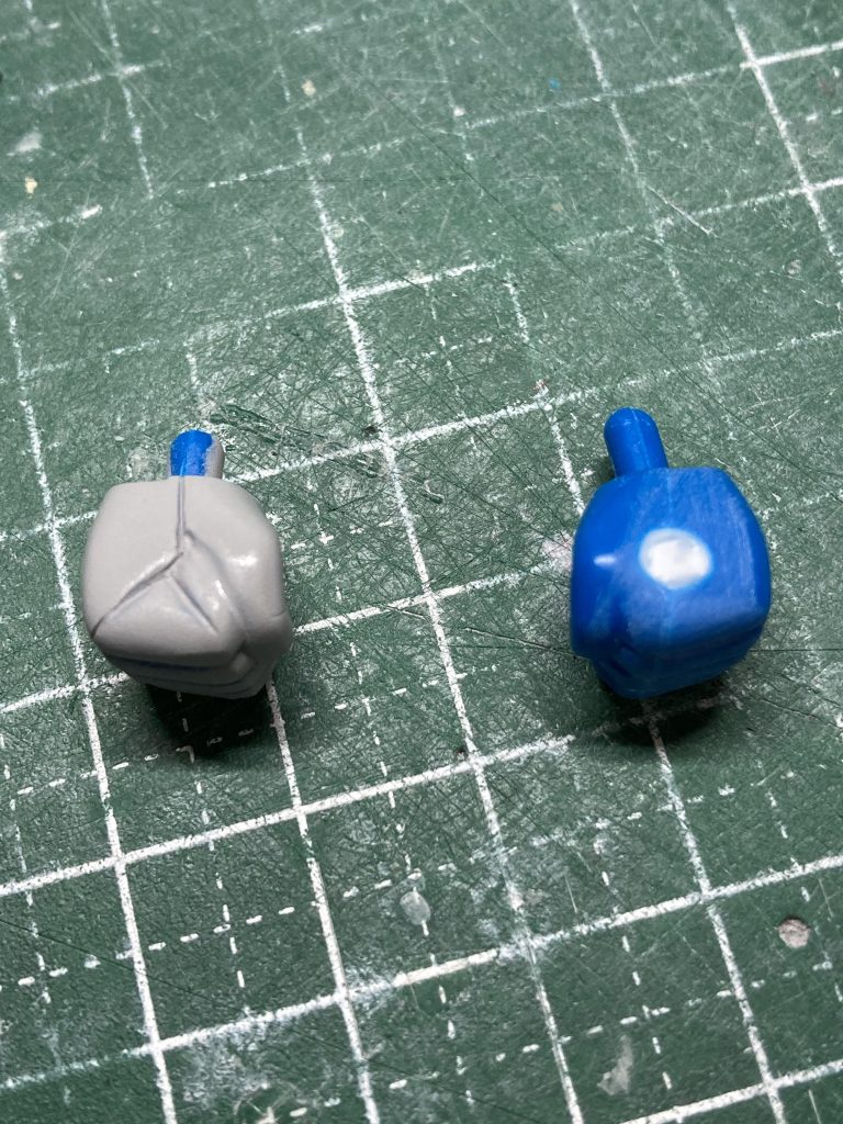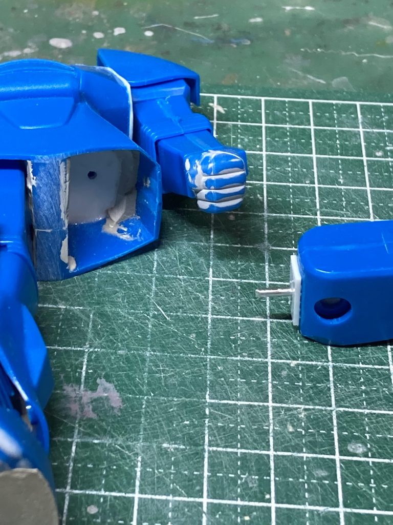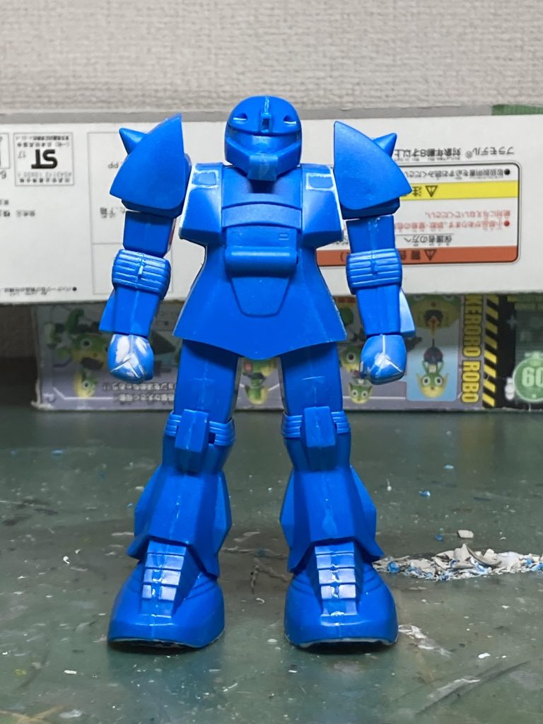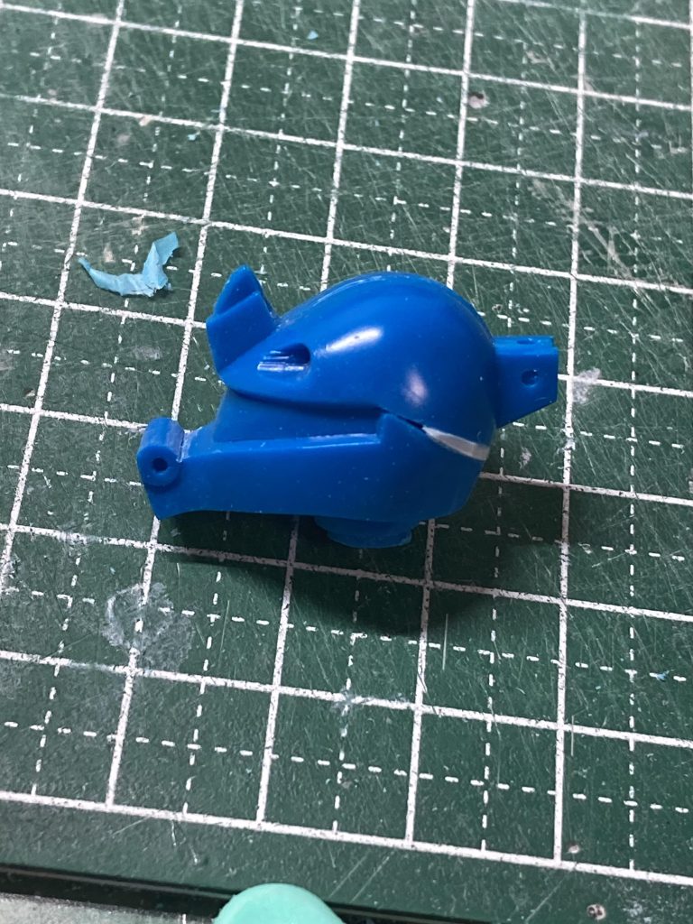 工作としては定番の胸部ハの字カットとモノアイのスリットを鋭くしている点くらいで、あとはほぼストレートです。握りこぶしは穴を埋めて削ってそれらしくしました。