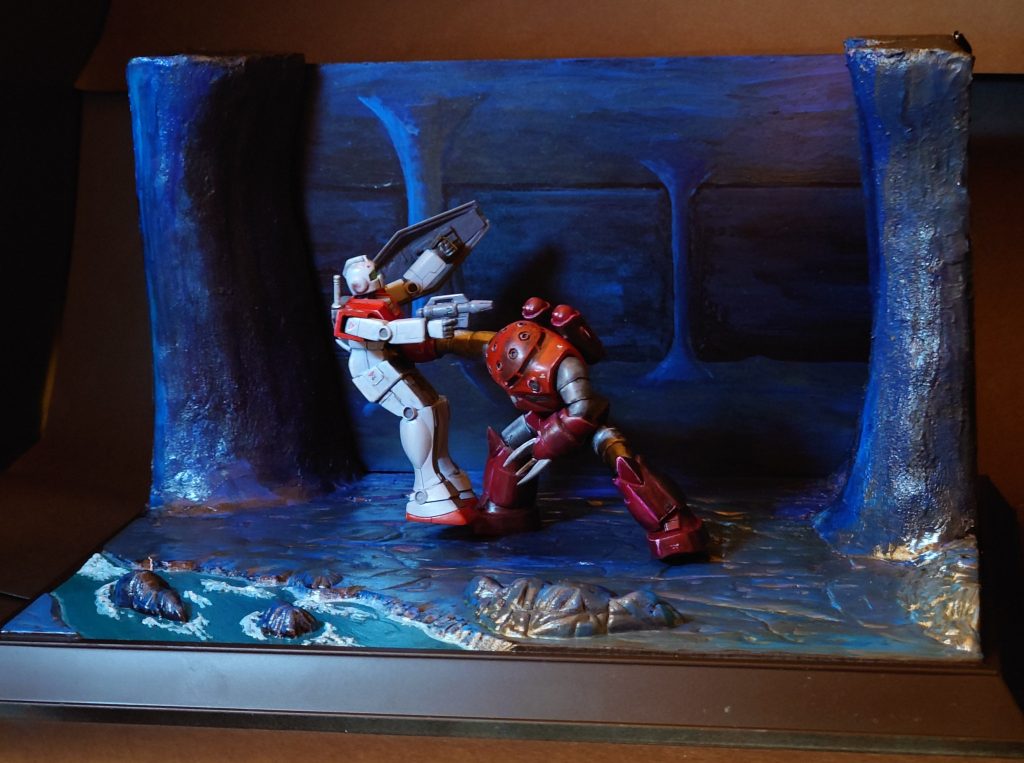 初めてジオラマというか背景に挑戦しました。(以前のサイコハロは塗っただけ)とはいってもアニメやイラスト風なんで、リアル寄りのジオラマはまた挑戦したいです。