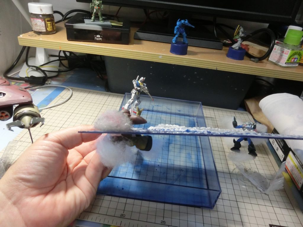 そうなんです。このジオラマの大前提は付け替え可能とするところでして、そこが苦労した点でもあります。クリアプラバンを切り抜きし、グラブロとの隙間をグルガンで埋めています。このときグルガンを直接施すとグラブロにくっついてしまうので、先におゆまる(100均で売っている、お湯でとけるプラ板)で下地を作ってから埋めるという行程を入れてます。