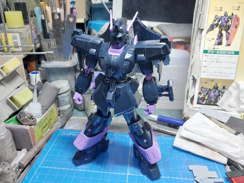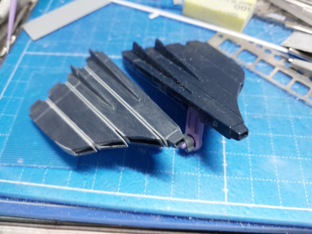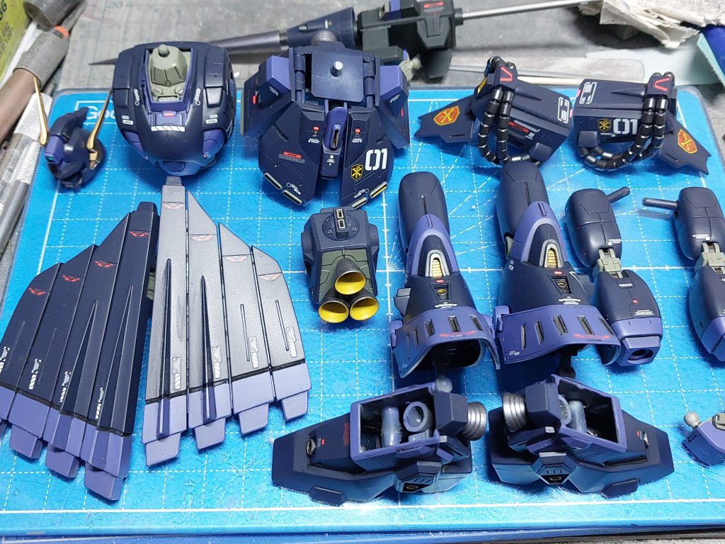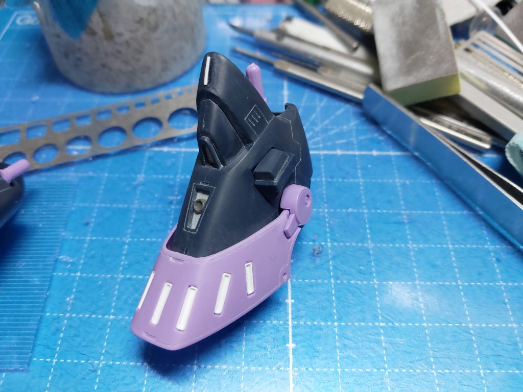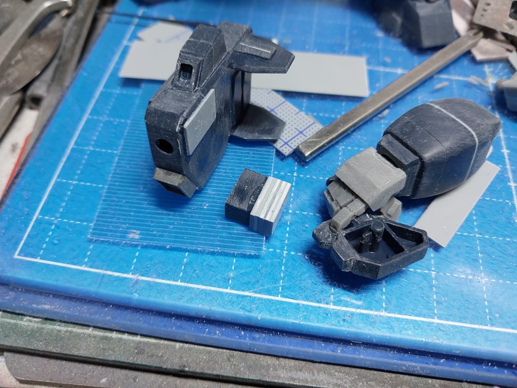 主な工作は胸部左右幅詰め、肩アーマー幅詰め&マウント方法変更、取り付け位置上げ、腹部延長、股関節位置下げ、太もも延長、肘関節交換、手首交換、ショットランサーグリップ位置調整、シェルフノズル各ブロック分割再構成。