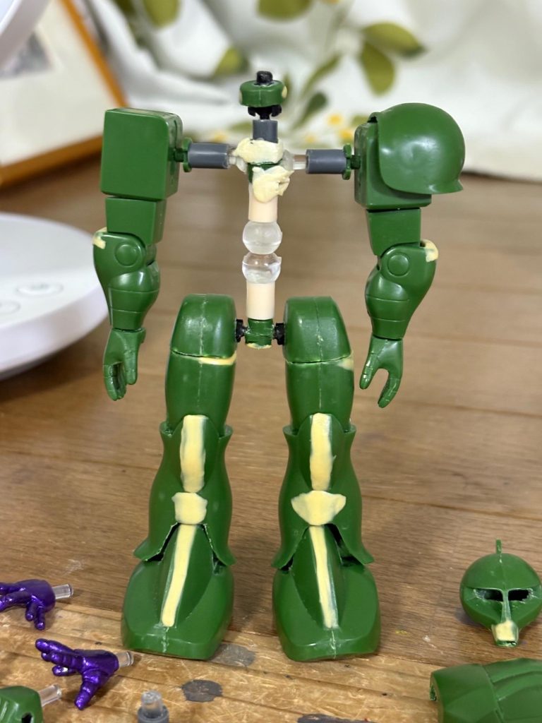 既に旧ザクの記事で紹介済みだが、腕や脚部の可動は前回のザクと同じようにやりつつ足の可動部はボールジョイントをはめられるよう、リューターで穴を拡げた。