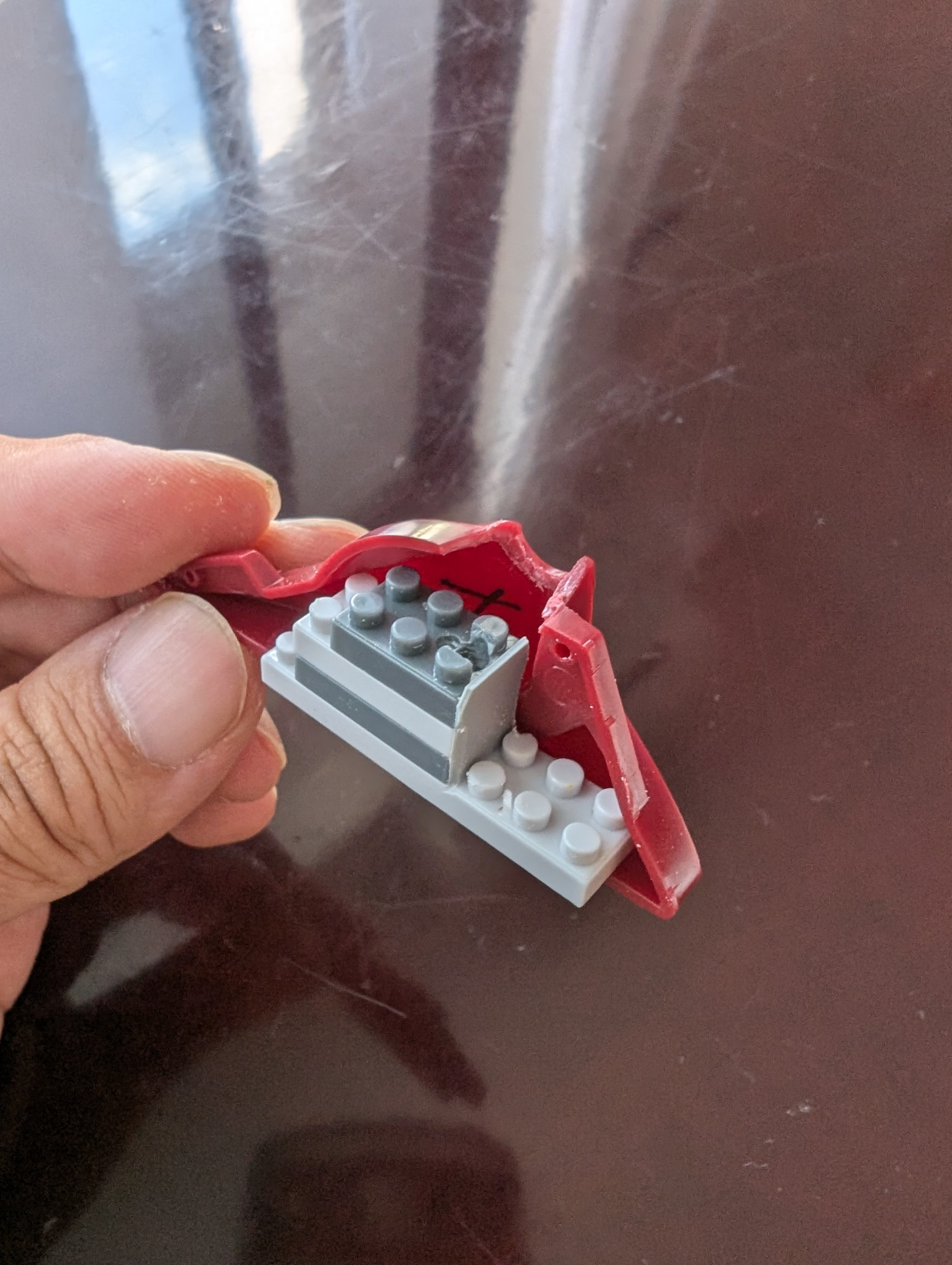 100均のロボもののナノブロックを組んでプラバン補強して穴開けしたもの。