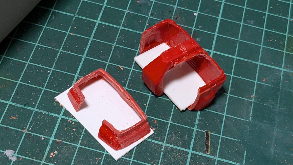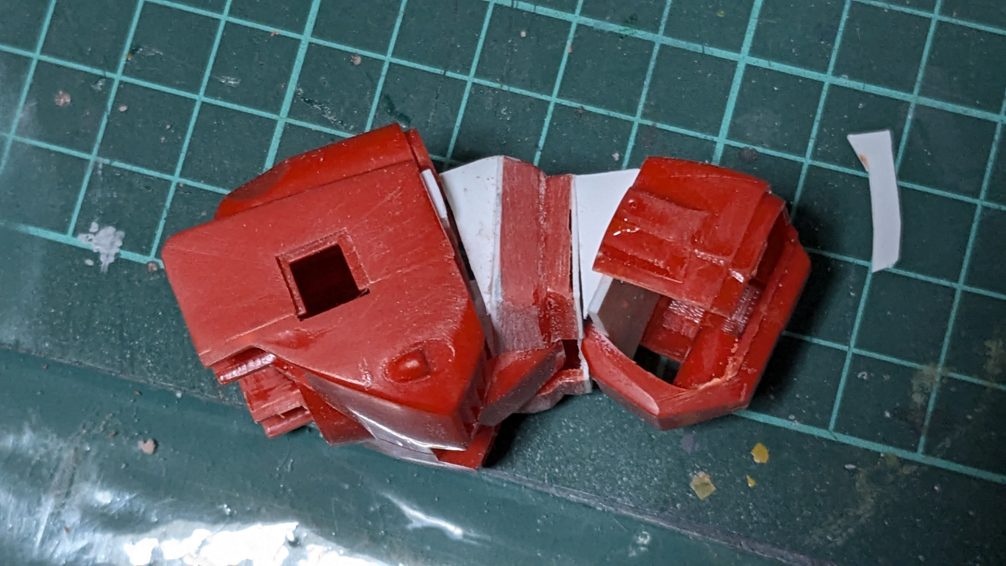 ここだけは仕方ない。胸、腹、腰で三分割。プラバンで蓋をして楔形のプラバンを差し込んで前傾させました。