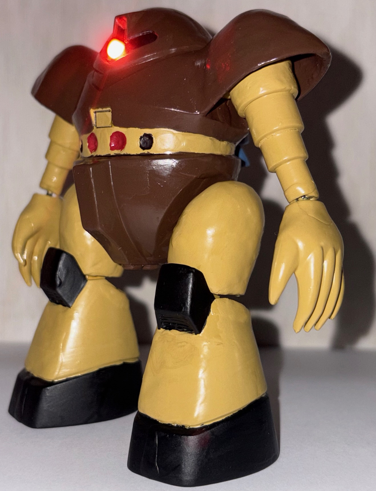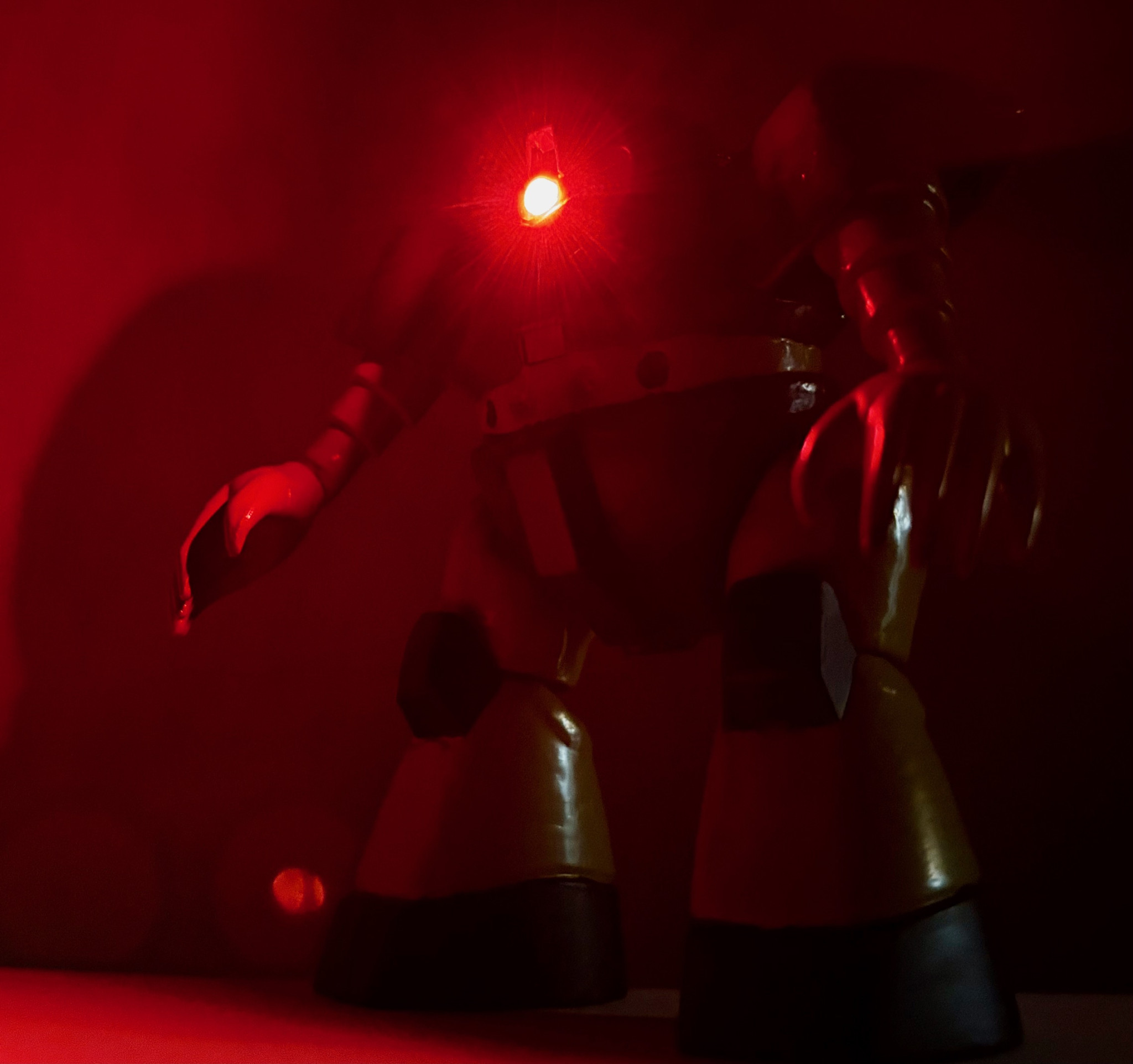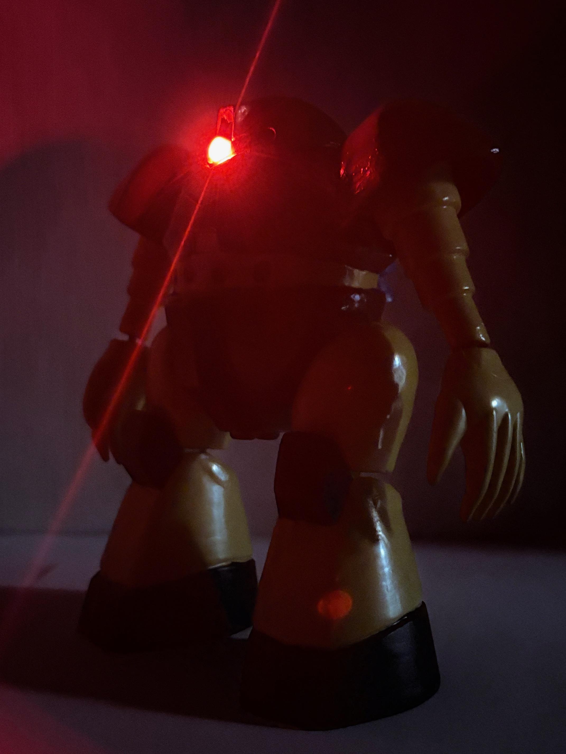 「あるギミック」とはズバリ「モノアイの発光」である。なぜモノアイを光らせようと思ったのかというと、ゲームセンターで見かけたSEED FREEDOMのプライズ「ズゴックのルームライト」に感化されたからである。