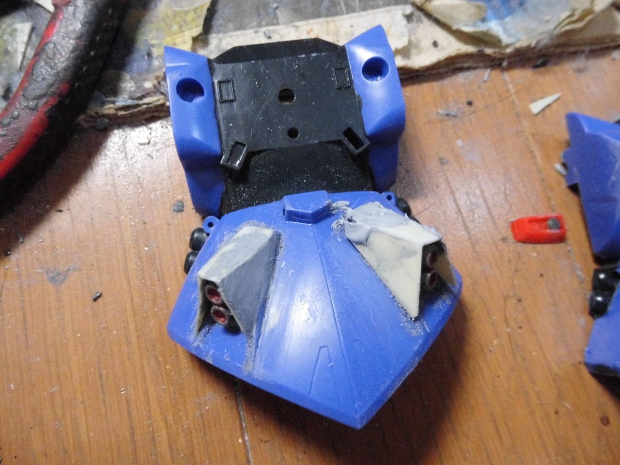 頭頂部は鉄人28号ぽいので若干エアロ形状に、肩のスラスターはキットまんまだと装甲ツライチなので、1mmプラバンで出っ張らせ3連スラスターの内側1機は大型化。胸、肘内側の装甲形状変更、スカート内に3連バーニア追加、スカートに横方向に向いてたスラスターもやや下向きに変更、それに合わせて背中のスラスターの方向も合わせて変更・・久しぶりの大改造でした!