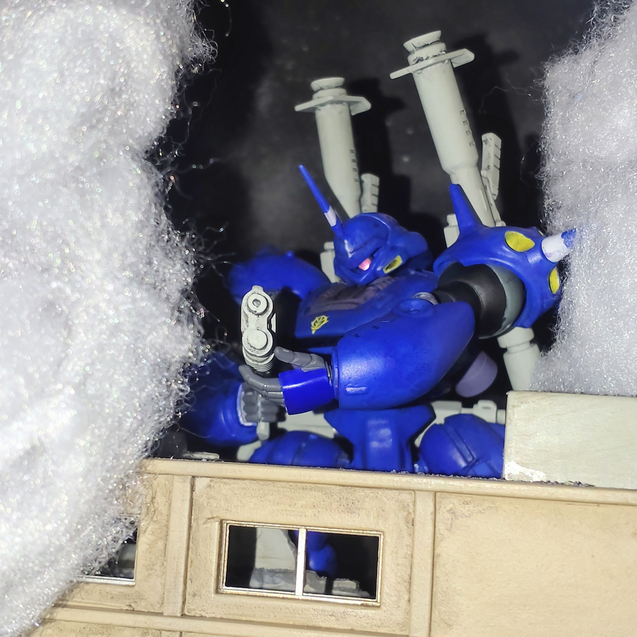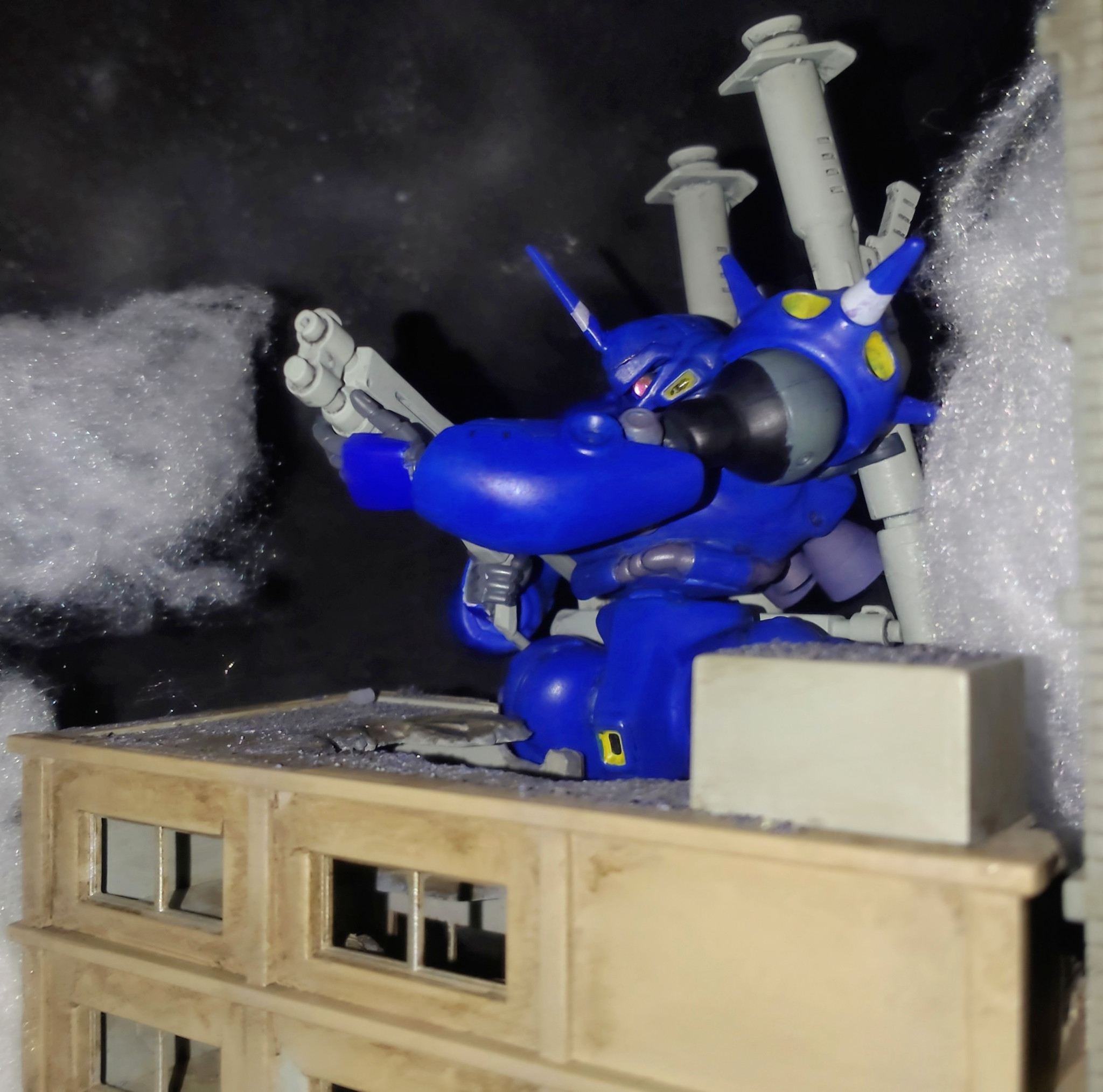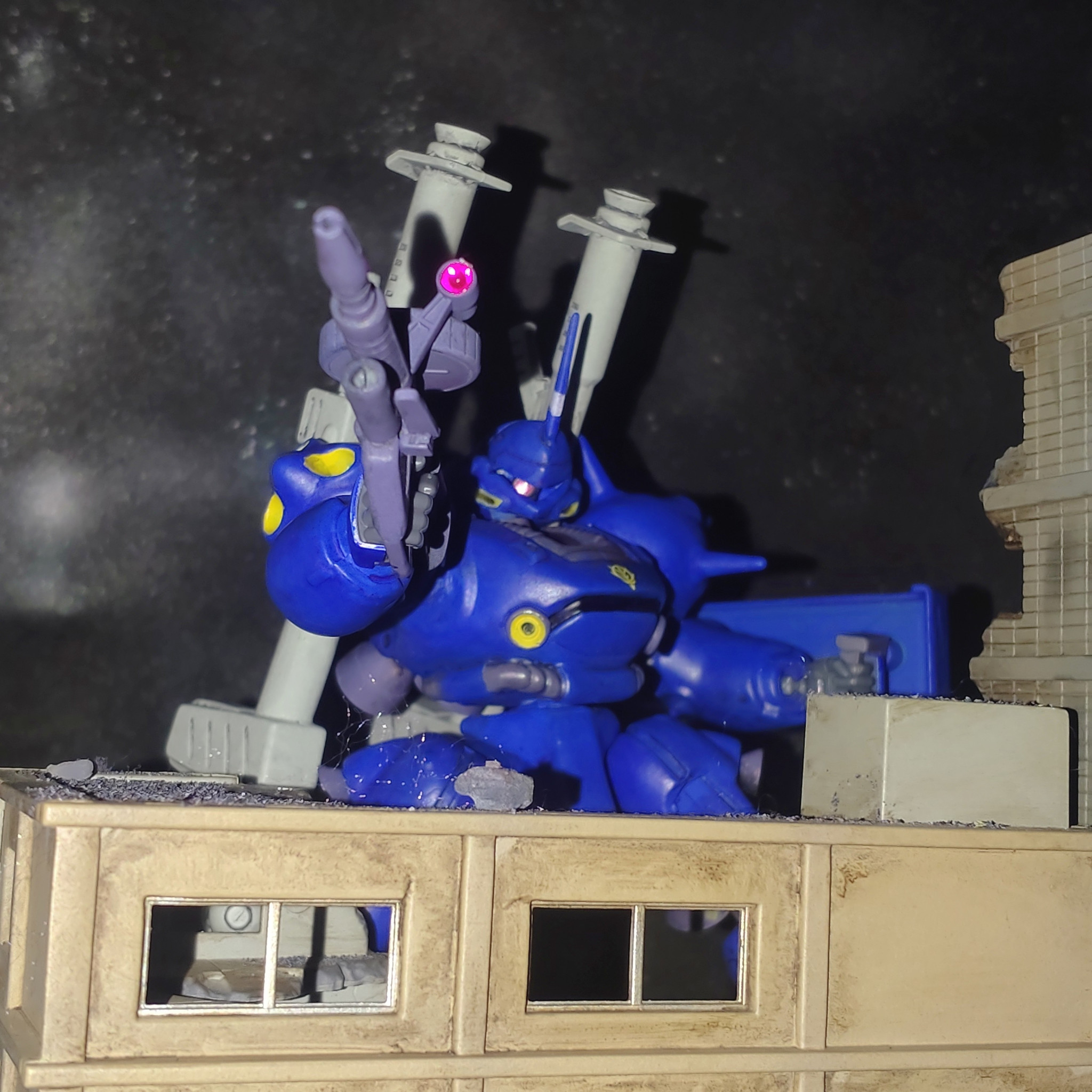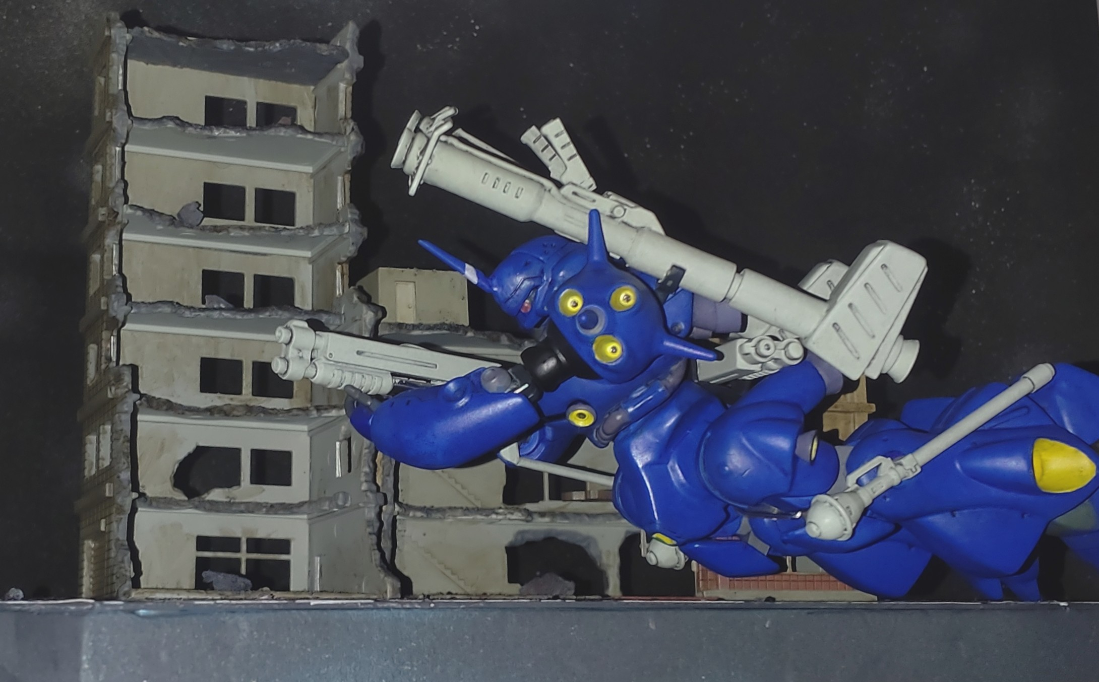 改修してポージングが自在なのでジオラマが映えますね!(zaku-kao2)ザクマシンガンもシールドもいいですねぇ!