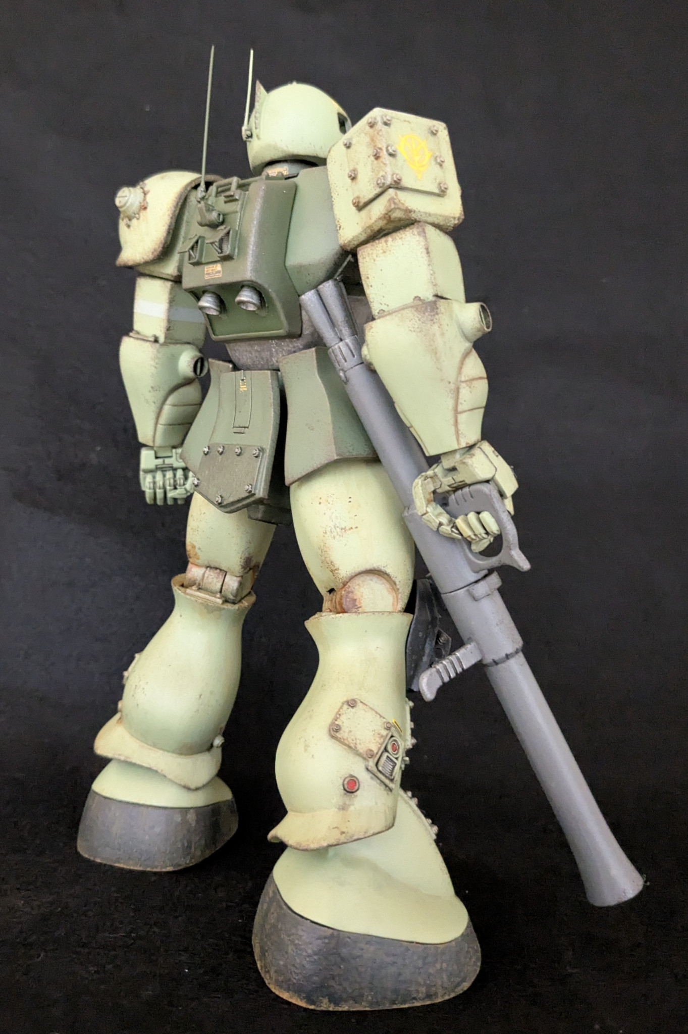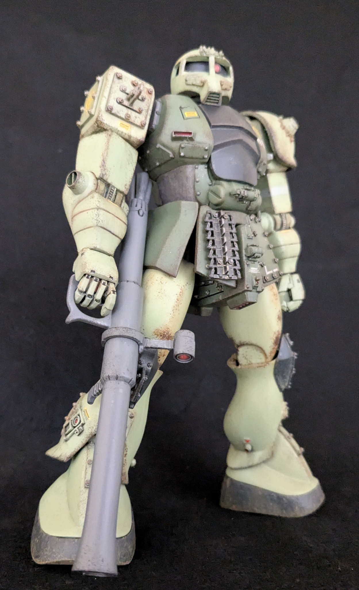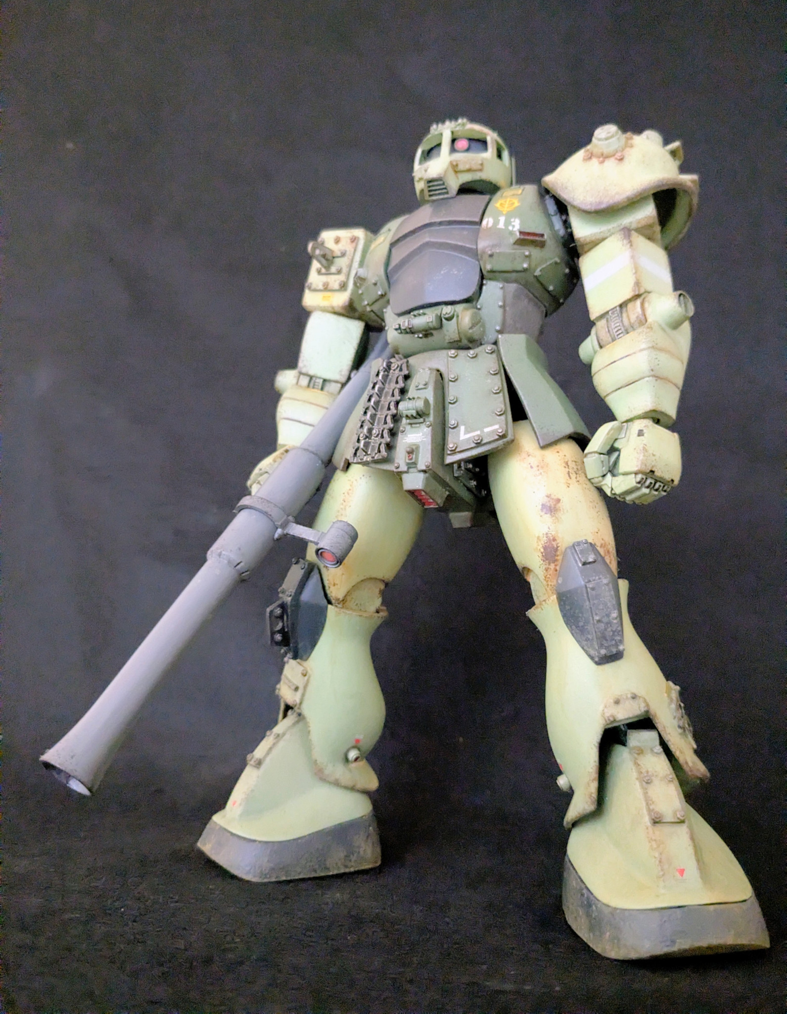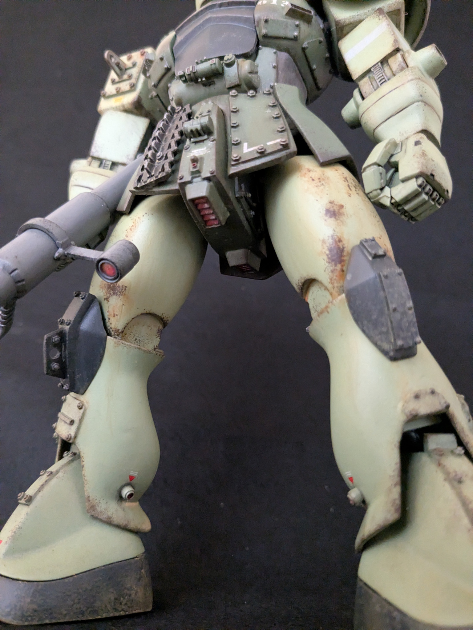 脚部の接続、吊り下げとは目から鱗です!勉強になりました。ザク好きにはたまらない作品ですね。HGやMGの改造より難易度が高いと思いますが、すごい完成度!!眼福です。