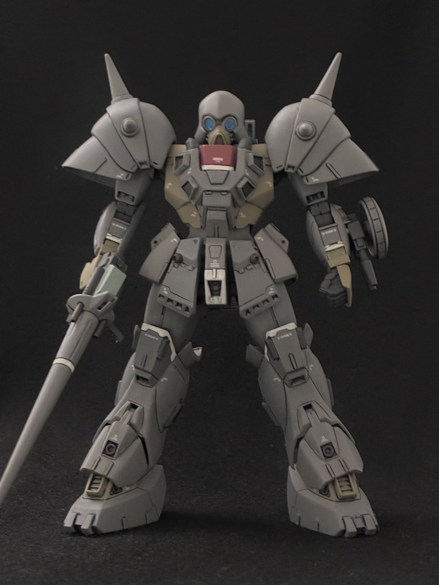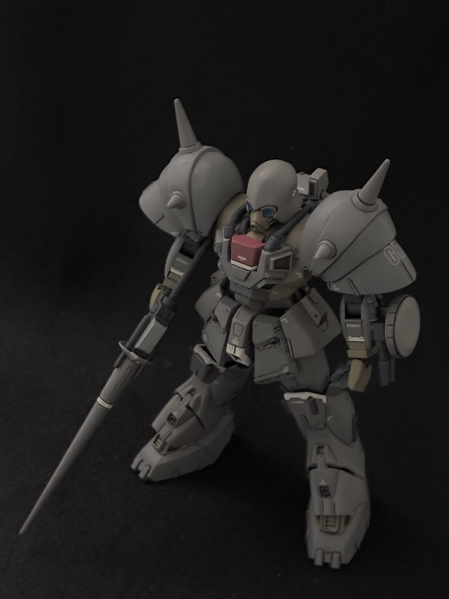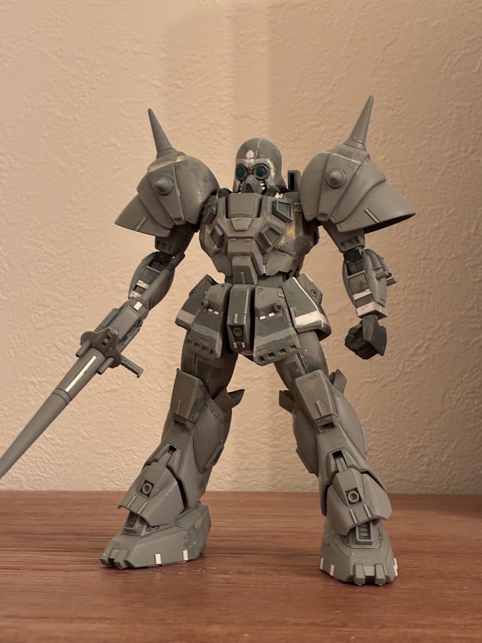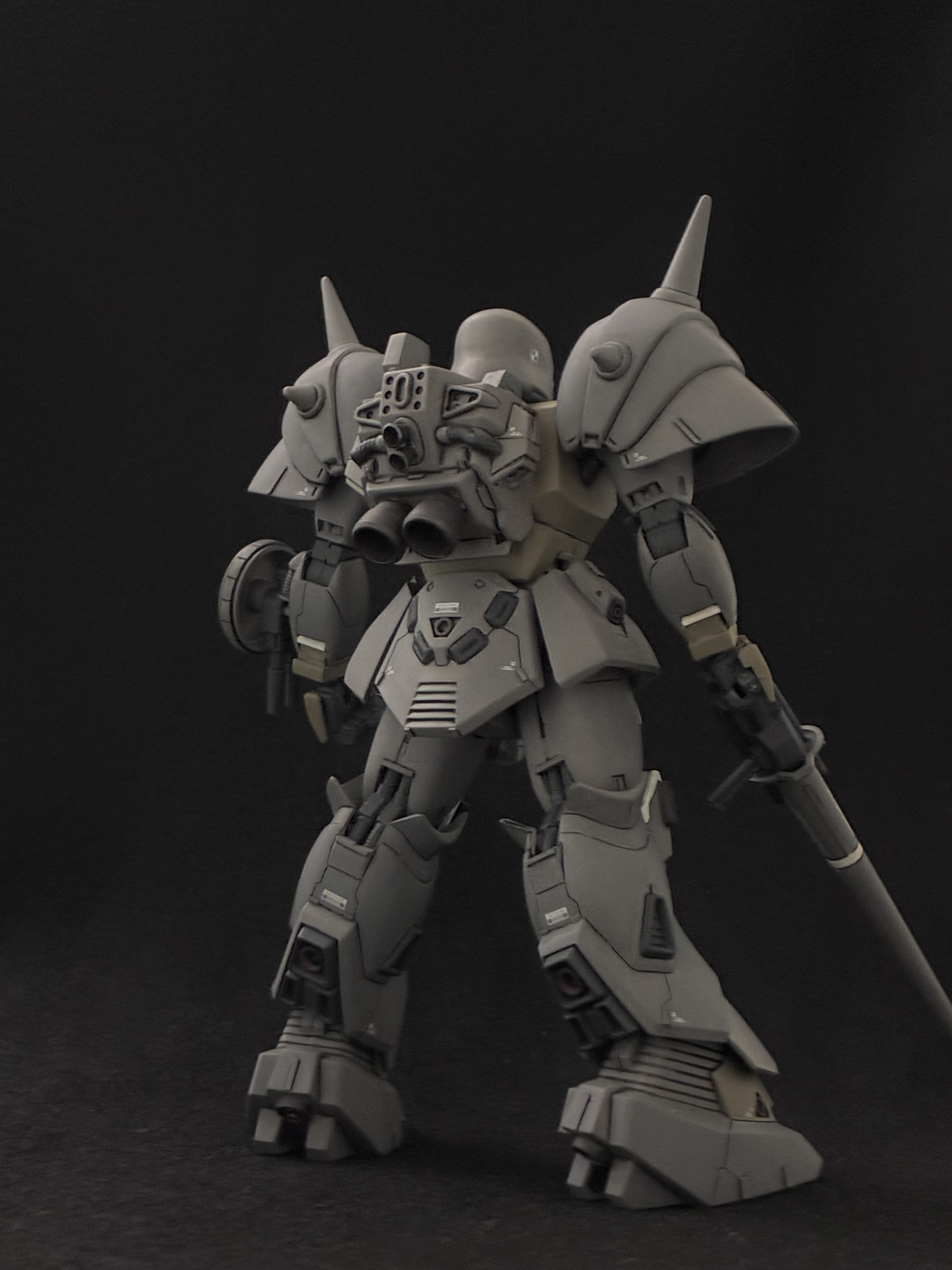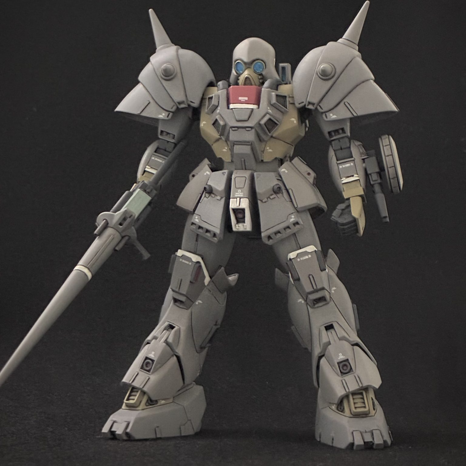 プロポーション改修、ディテール配置を終えたところ。この時点で頭部は前述した改修点の中では上下短縮は行っていない状態で形に納得が出来ておらず、塗装直前で思い立って短縮と頰当ての形状変更を行いました。