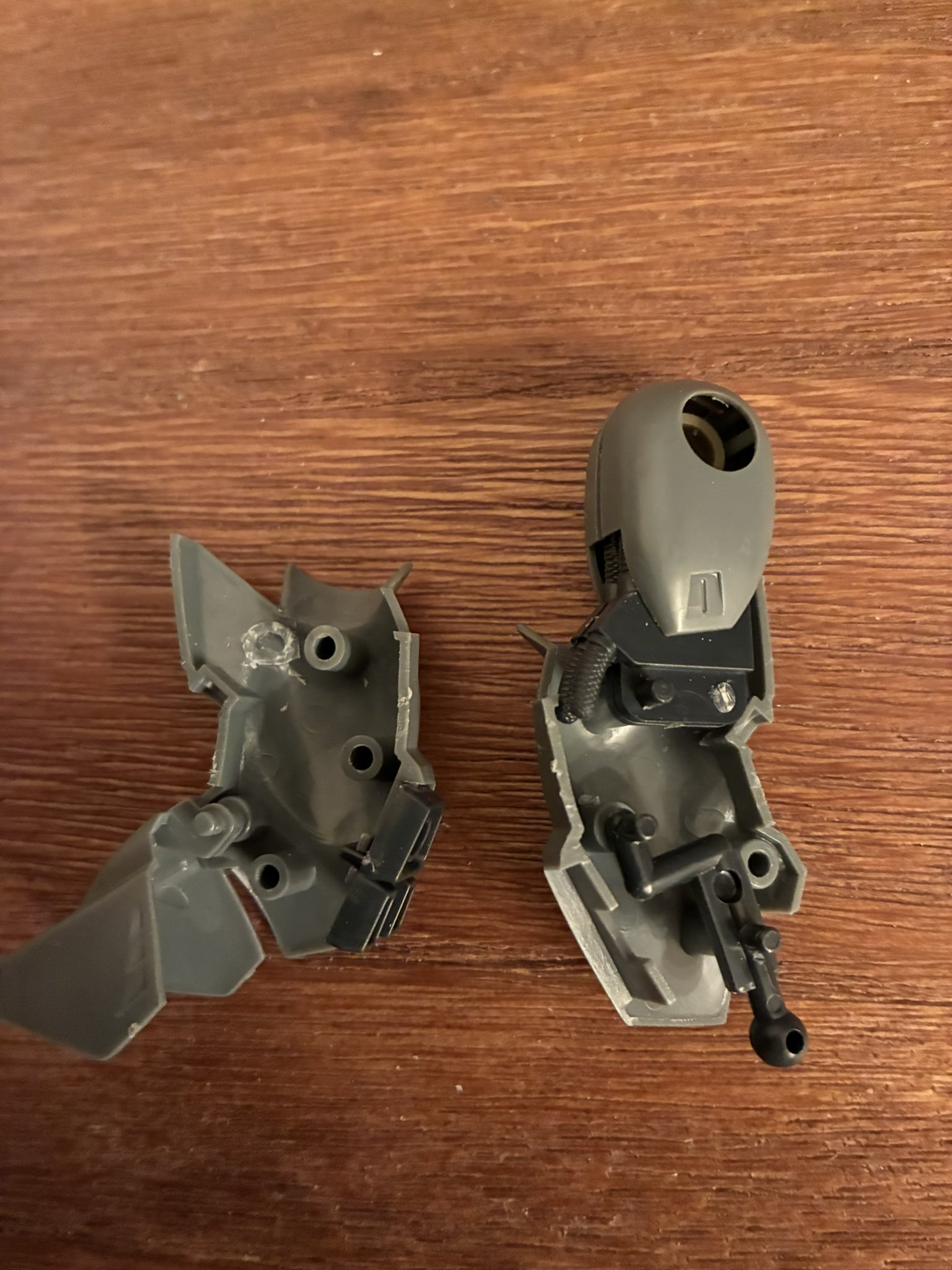 膝関節の逆足化加工。関節パーツら前後2本ずつのピンで固定されていましたが、片方を切除することで関節を前に沈み込ませることが可能に。