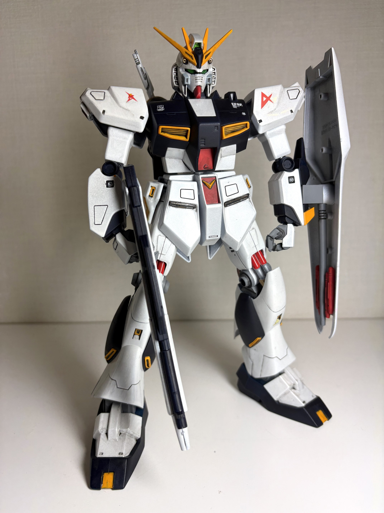 まもなく発売になるPGU νガンダムがディテール・マシマシで話題ですが、旧キット1/100は元々のデザイン(シンプルな曲線で構成されていて、結構ガッシリ体型)を再現していてカッコ良いです。デカールも最小限に抑えました。