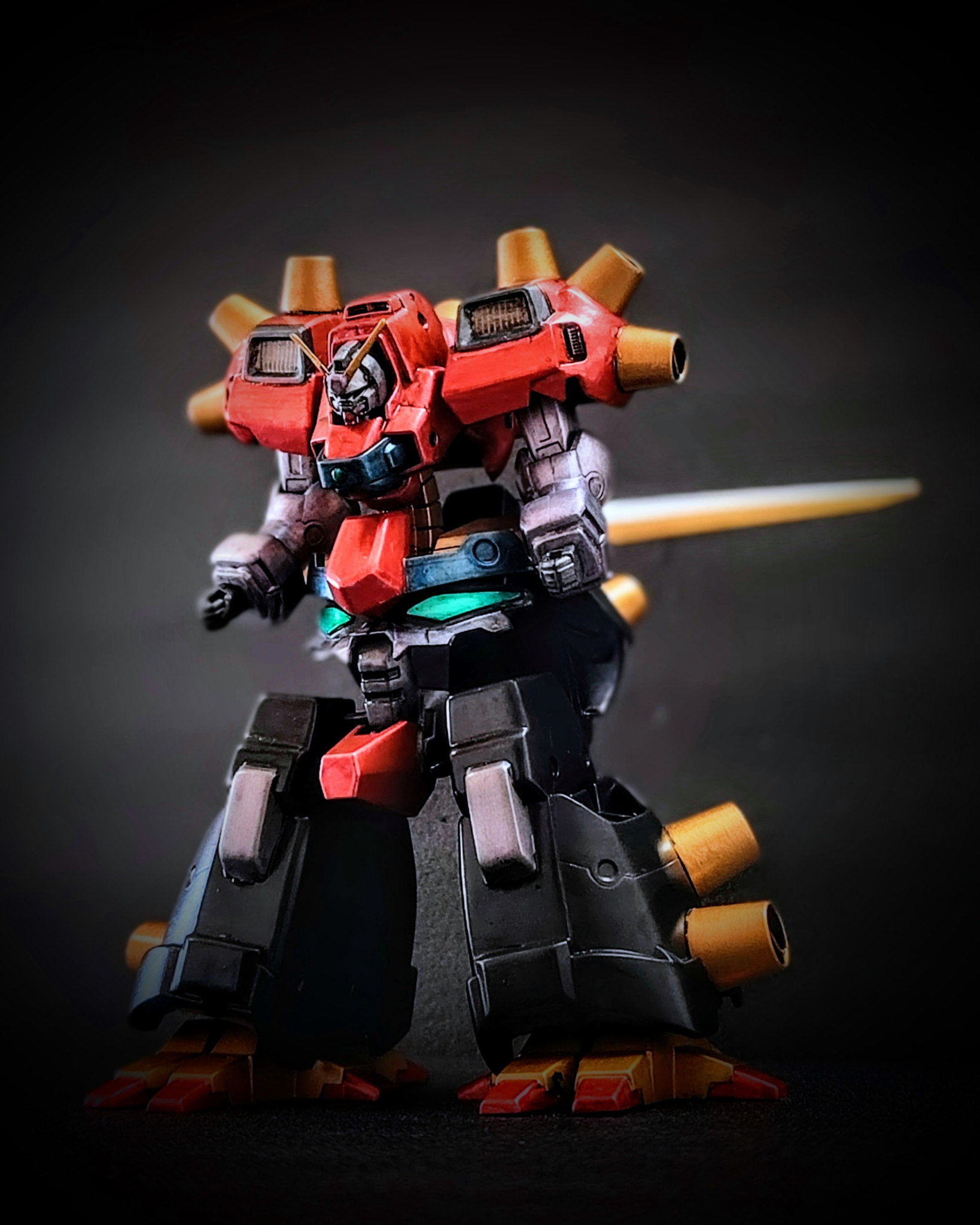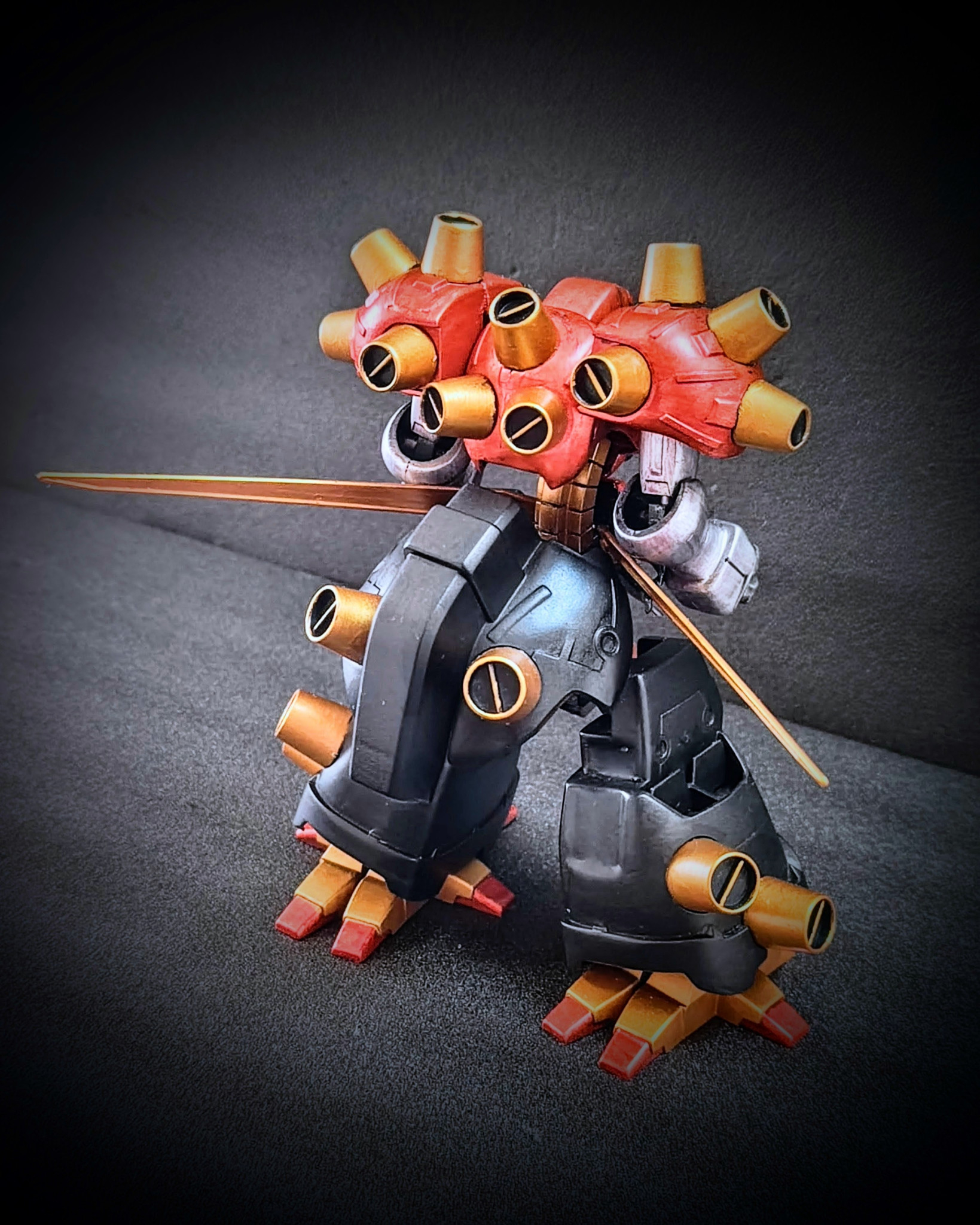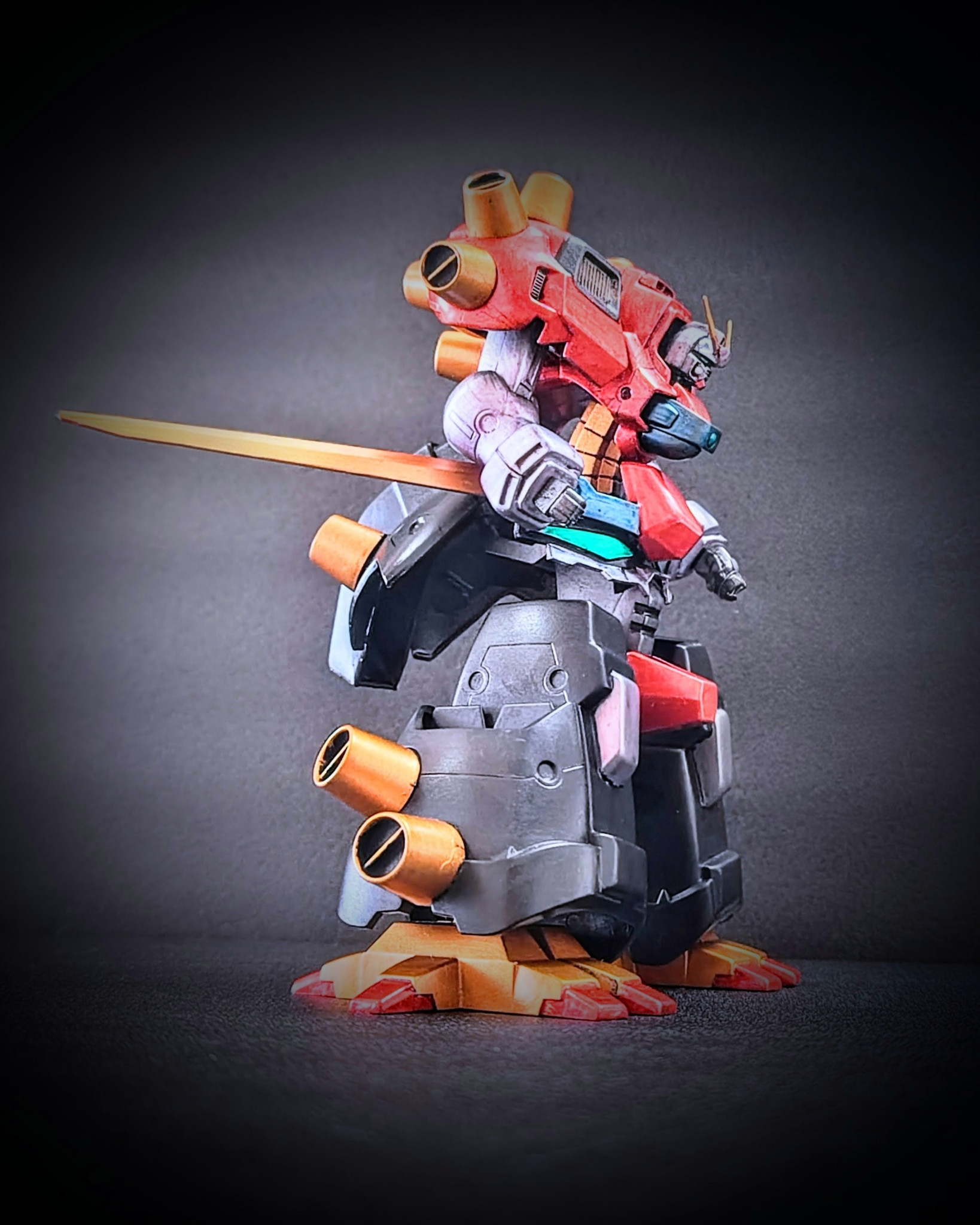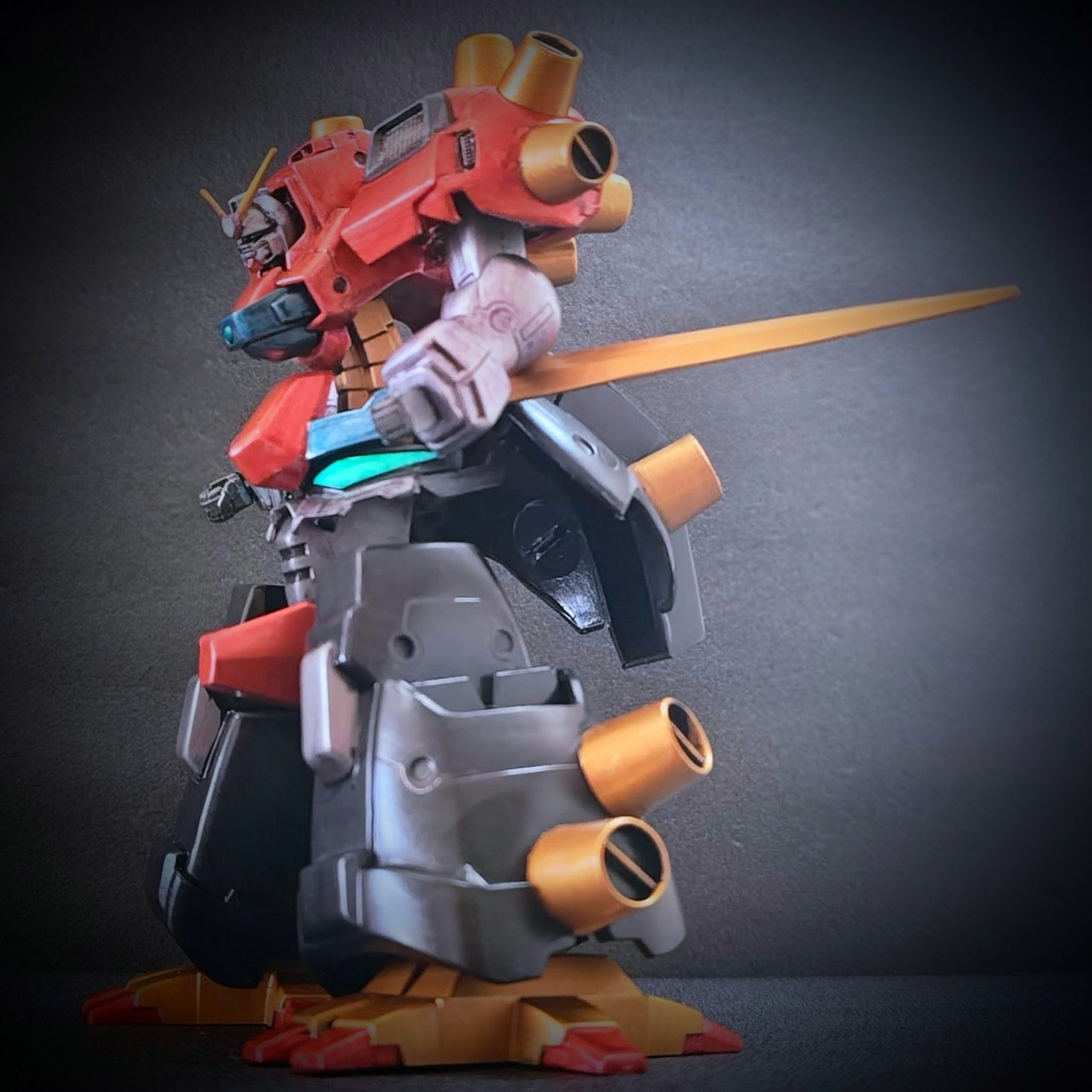 ガンダムベースでたまたまクリアカラーのキットを見かけて、なんちゃってメカニカルコア風で仕上げようと思って購入。裏からメタリック系で塗ってみたもののそんな雰囲気にならず。また、組んでいて合わせ目もがっつりで色々と気になったので普通にパテ使って合わせ目を消したりしたりし、全塗装して仕上げたという次第です…