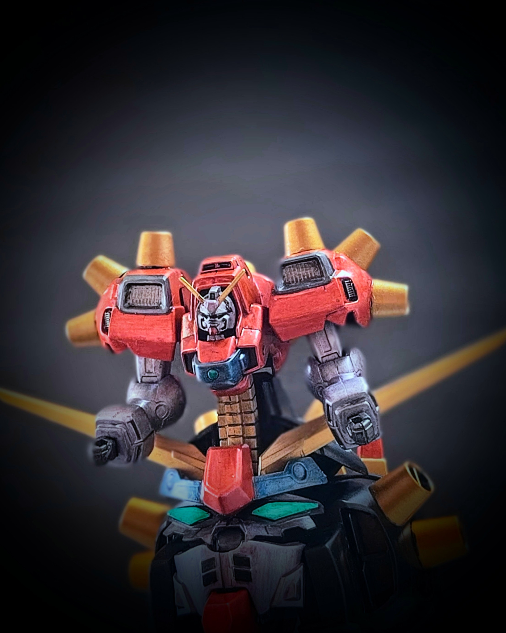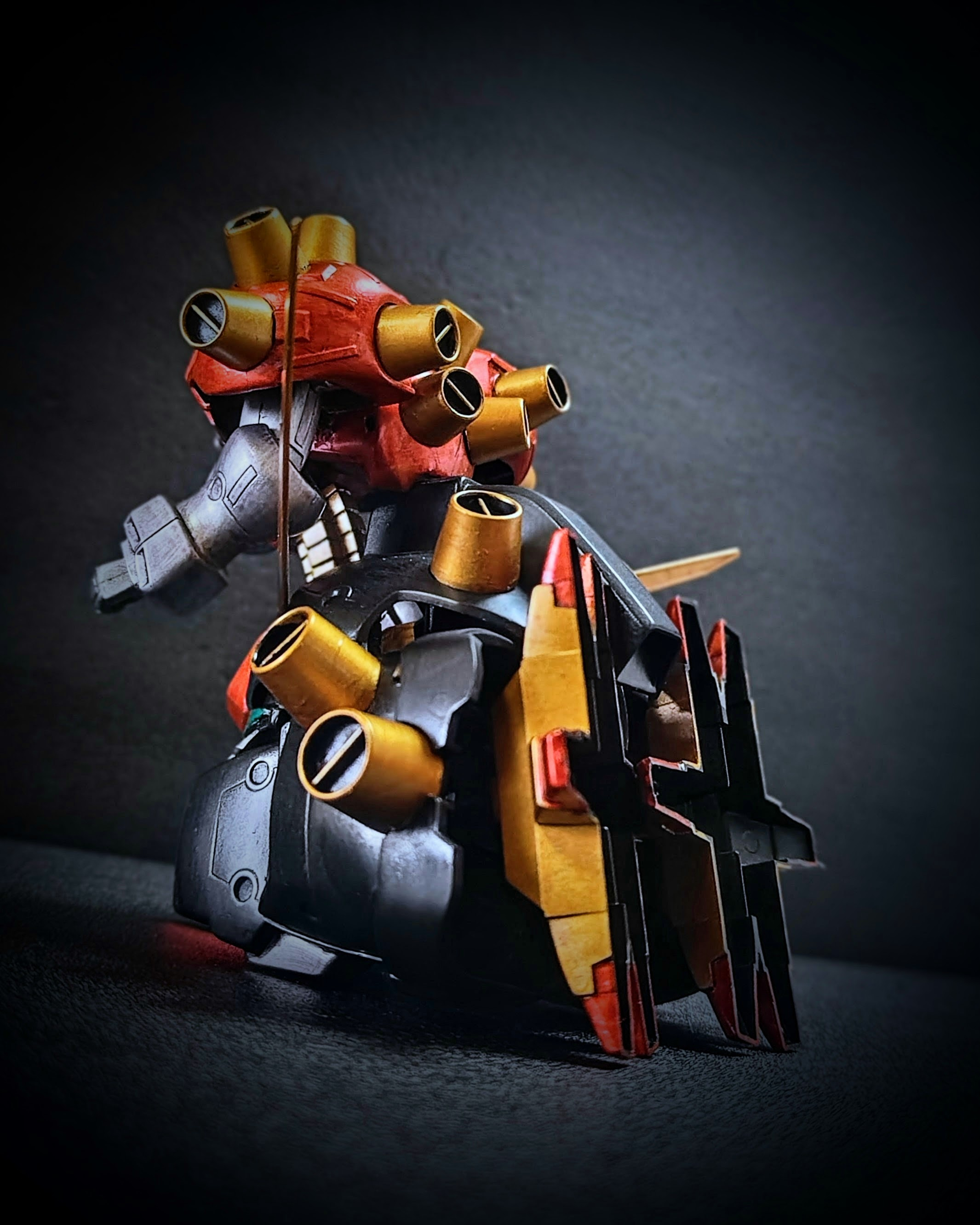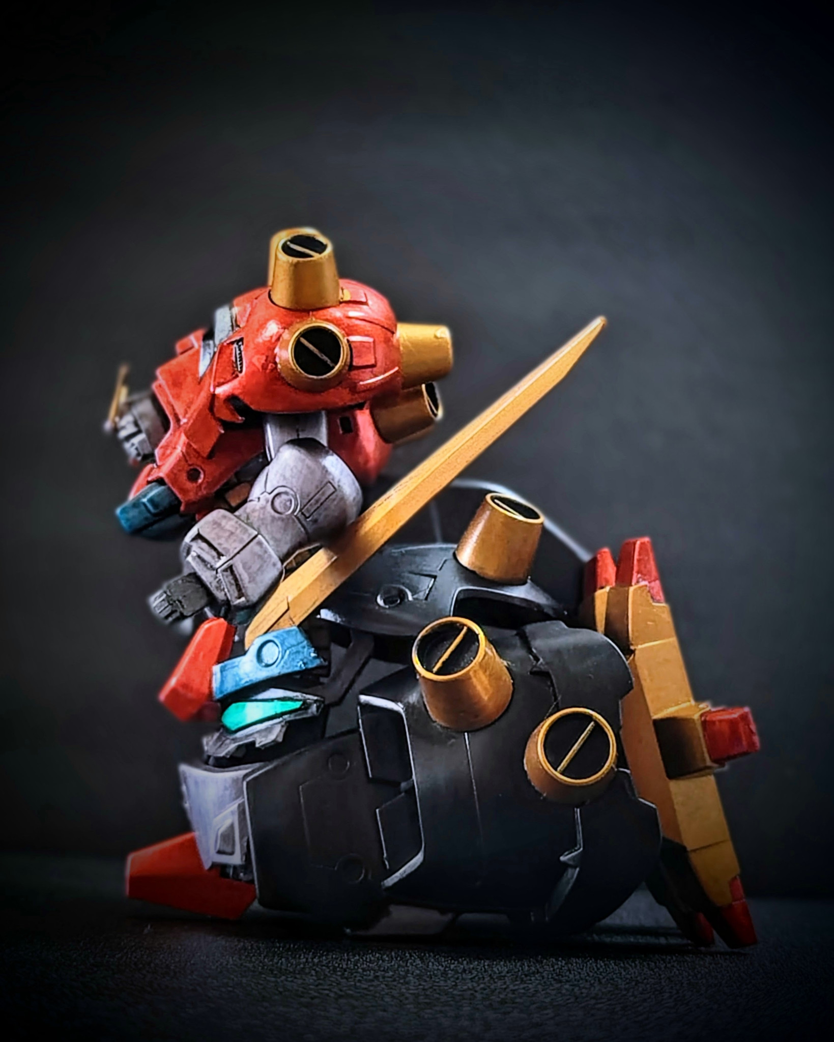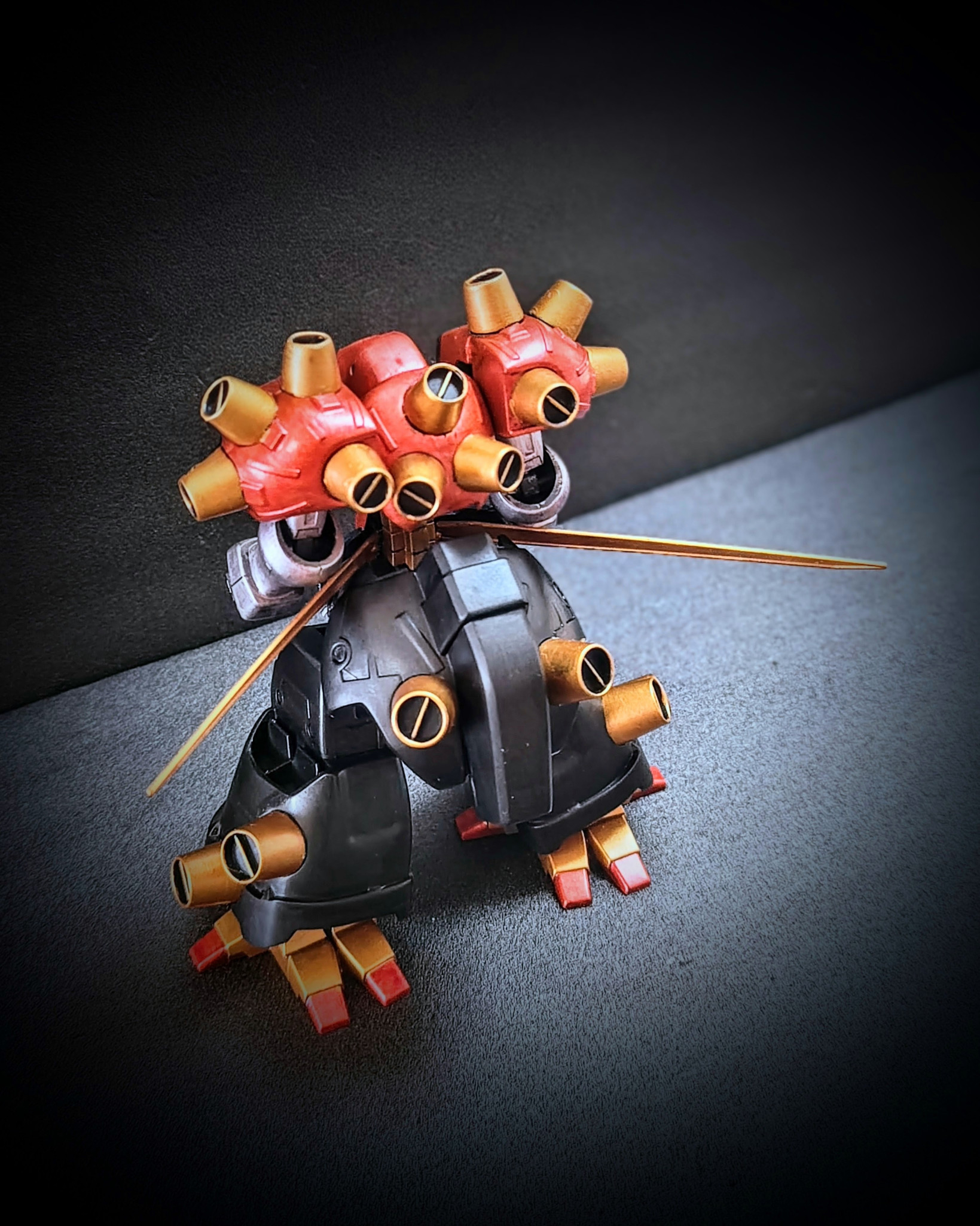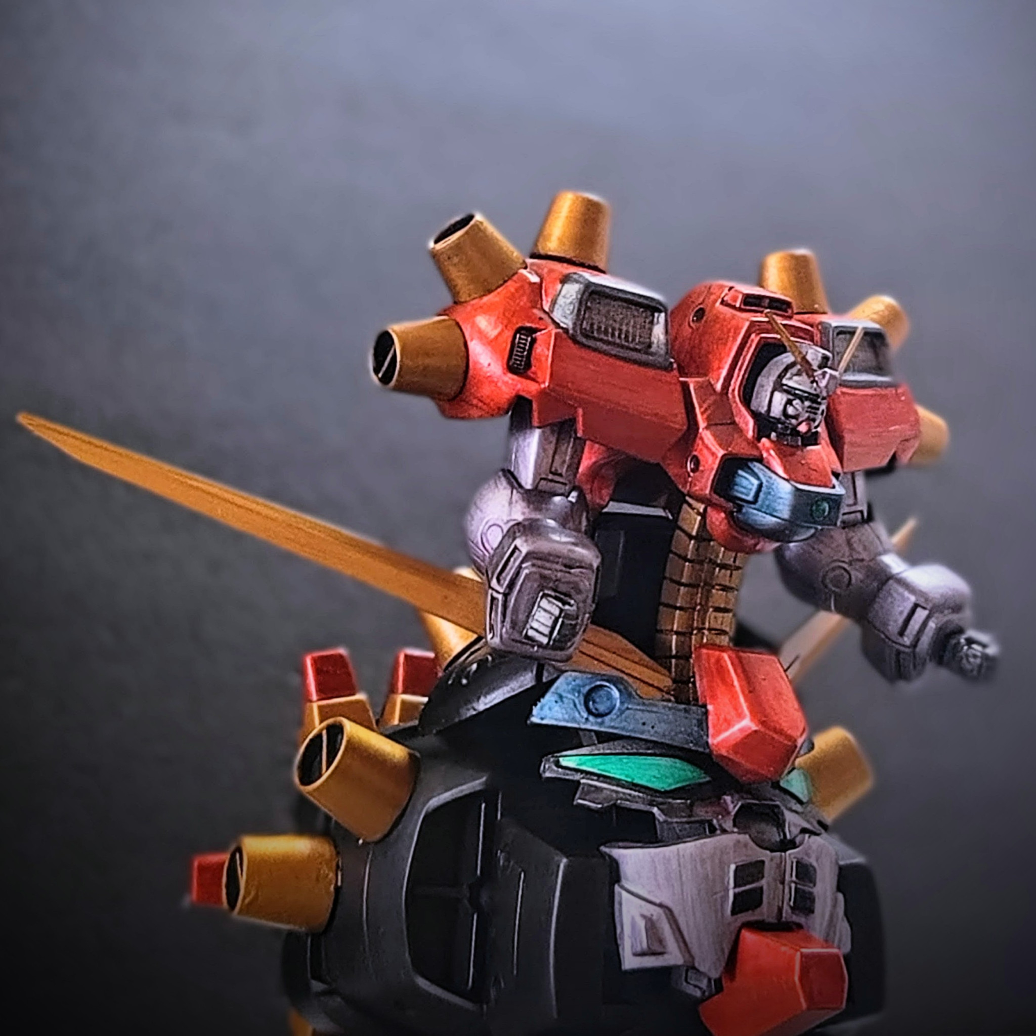 ガンダムベースでたまたまクリアカラーのキットを見かけて、なんちゃってメカニカルコア風で仕上げようと思って購入。裏からメタリック系で塗ってみたもののそんな雰囲気にならず。また、組んでいて合わせ目もがっつりで色々と気になったので普通にパテ使って合わせ目を消したりしたりし、全塗装して仕上げたという次第です…