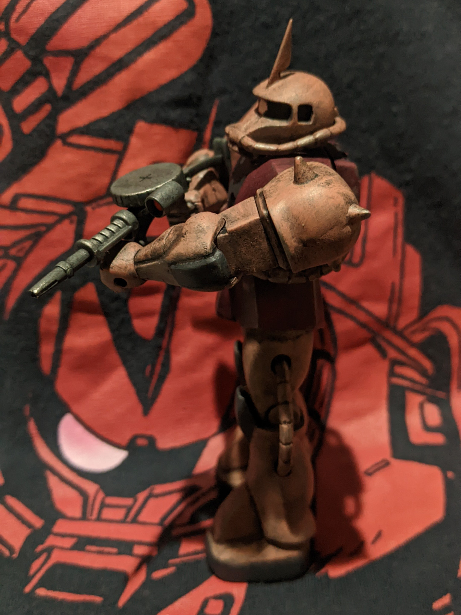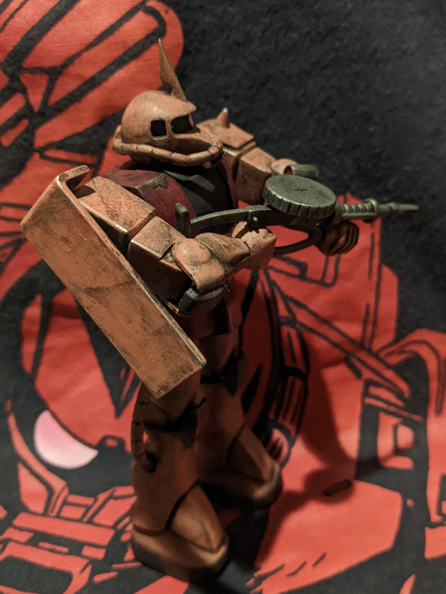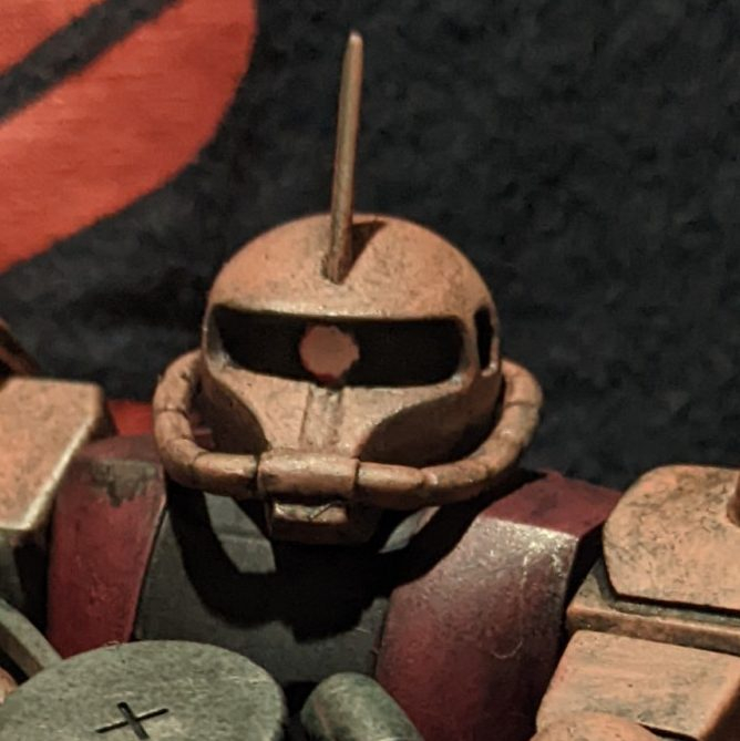 機動戦士ガンダムでシャアザクは敵の攻撃をくらった場面をみた記憶が無いので、攻撃によるダメージは付けませんでしたが、シャアも苦労人…旧ザクやザクで幾度も戦場をくぐり抜けて来た感を出したくてウェザリングしました。