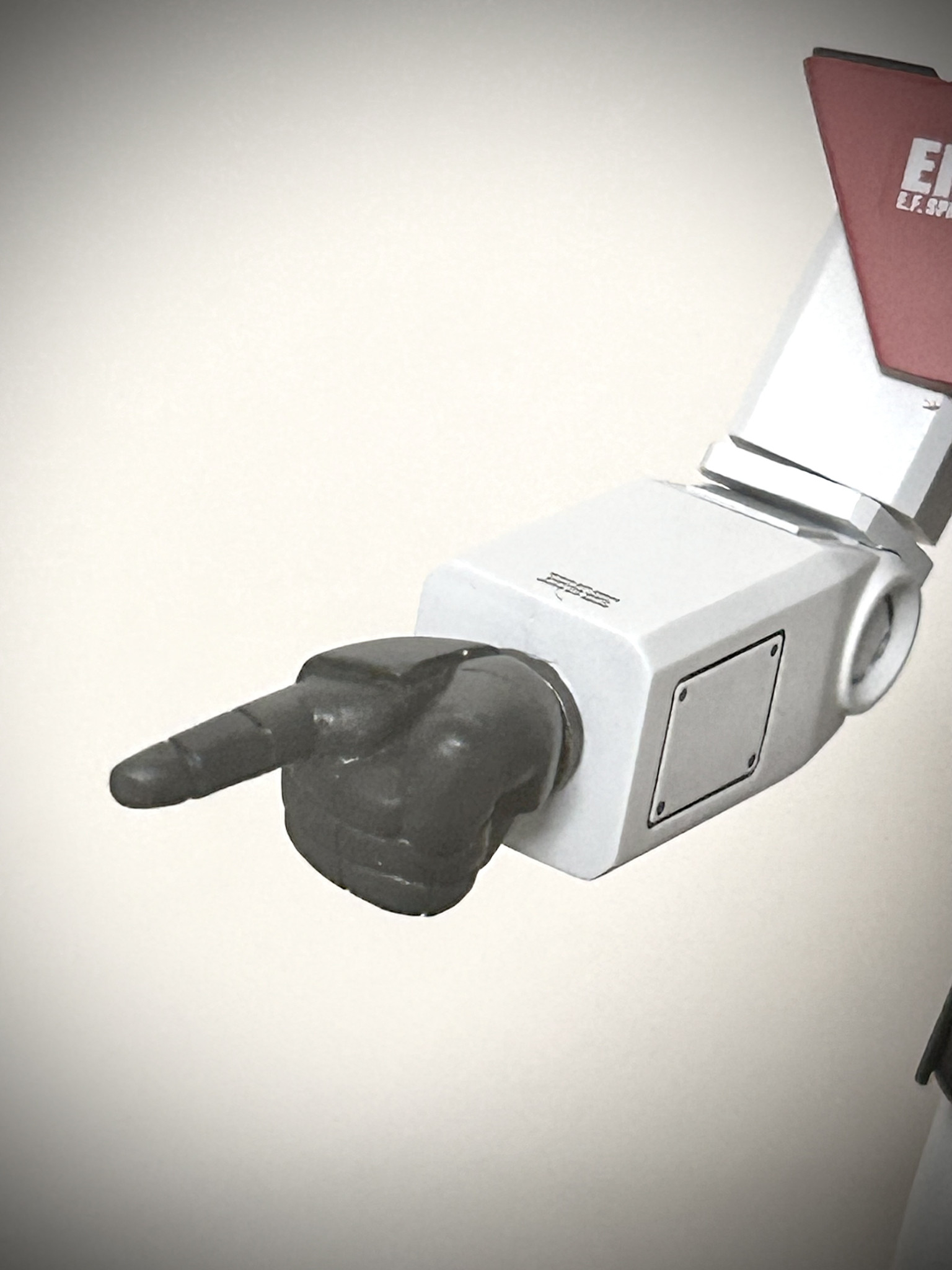 付属のハンドパーツを改造して箱絵のポーズを再現しました。人差し指はプラ棒から削り出ししました。