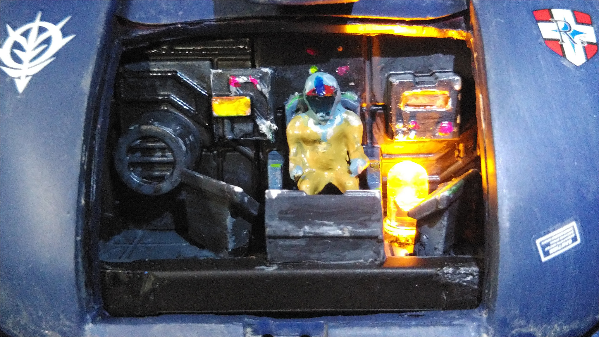 コックピットとランバラルを作成。コックピットは100均山田科学さんの「指令室」を加工してそれっぽく作成。ランバラルはPGガンダムについてくるアムロをレジンで複製の後、レジン追加で体格を良くしてそれっぽく作成しました。