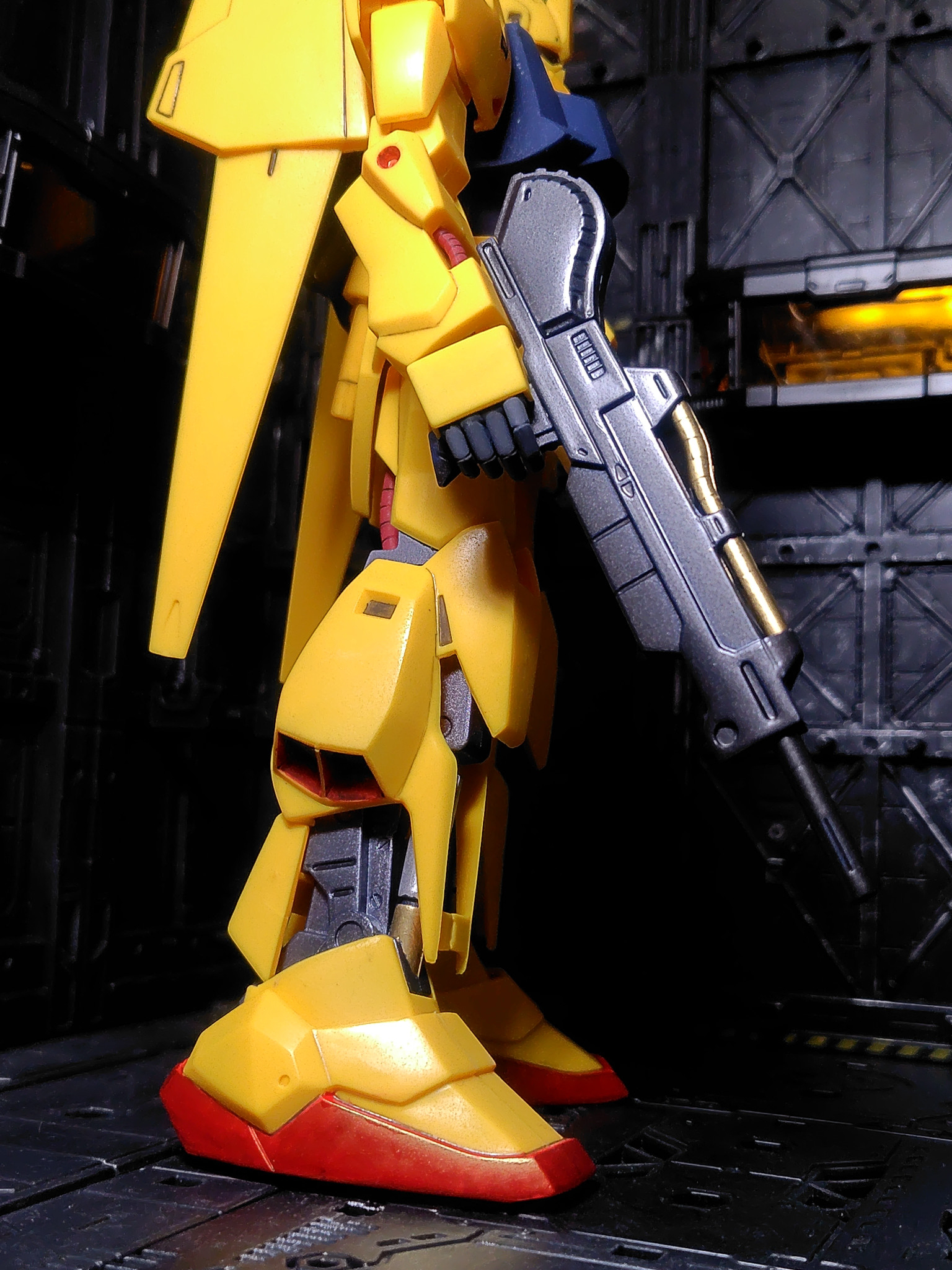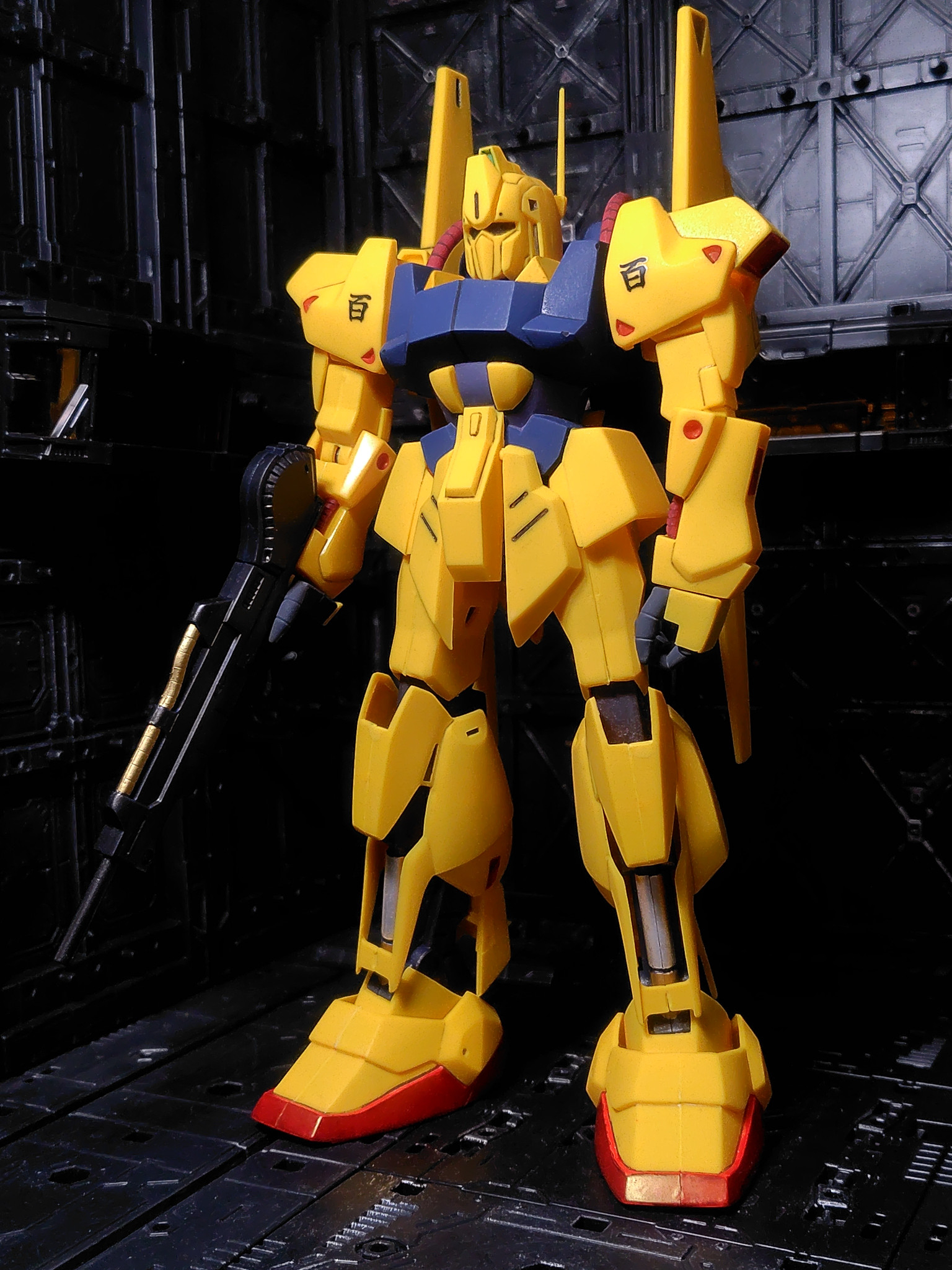 昔の黄色い百式が好きなのでイエロー部分は成形色のまま。襟だけはガンマカイエローで塗装。腹部をメカグレー、ハンドをファントムグレー、ライフルは黒鉄色とゴールド、足のフレーム部はガンメタル、シリンダー部はゴールドとシャインシルバー、各部の赤はリアルタッチマーカーのレッド、頭部のセンサーはメタリックグリーン。