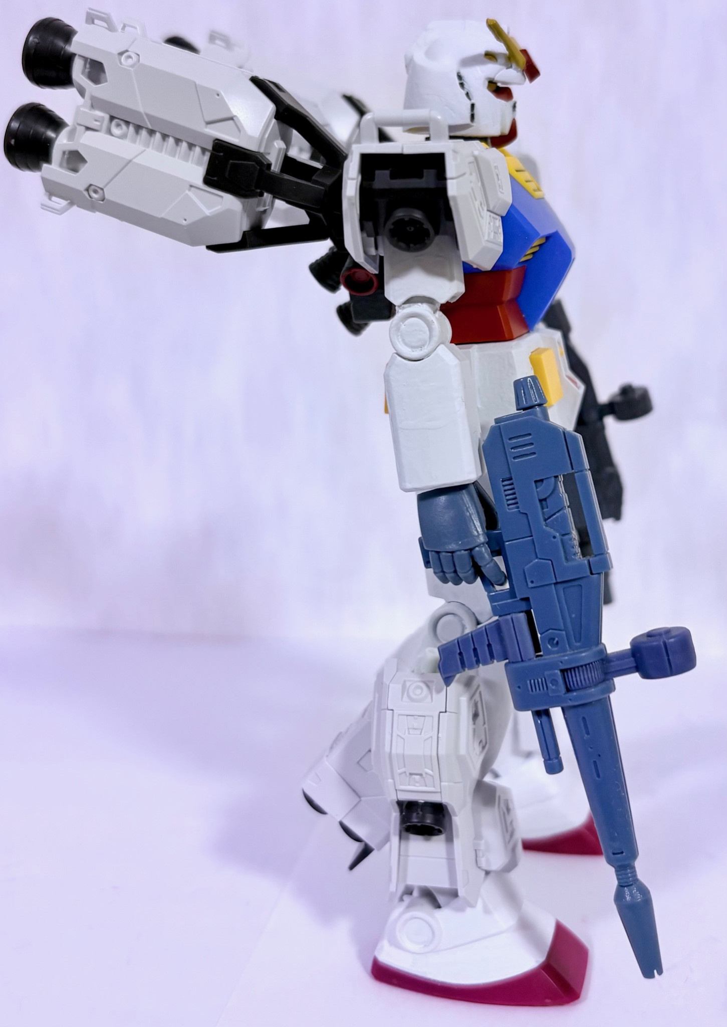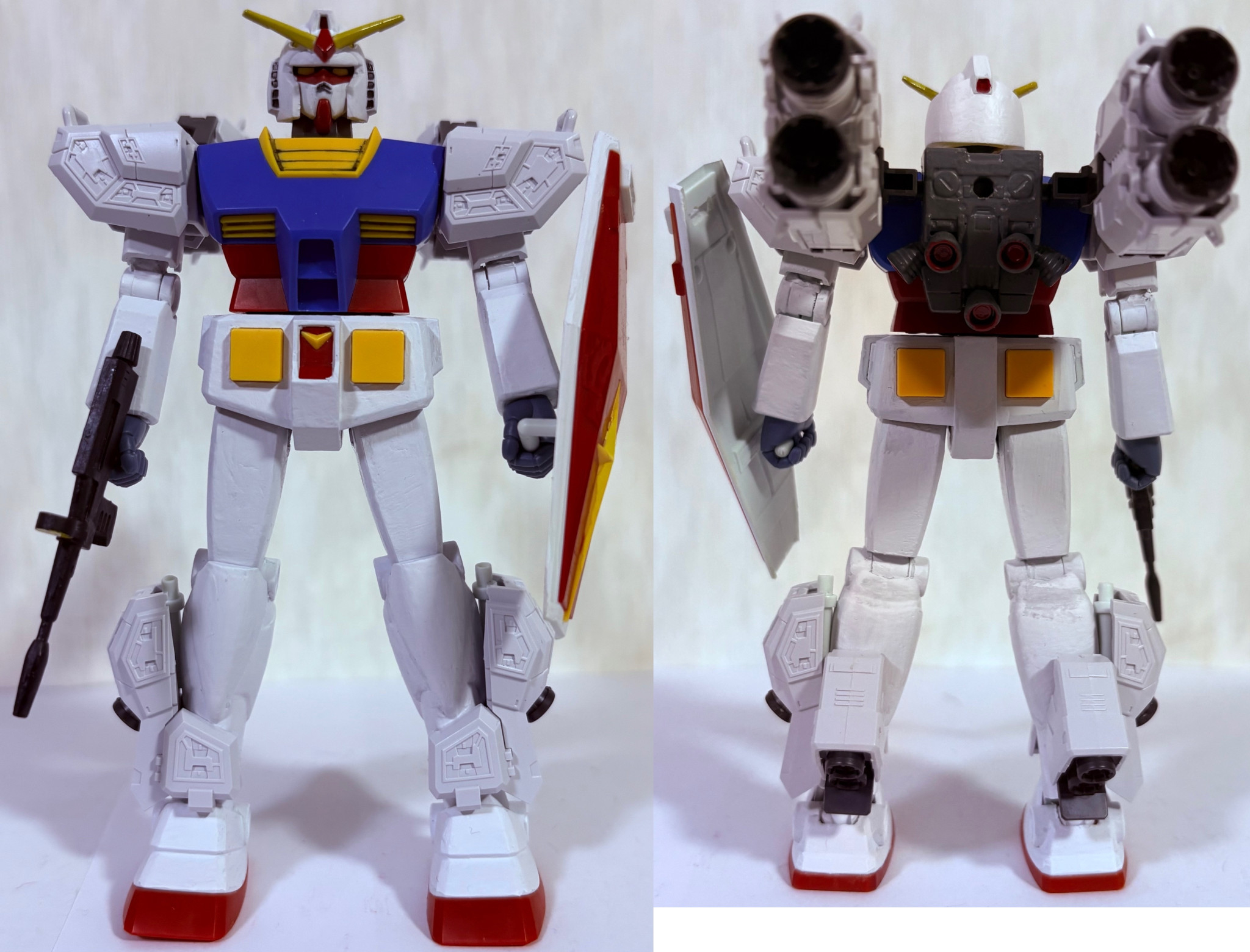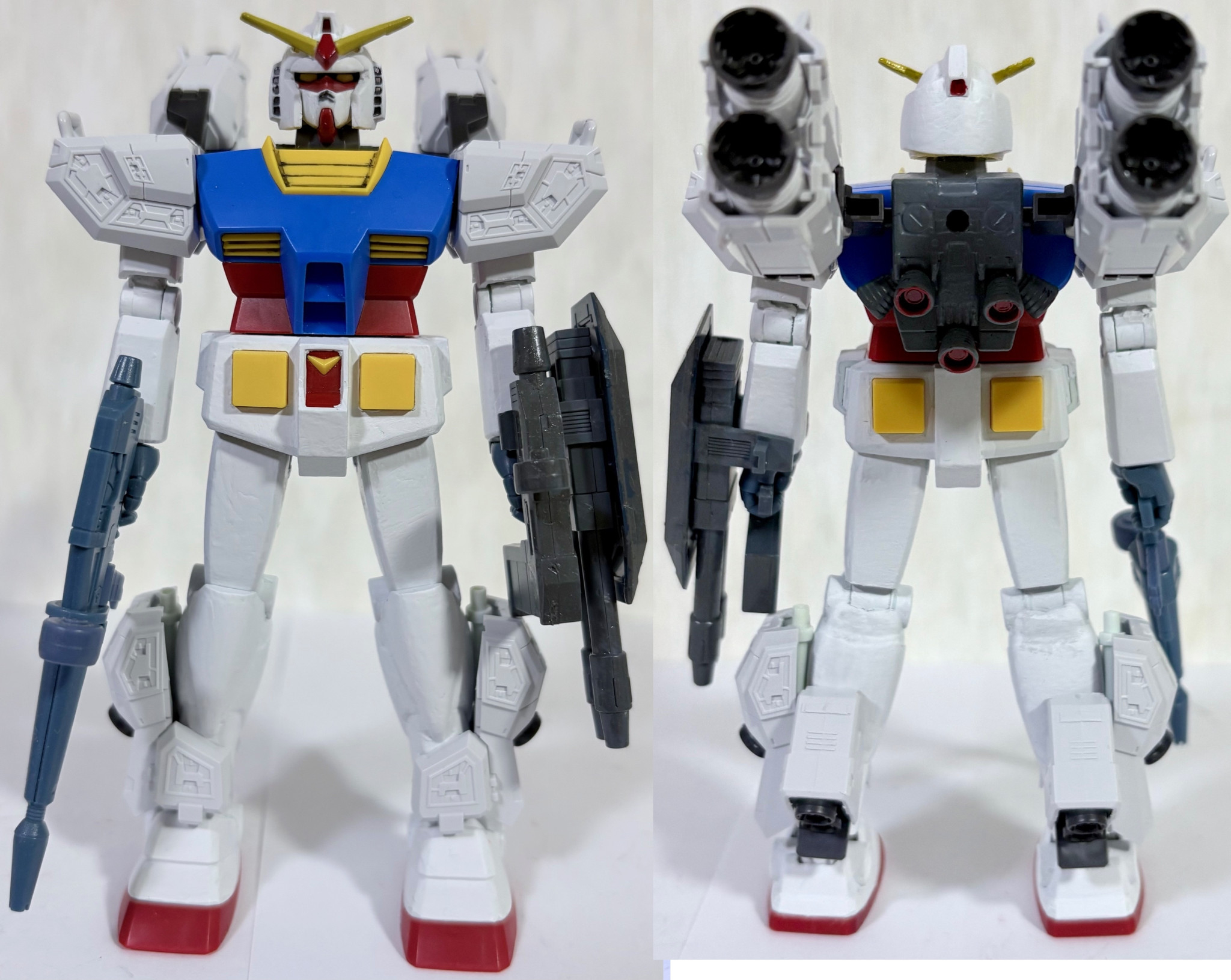 フロントビューとリアビュー。肩アーマーと脚部のスラスターは万博ガンダム、バックパックはオリジンGM、バーニアはグラスフェザーのモノで構成されており、二連装ビームライフルはジャンクパーツ、ビームライフルはロボット魂から流用。