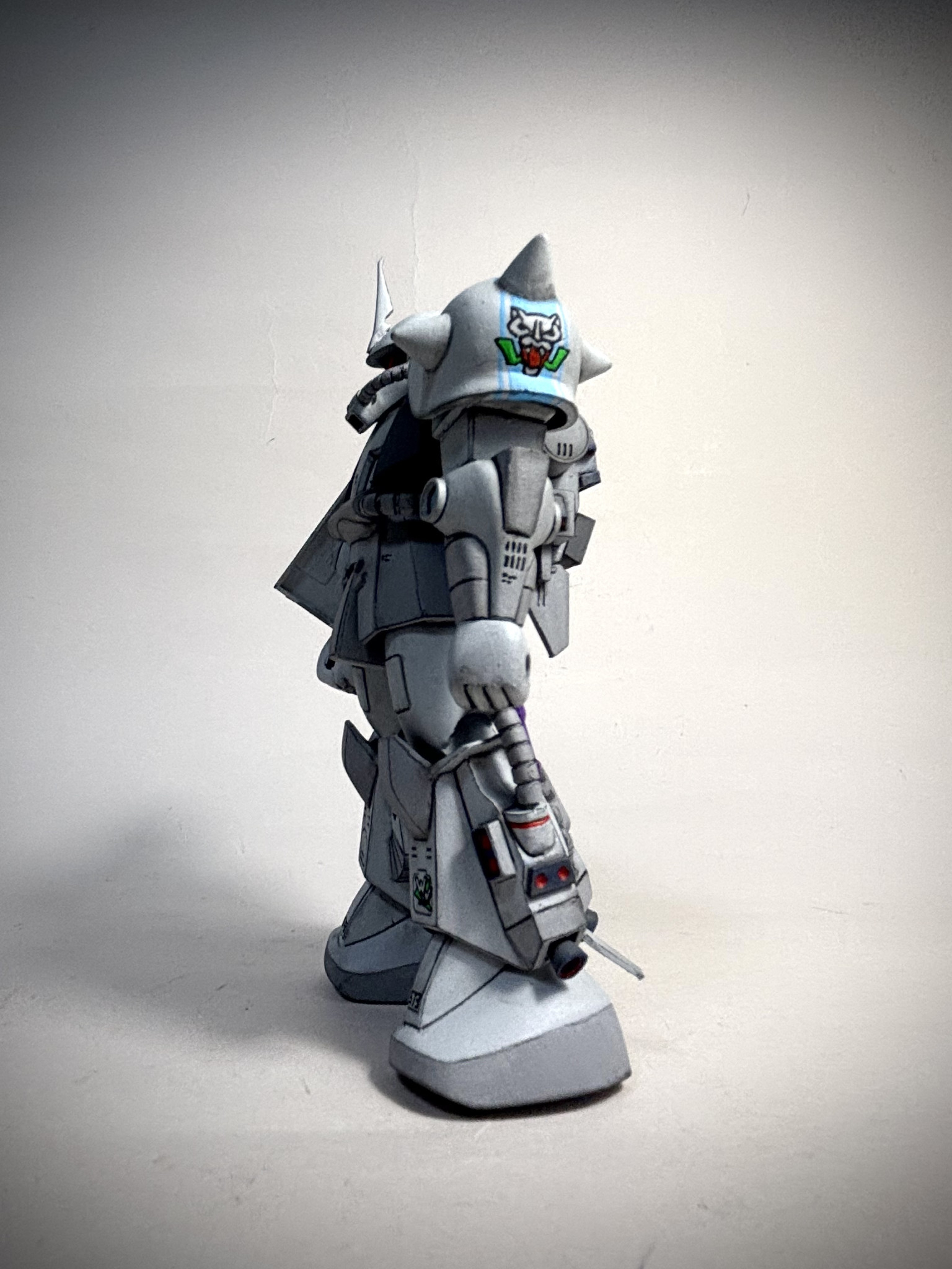 キットについているデカールのうち、シン・マツナガ大尉機用のものはこの横向きの白狼のみ。それ以外はフリーハンドで書き込みました。デカールはもうワンサイズ大きいとバランス取れたのですが笑