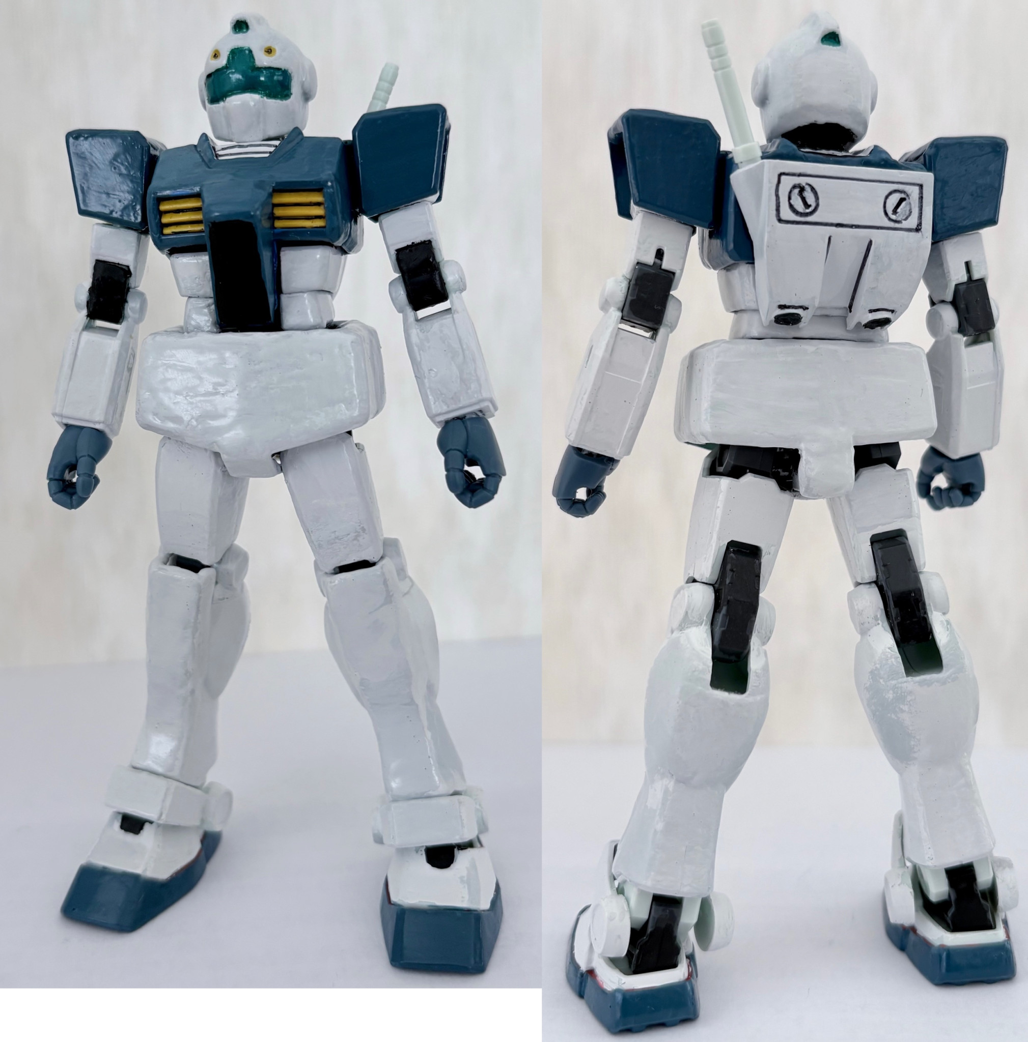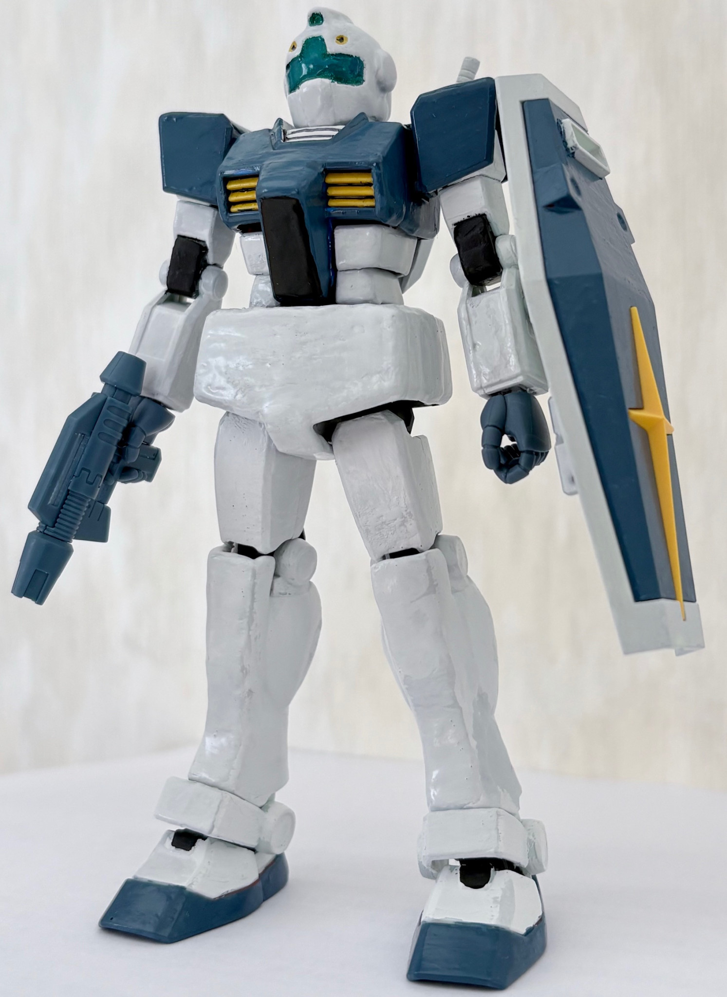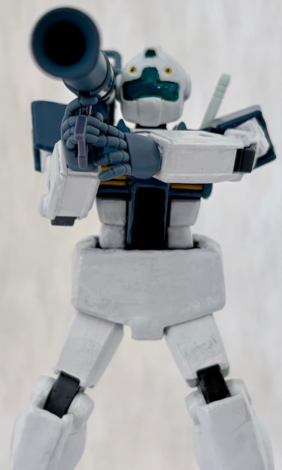 カラーリングはサンダーボルト版のGMを参考にミディアムブルー、艶消しホワイト、関節につや消しブラック、イエロー、頭部のバイザーはメタリックグリーンとクリアブルーを混ぜて塗った。