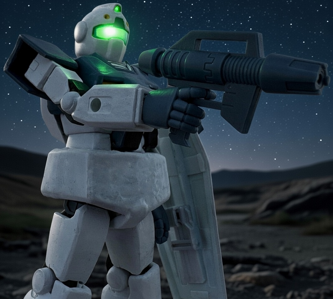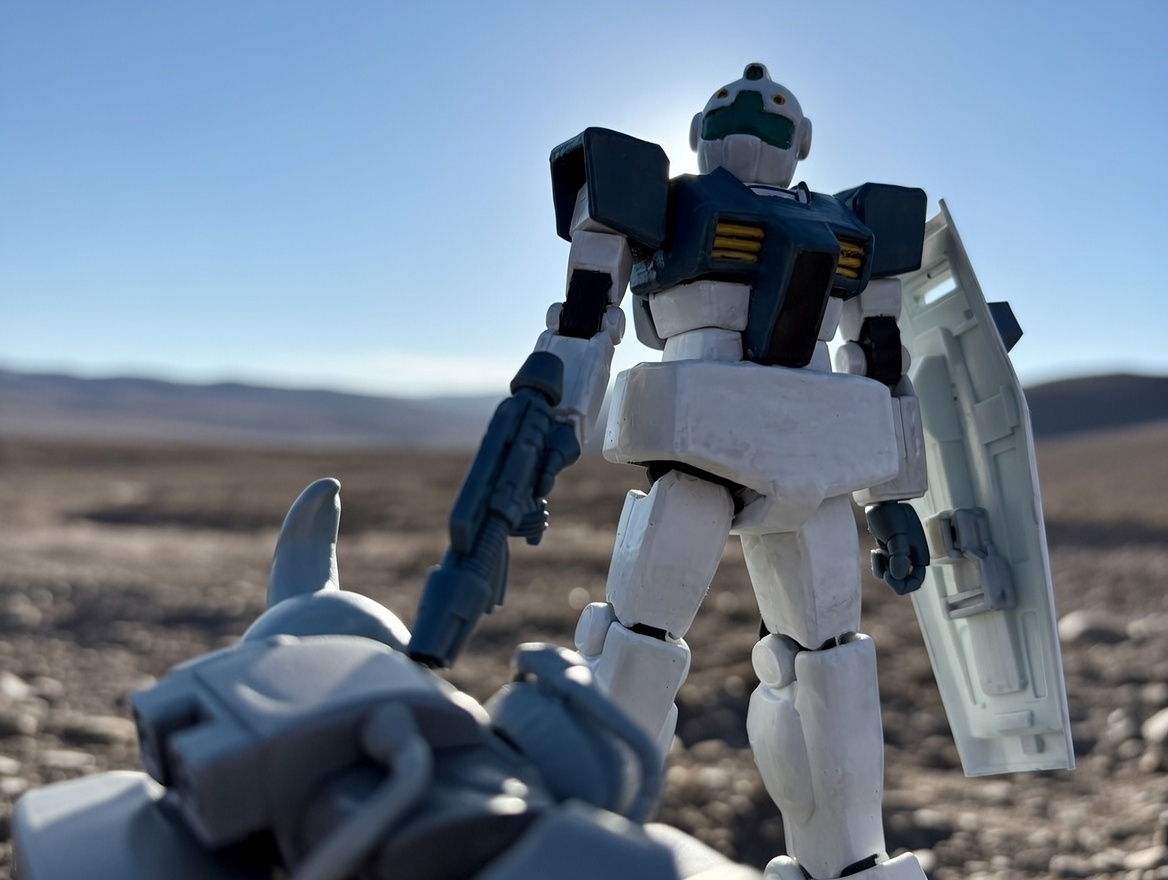 グフを仕留めたGM。逆光の演出は西部劇風に。