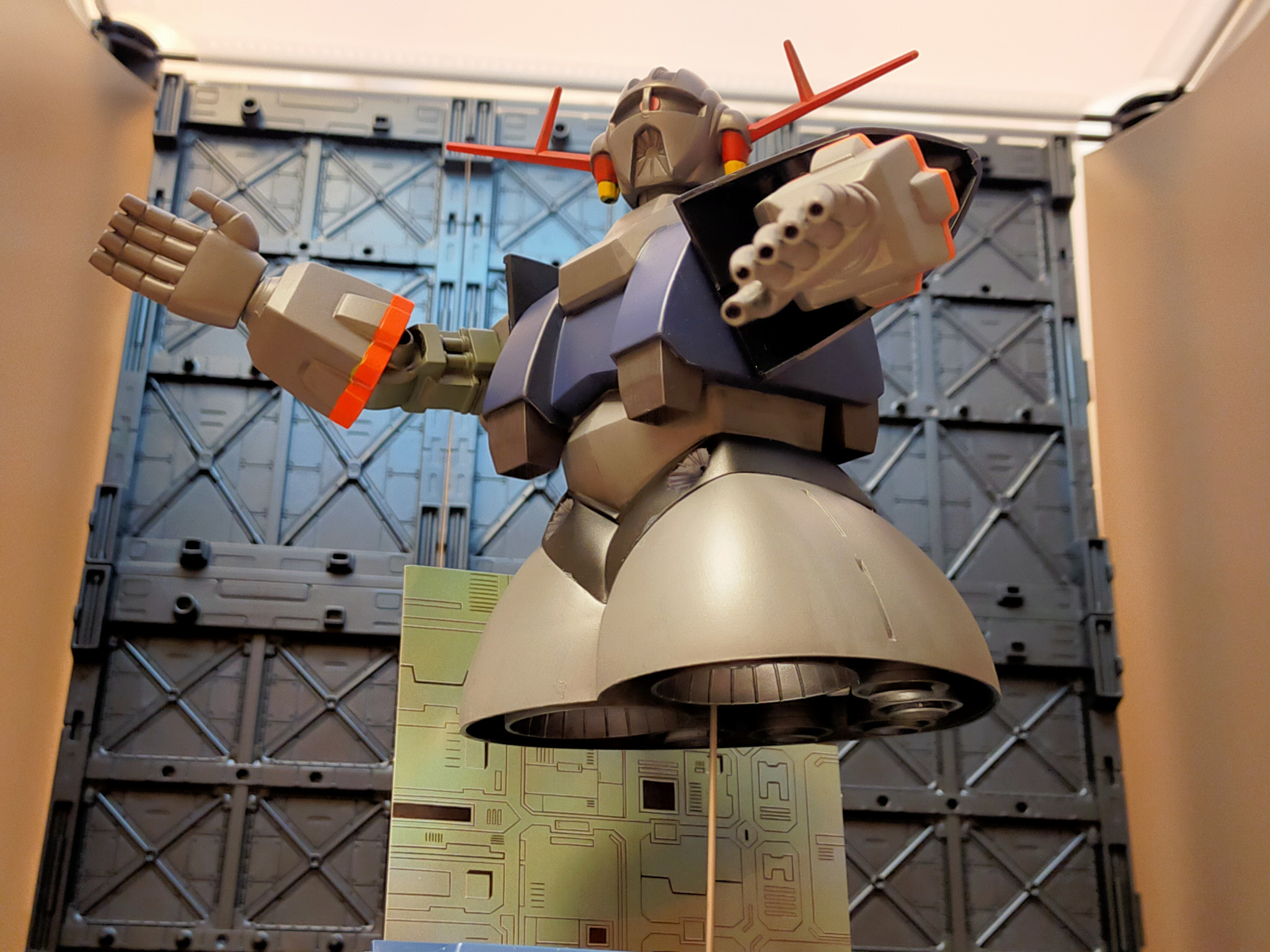 肘は伸縮をオミットして、ディスプレイばえするように、角度を付けて固定しました。首にはジョイント入れて、多少動きます。ブンドドはしないので、立ち姿優先です。頭と体、手のひらの大きさの割合が旧キットだなぁ、と感じます。
