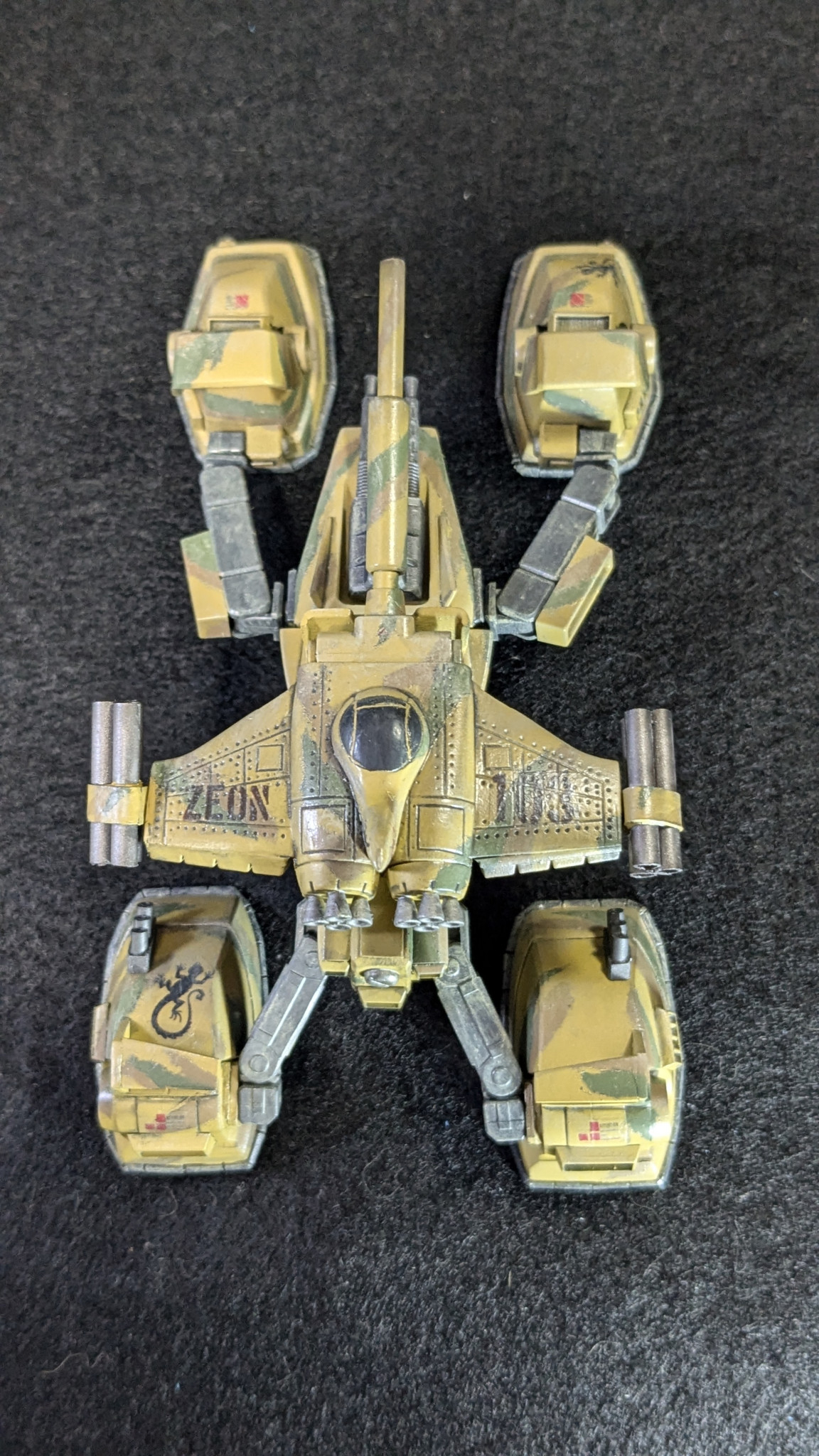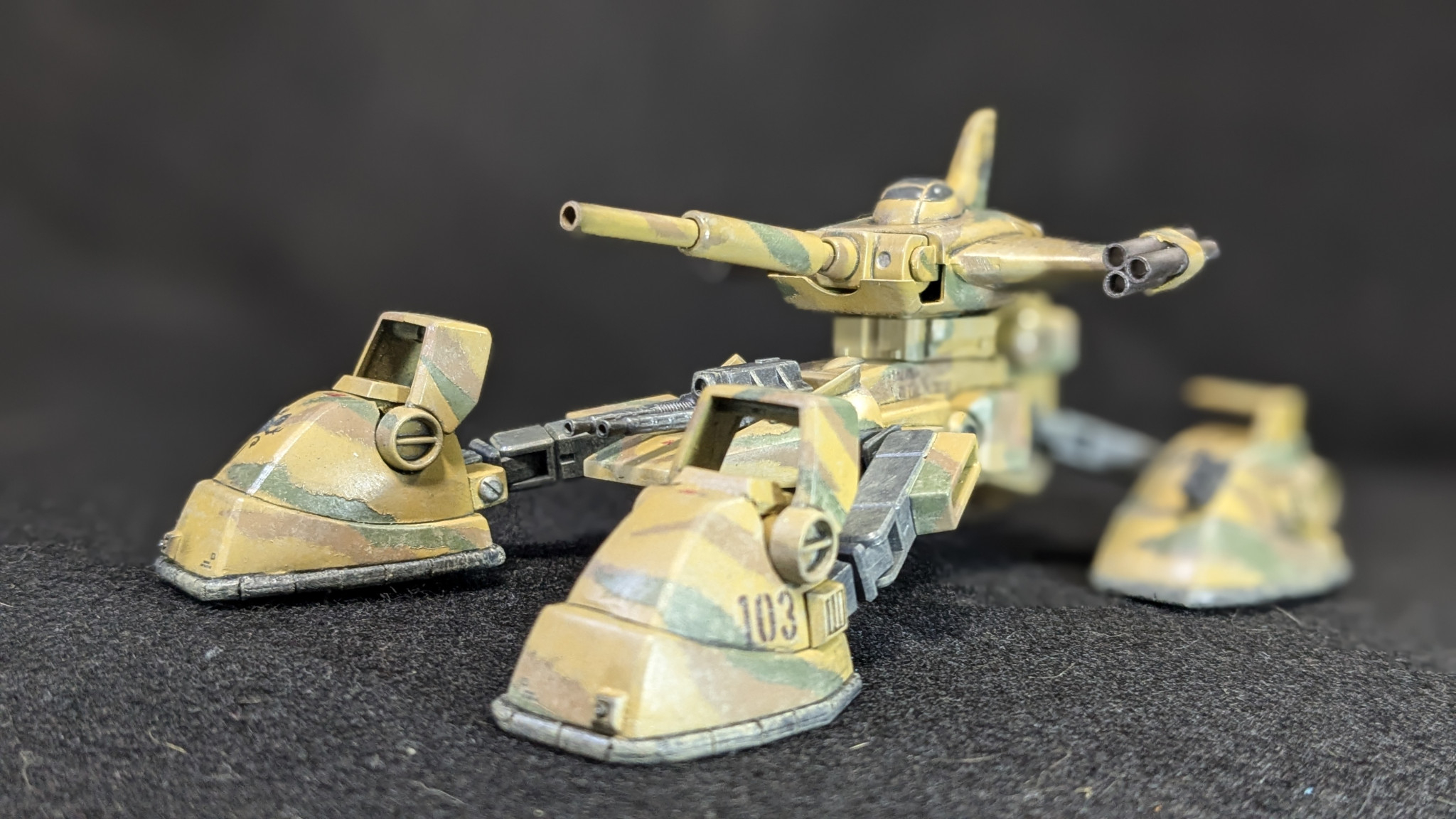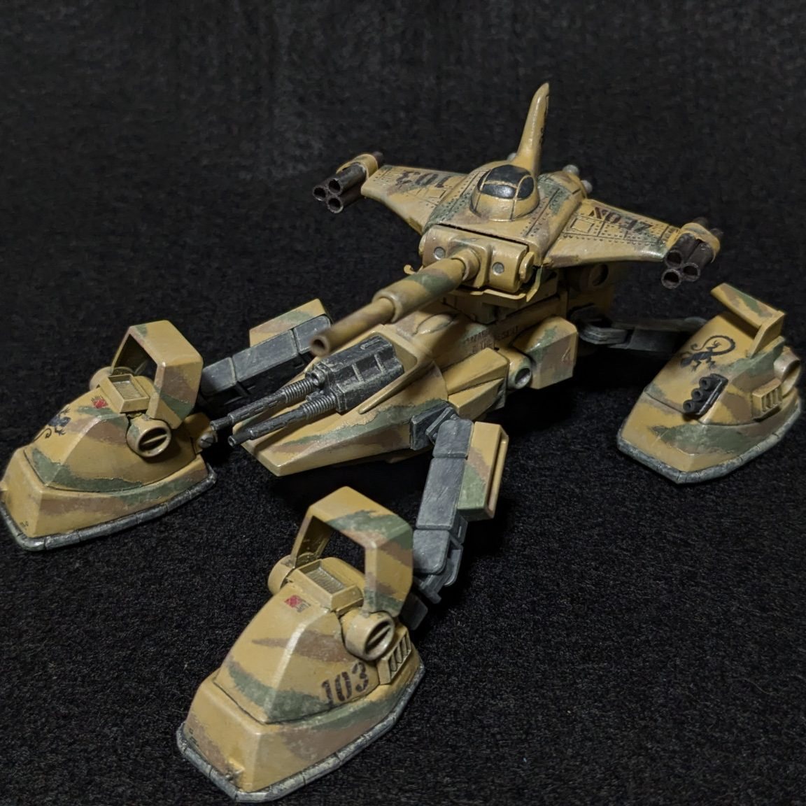 塗装は以前作った陸戦マラサイのグリーン(№70に№97小さじ一杯、№110少々、隠し味に№333。と言った感じです。)に№310ブラウンに№39ダークイエローの3色迷彩にしました。スカートは№71ミッドナイトブルーです。