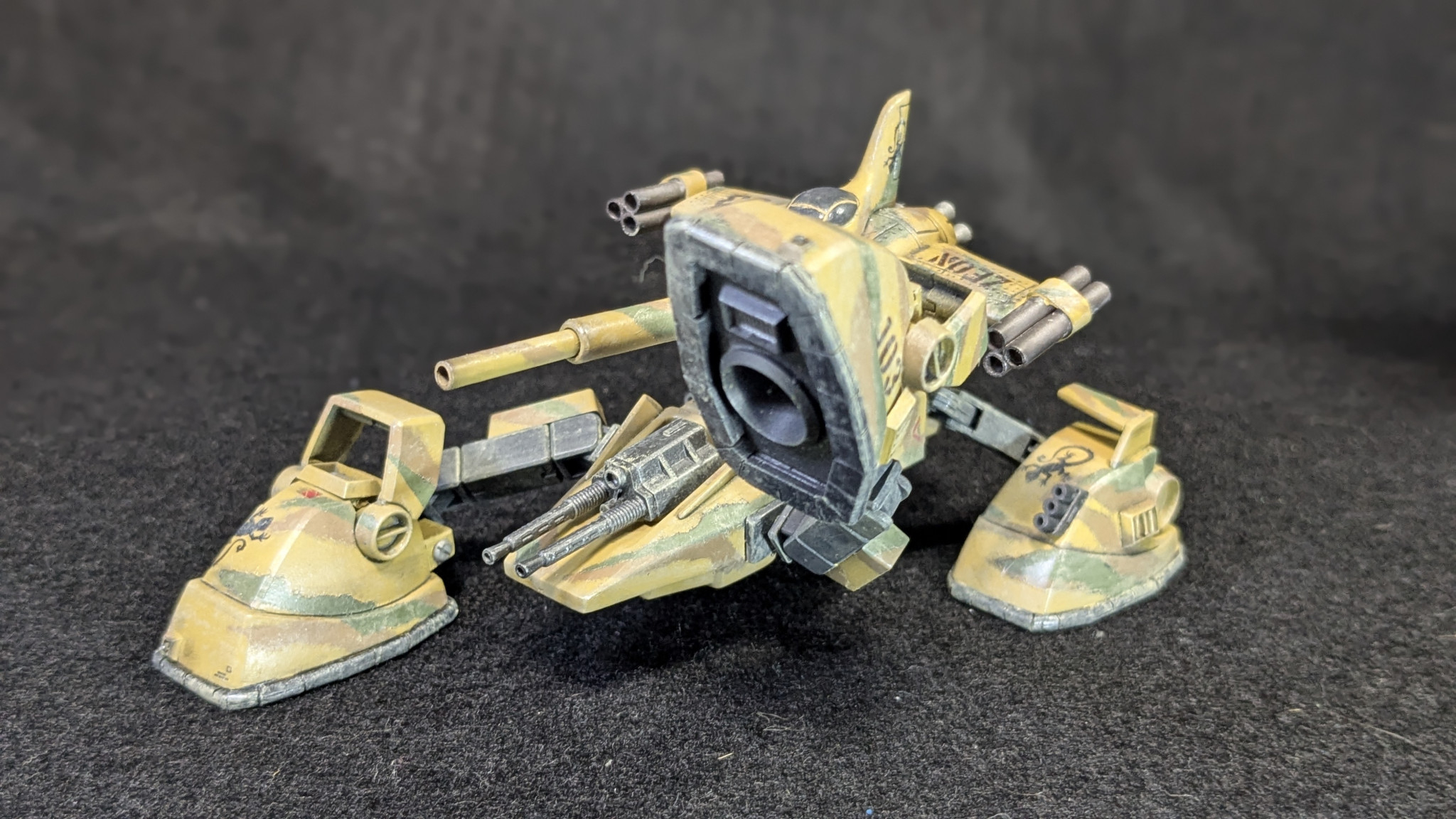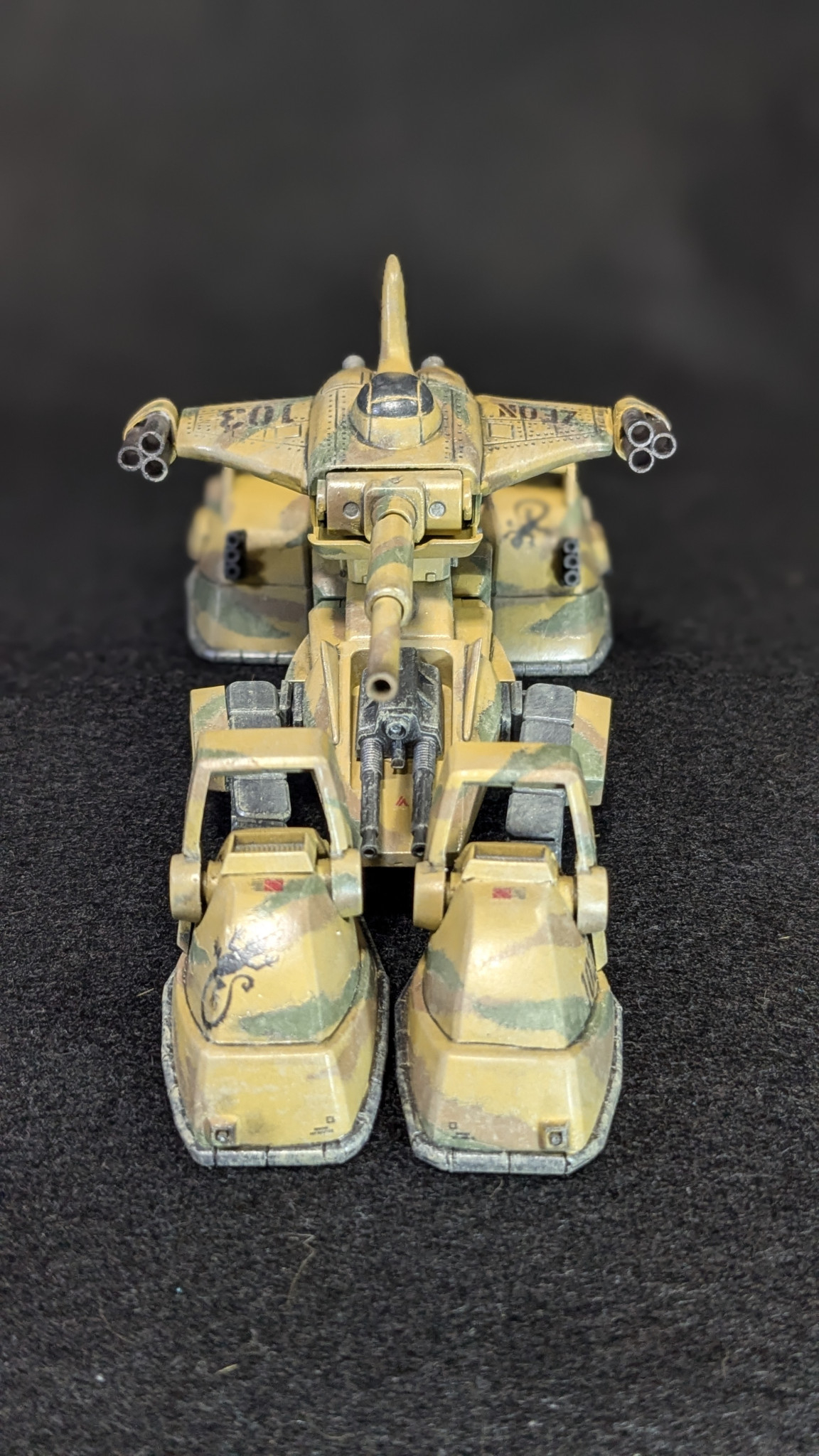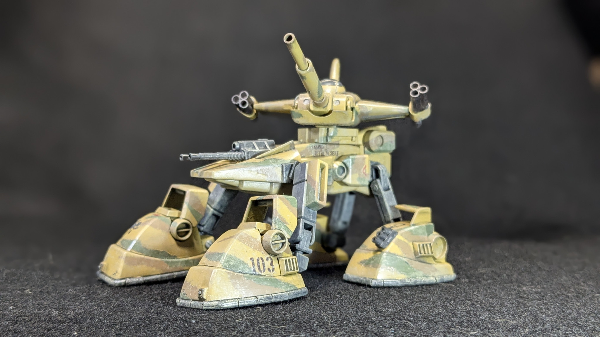 塗装は以前作った陸戦マラサイのグリーン(№70に№97小さじ一杯、№110少々、隠し味に№333。と言った感じです。)に№310ブラウンに№39ダークイエローの3色迷彩にしました。スカートは№71ミッドナイトブルーです。