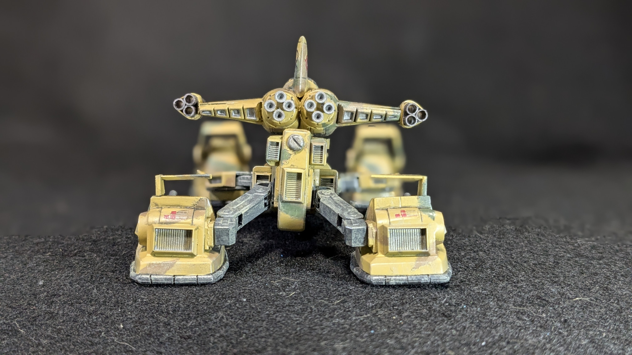 斜め前方にスライド走行をしながらマゼラトップでは回転しなかったターレットを回転させ、マゼラトップの翼端に有るロケットランチャーから全弾6発のロケットが無誘導で飛んでいく。
